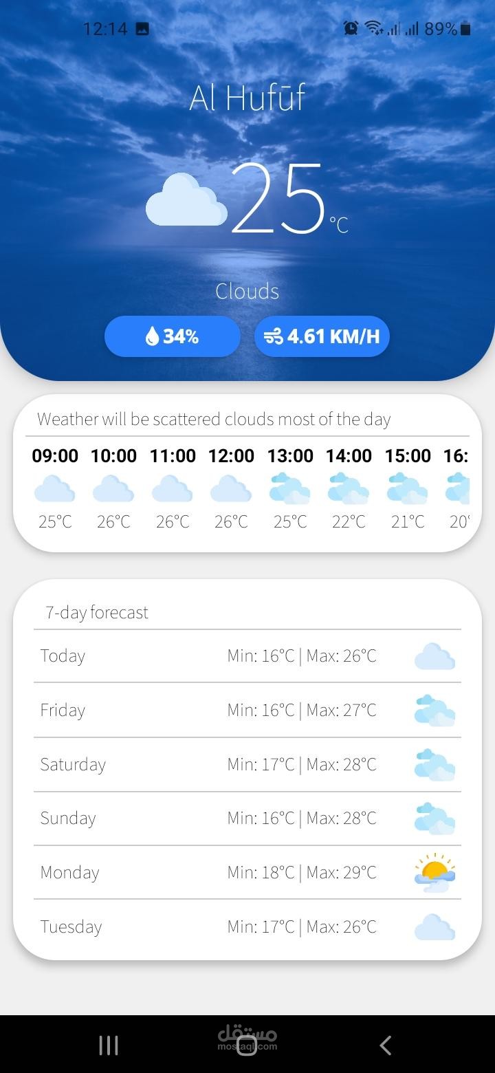 تطبيق لعرض الطقس وتوقعات الطقس في منطقة المستخدم.