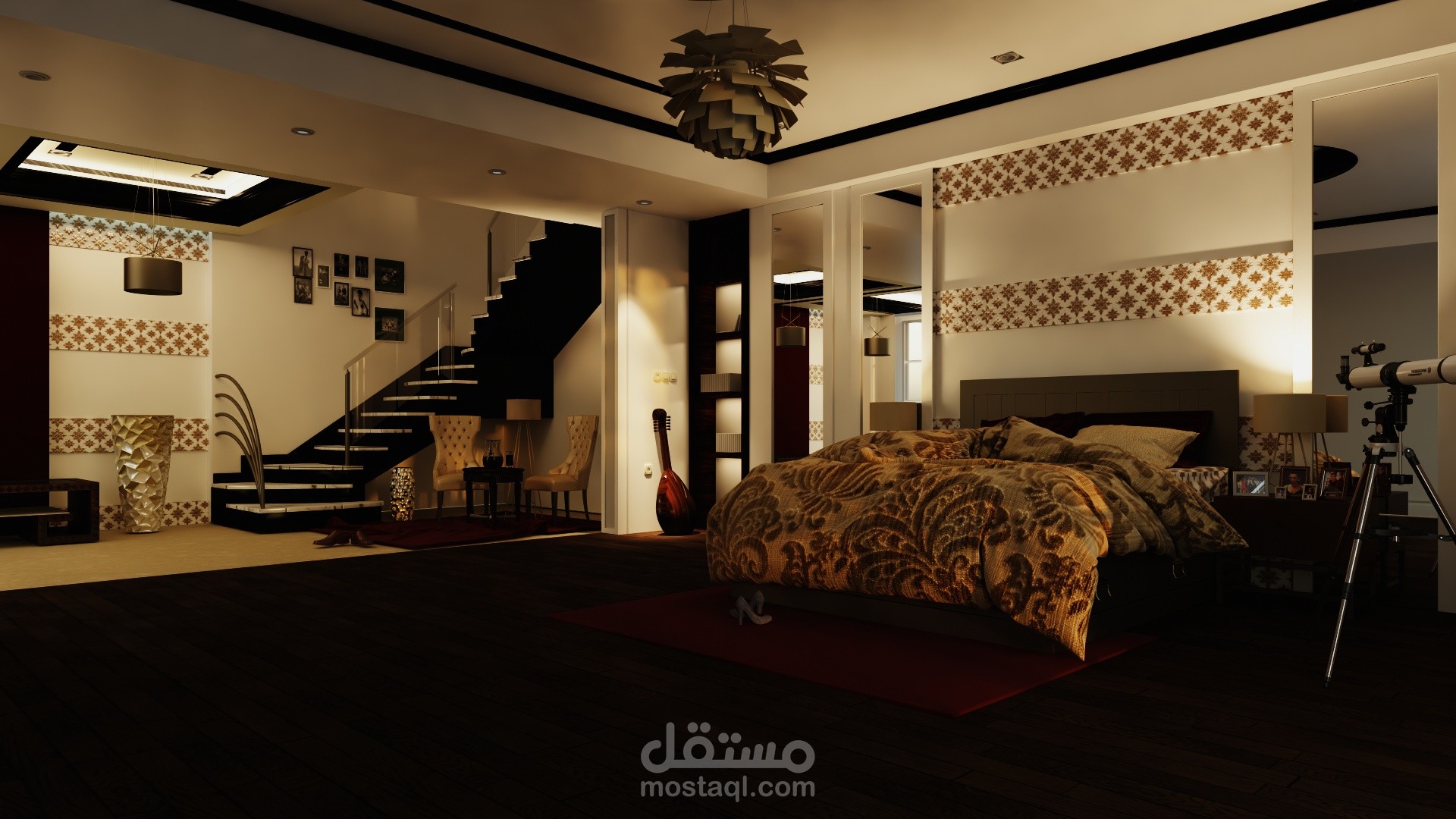 غرفة نوم فاخرة، عملت على إكساءها وإظهار المحتوى ومواد الاكساء باستخدام برنامج 3Ds Max و الـ Vray