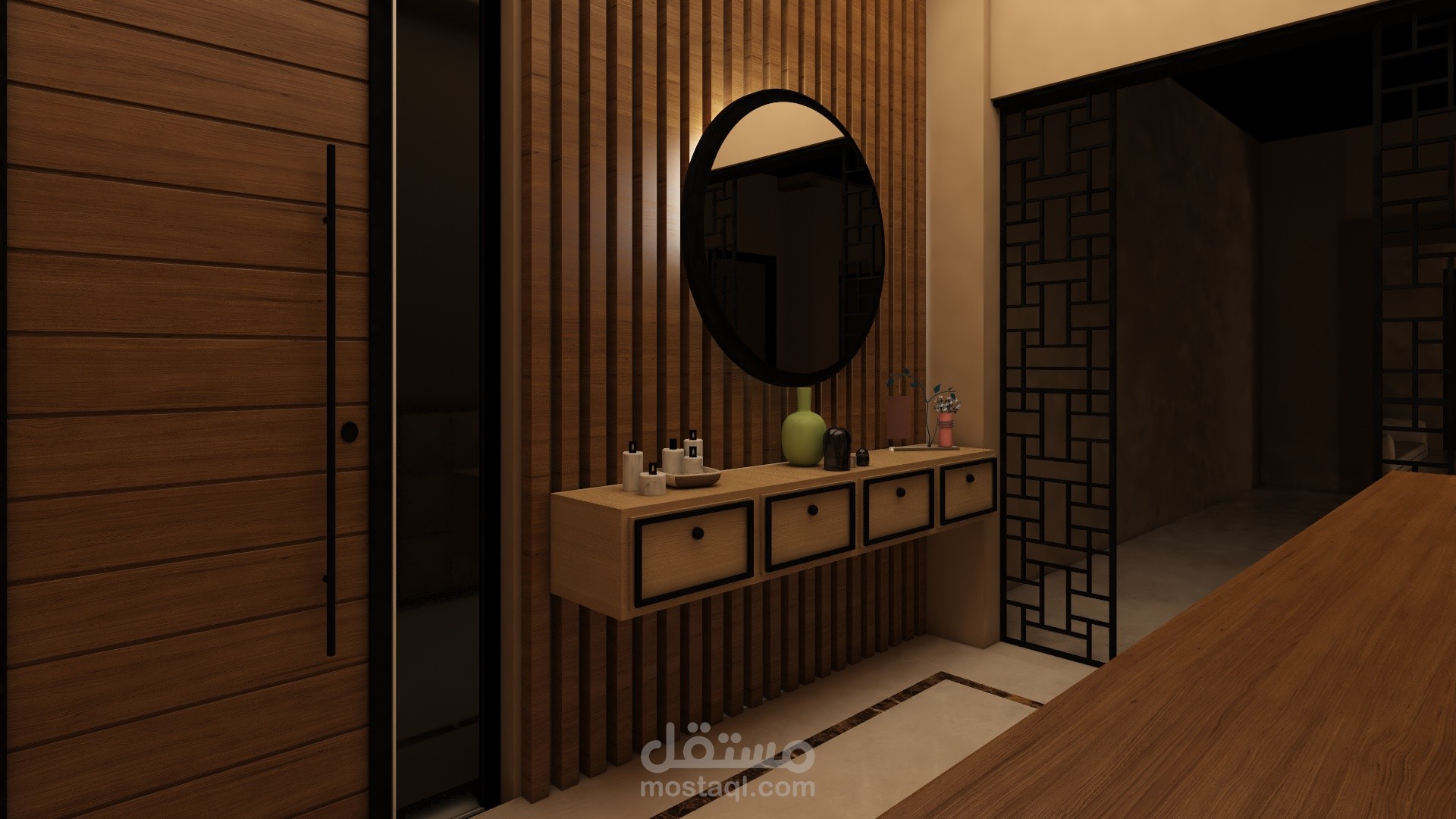 إعادة تصميم مدخل خاص بالشقة يتناسب مع باقي الديكور ومواد الاكساء الموجودة مسبقاً