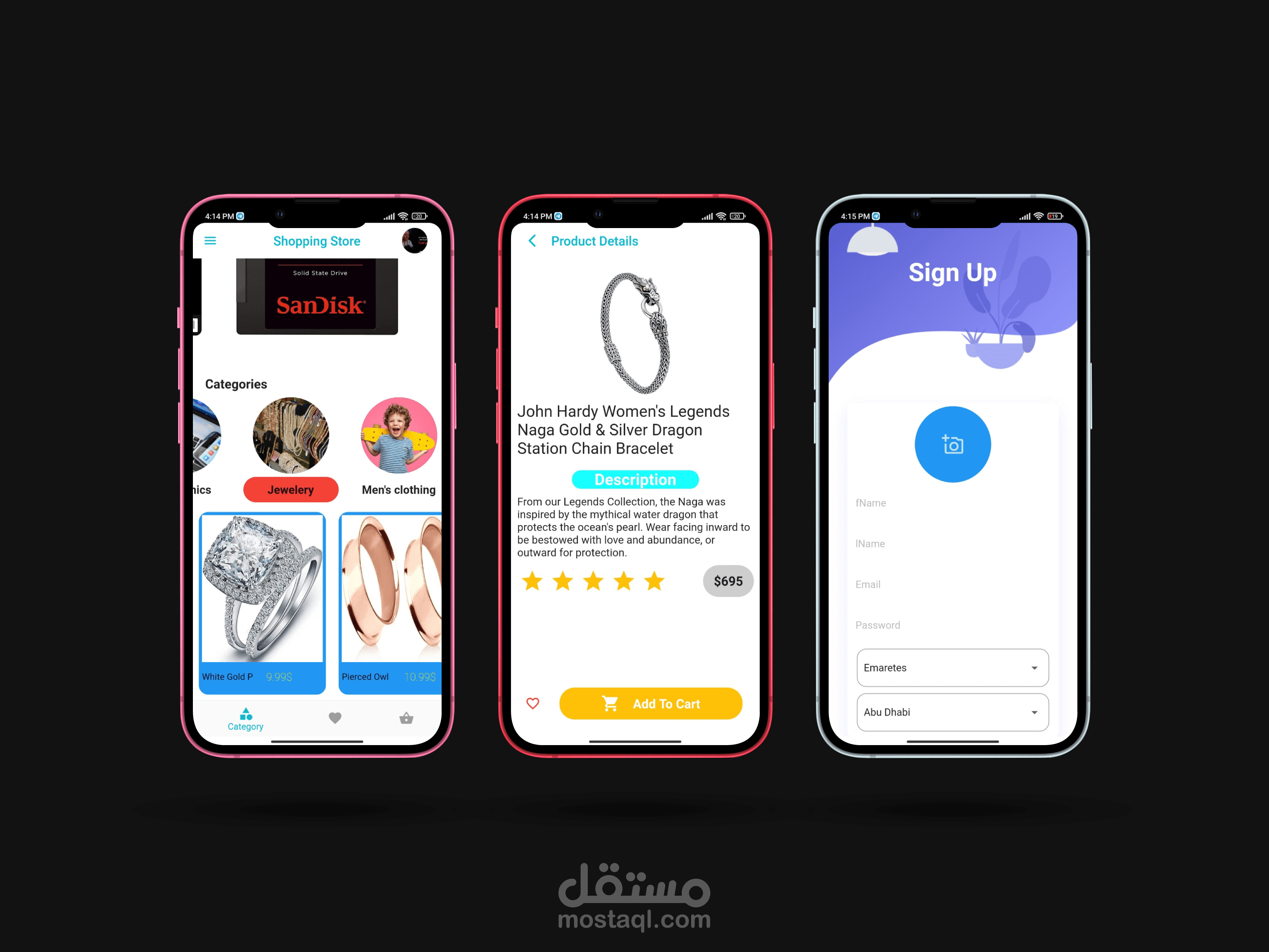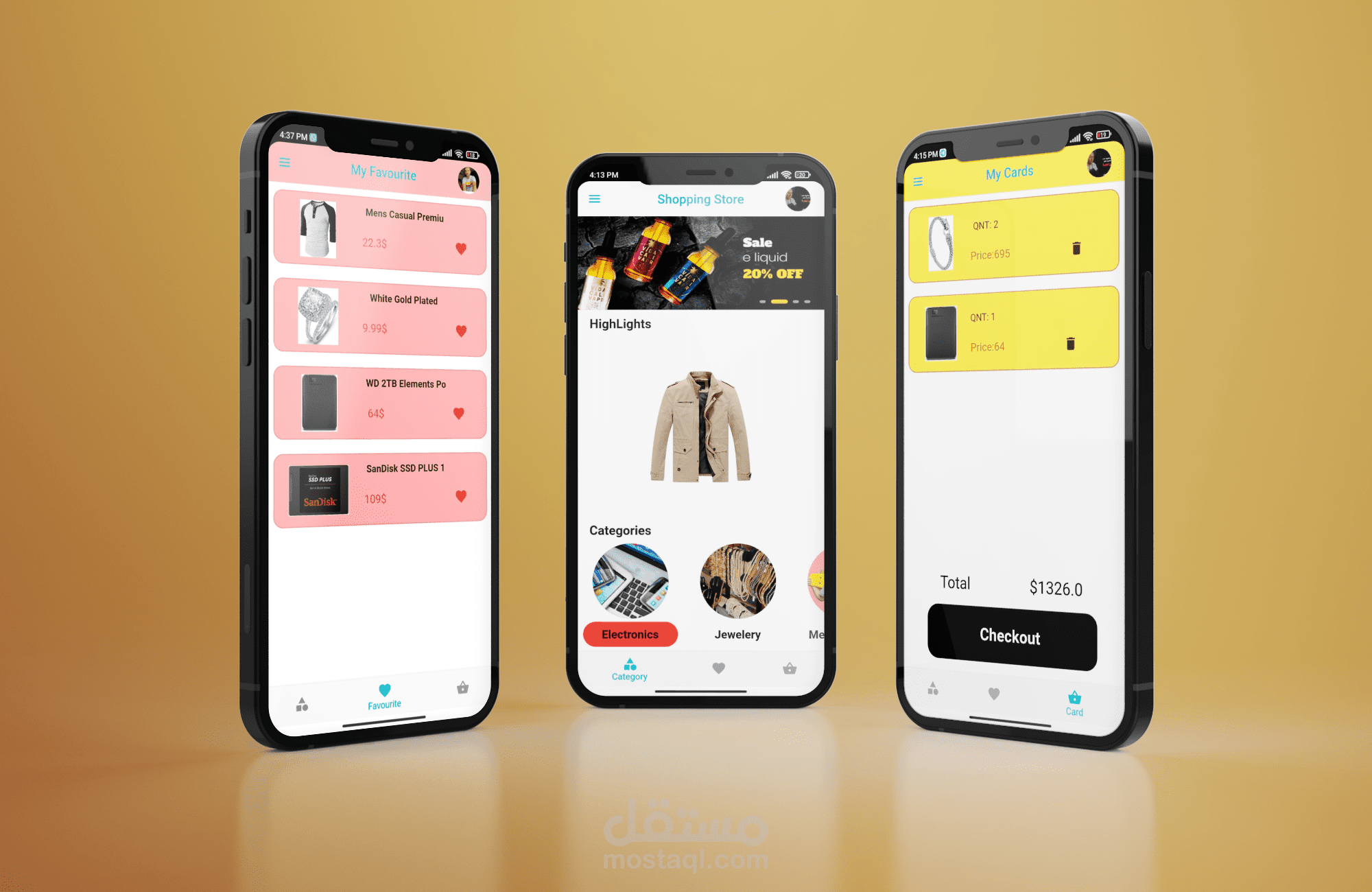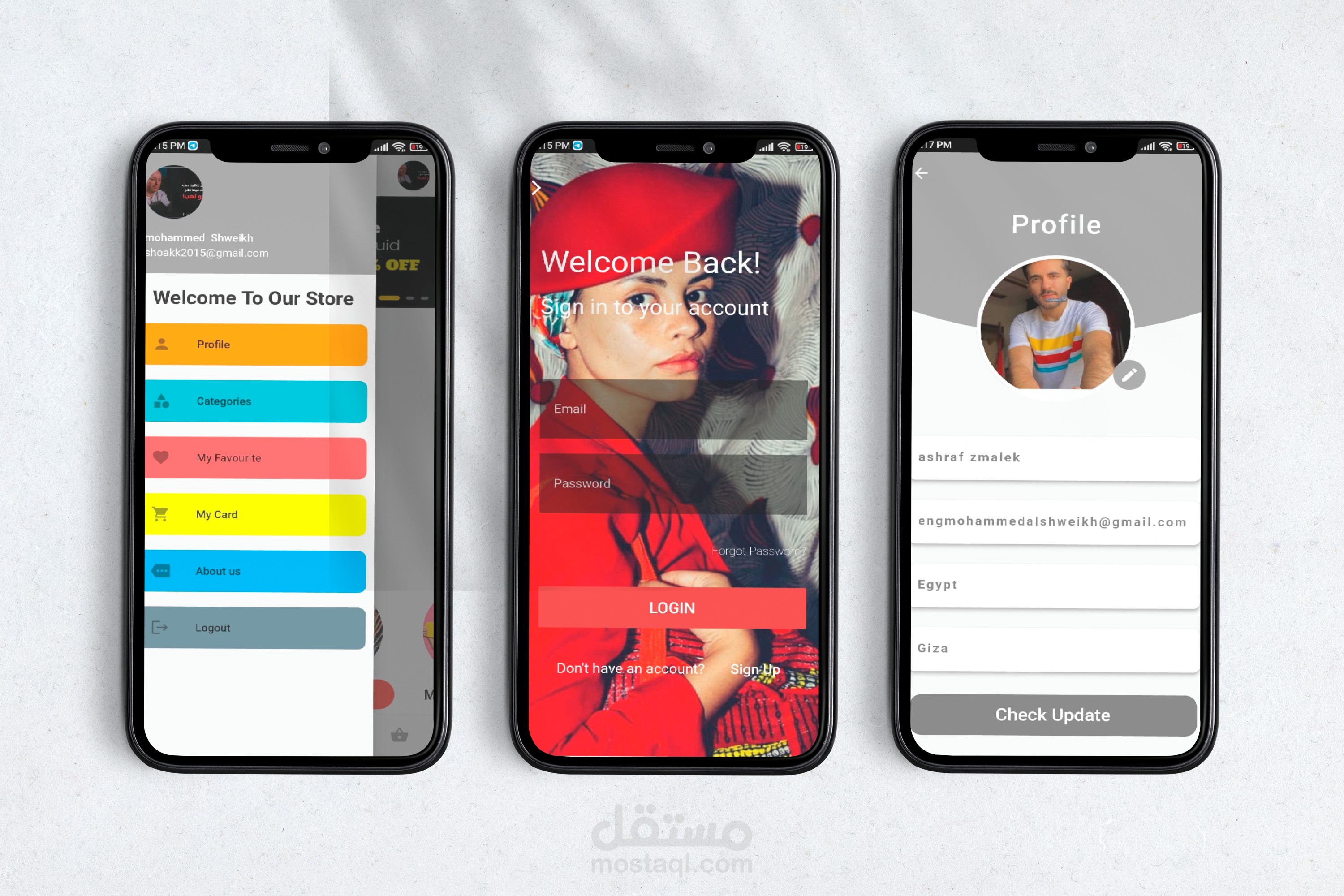 تطبيق متجر للتسوق الالكتروني حيث يعرض جميع المنتجات و يمكن المستخدم من اضافتها للمفضلة و كذلك الى محفظته