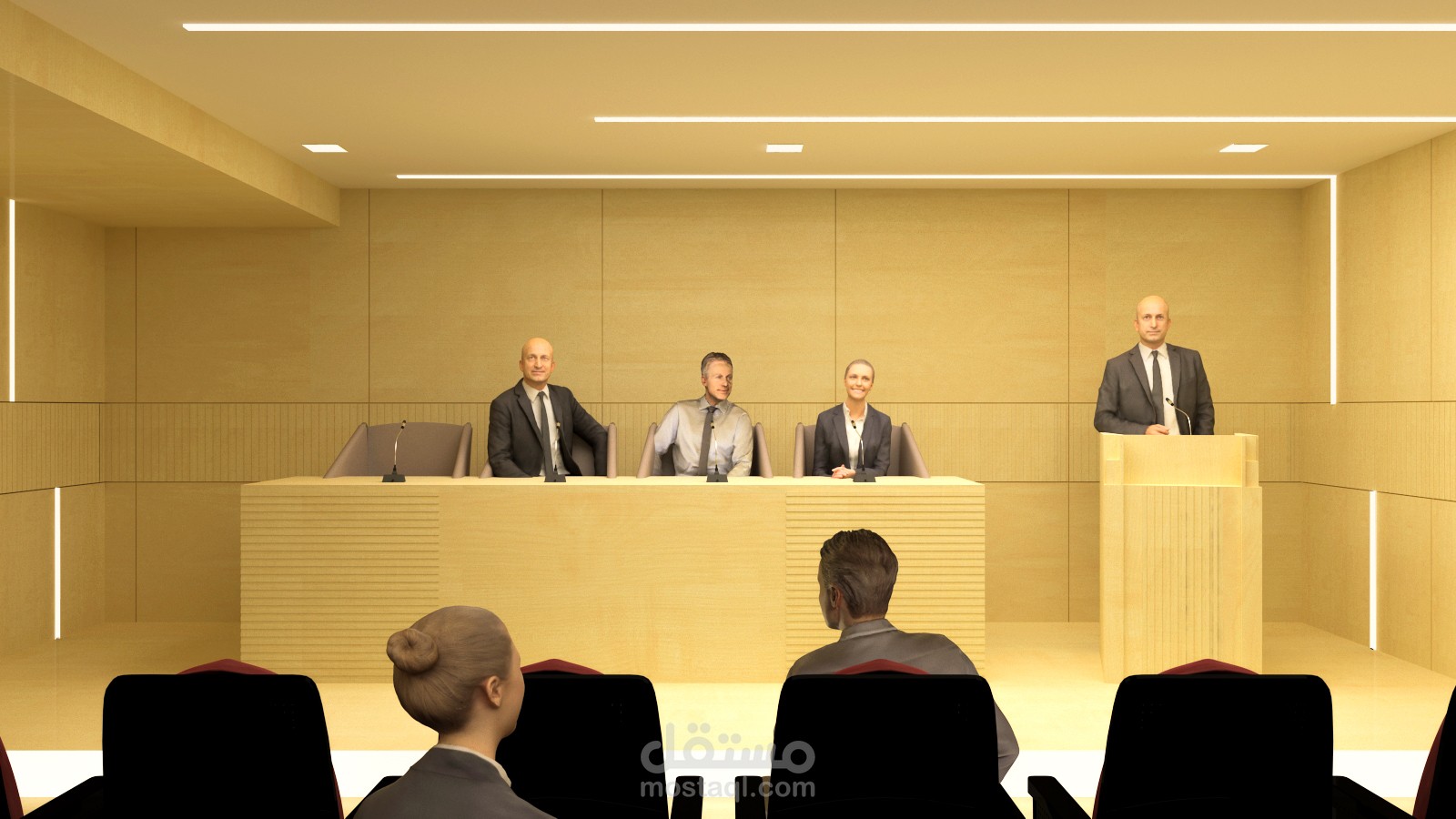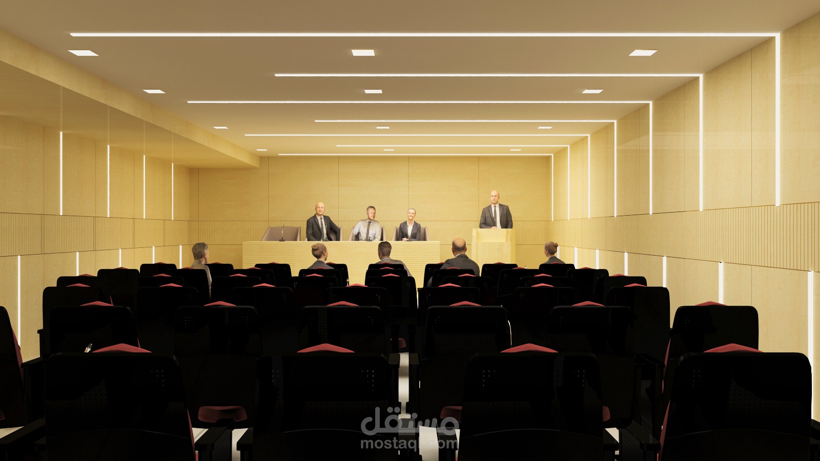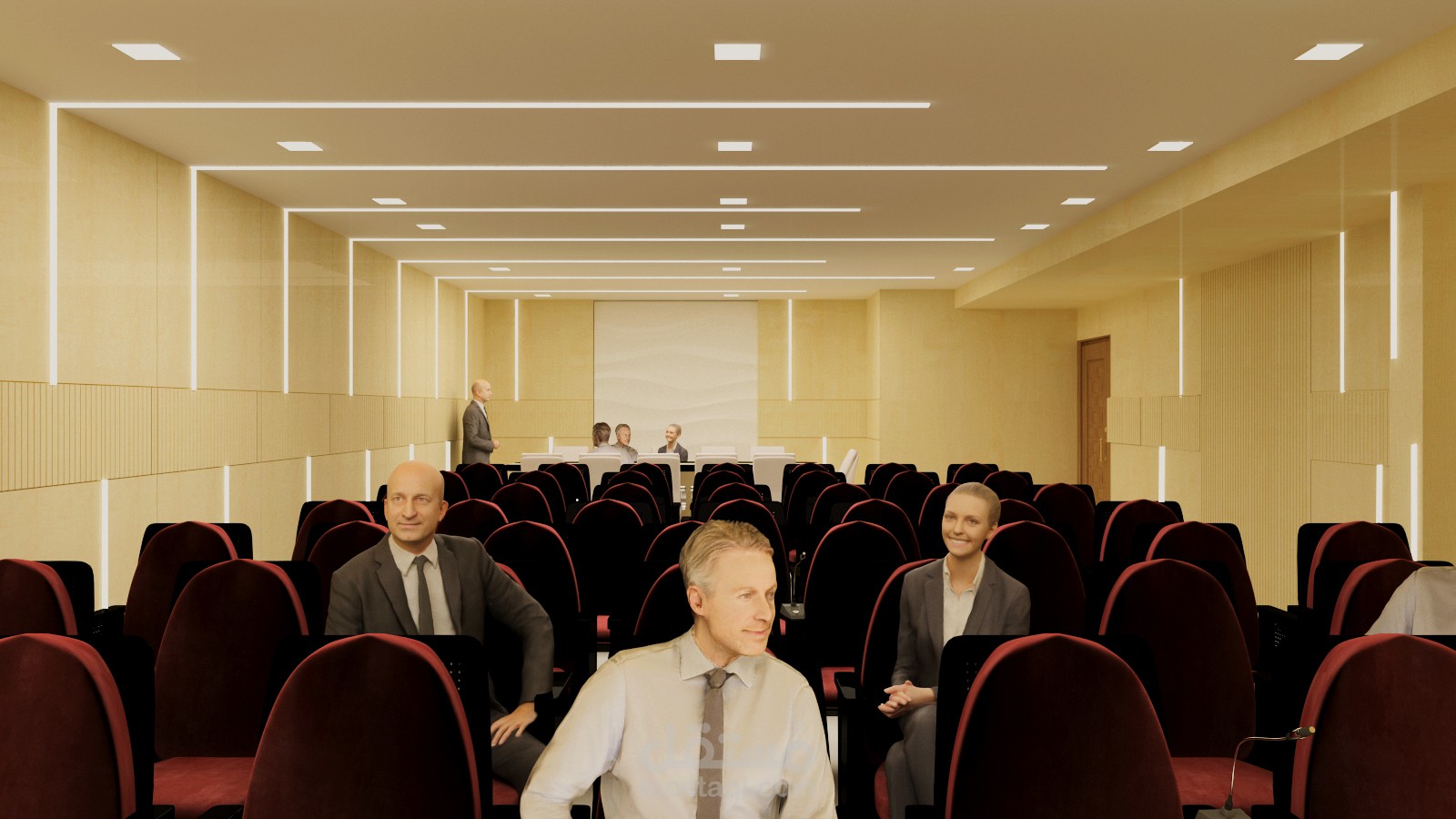 قاعة مؤتمرات باختيار الألوان المناسبة والاضاء المناسبة والتوزيعات المناسبة واختيار العفش بألوانه المناسبة