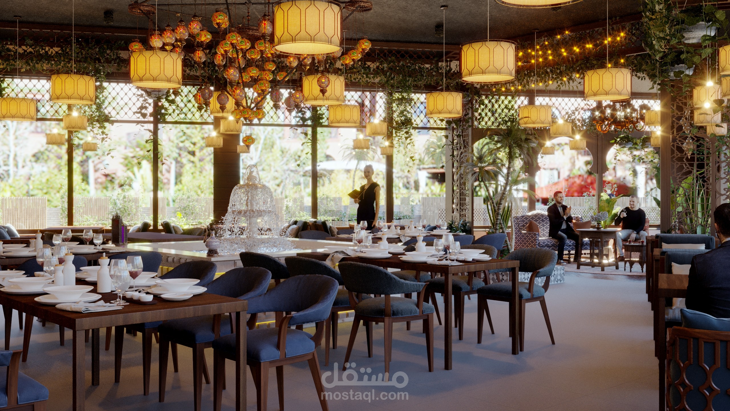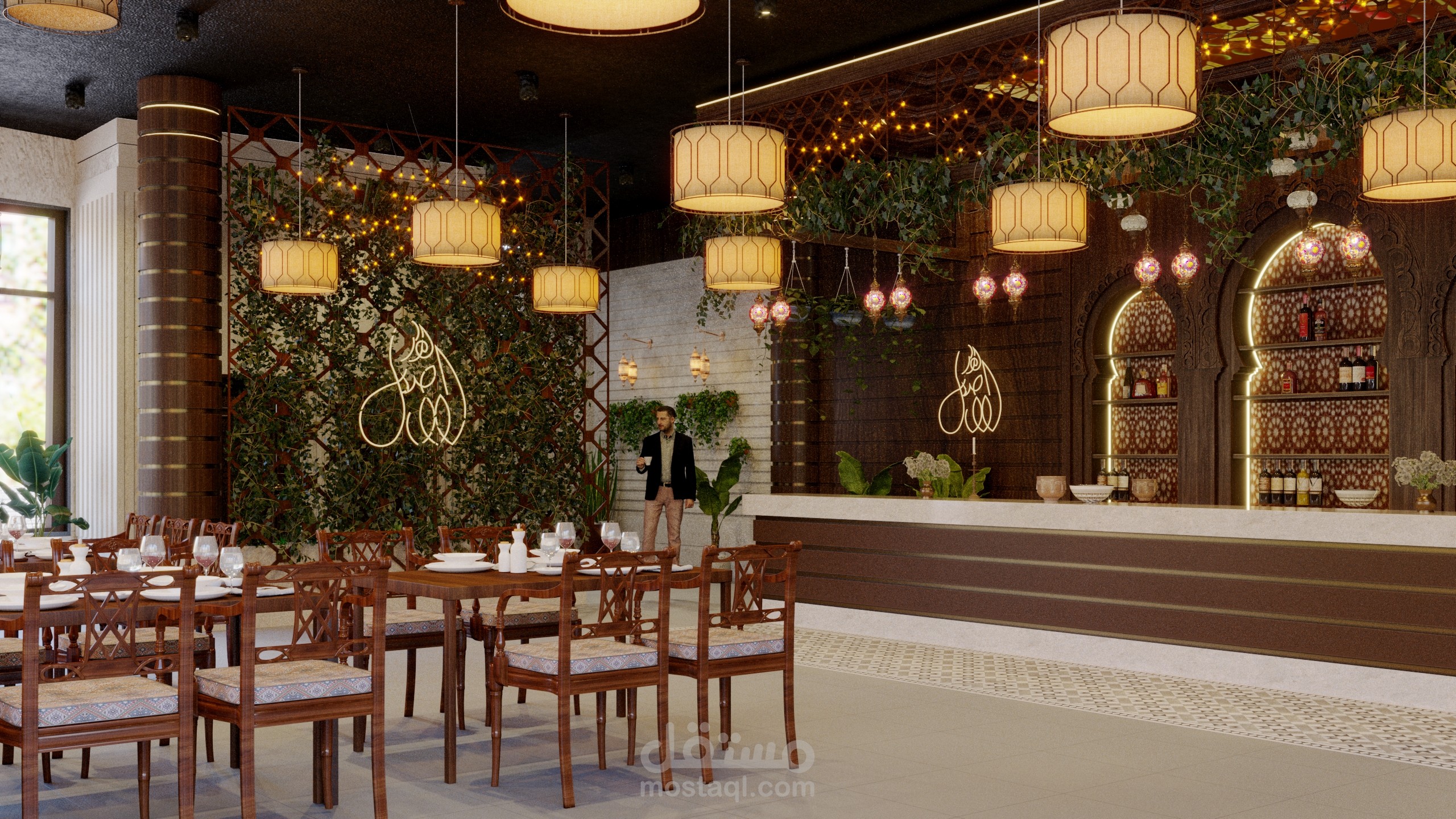فكرة العمل مستوحاة من اسم المطعم حيث تجمع بين التصميم الحديث ومتطلباته العصرية من حيث الاضاءة والماتيريالات مع الحفاظ على عناصر الاصالة العربية من خلال استخدام الخشبيات والمفروشات والمشربيات والحجر الكلسي المستخدم كثيرا في البيئىة العربية مما اعطى العمل جودة عالية من حيث الاجواء المميزة والفخامة العصرية.