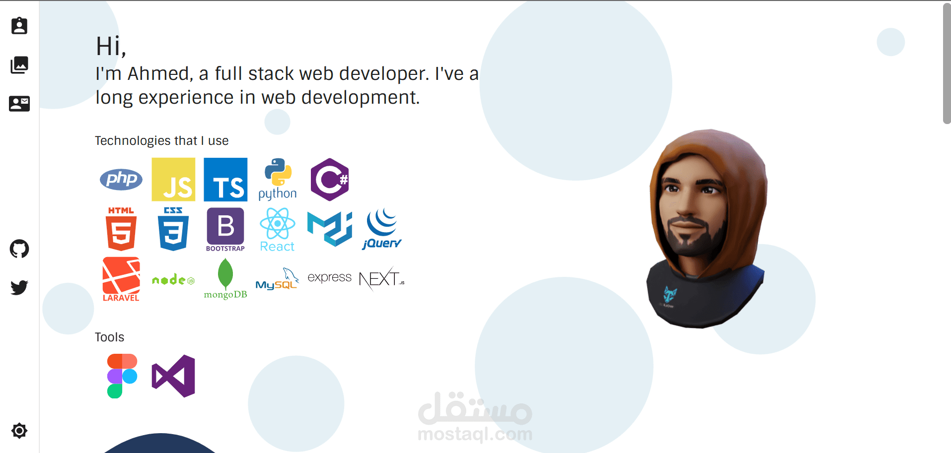 موقع شخصي ، يوجد به ميزات عرض الأعمال الخاصة بصاحب الموقع ، كذلك وضع وسائل للتواصل.