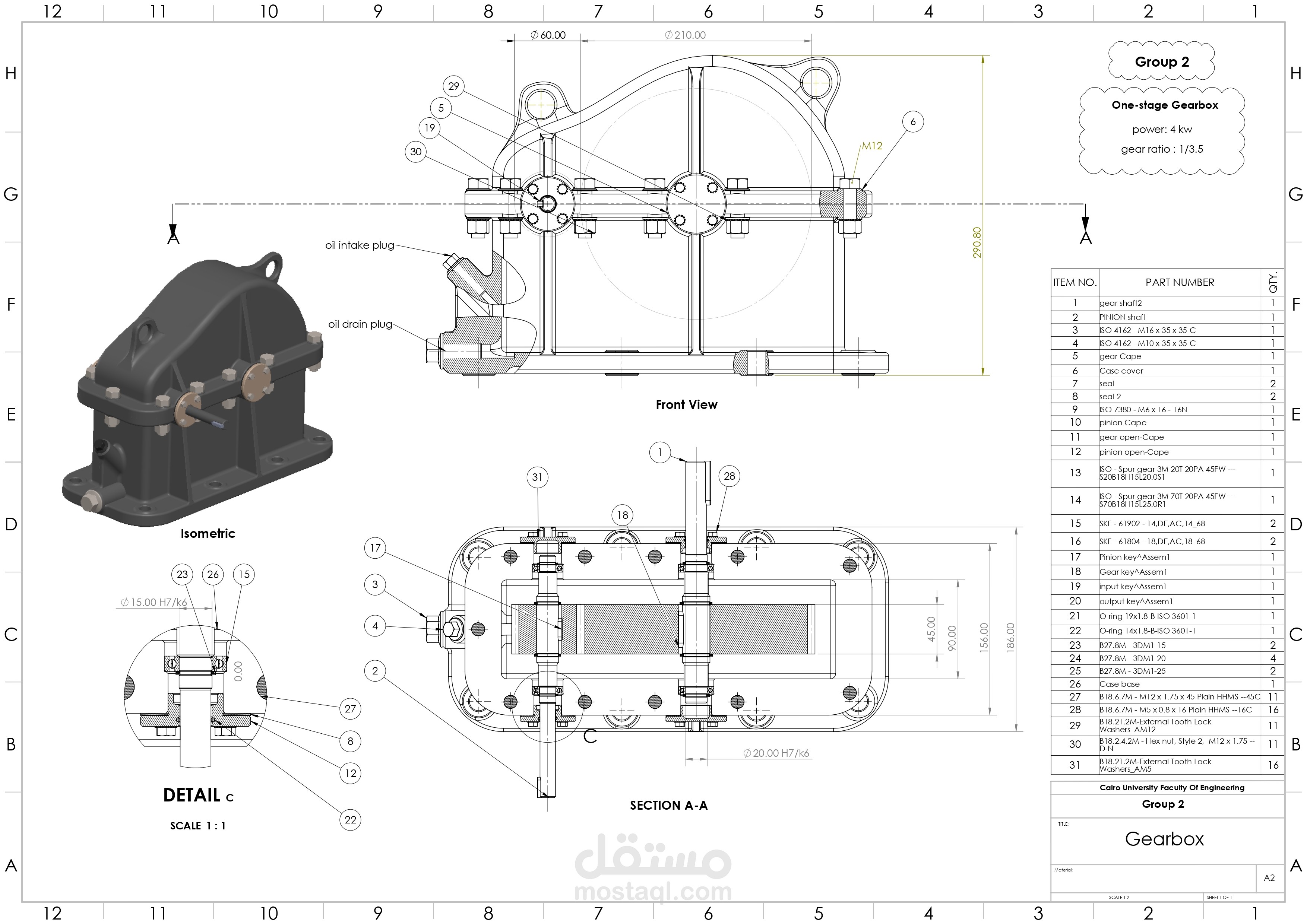 تم تصميم صندوق تروس مرحلة واحدة بقدرة 4 كيلو-وات , نسبة التعشيق: 3.5/ 1