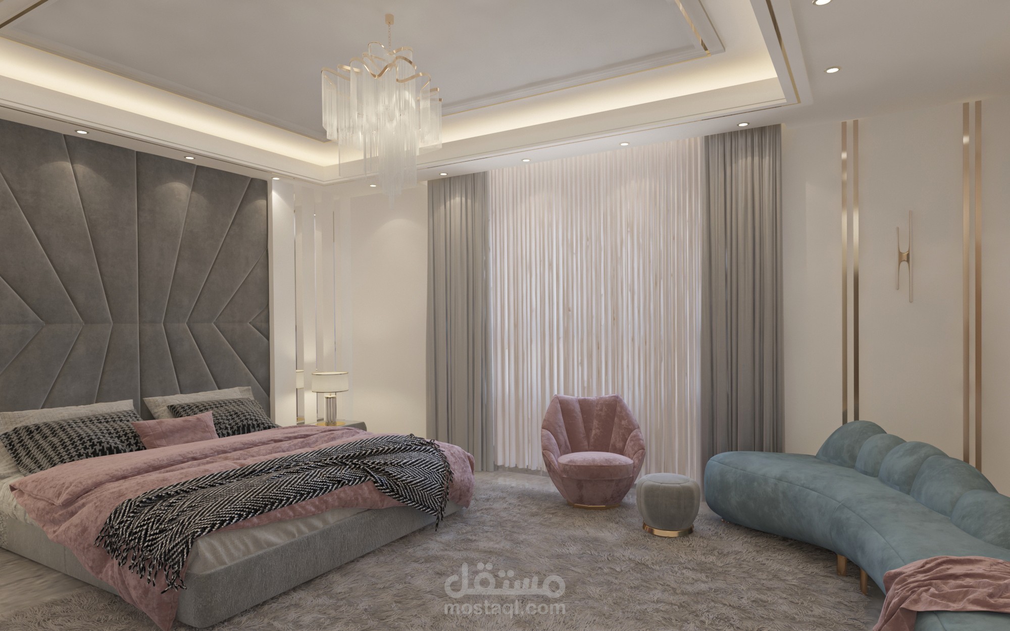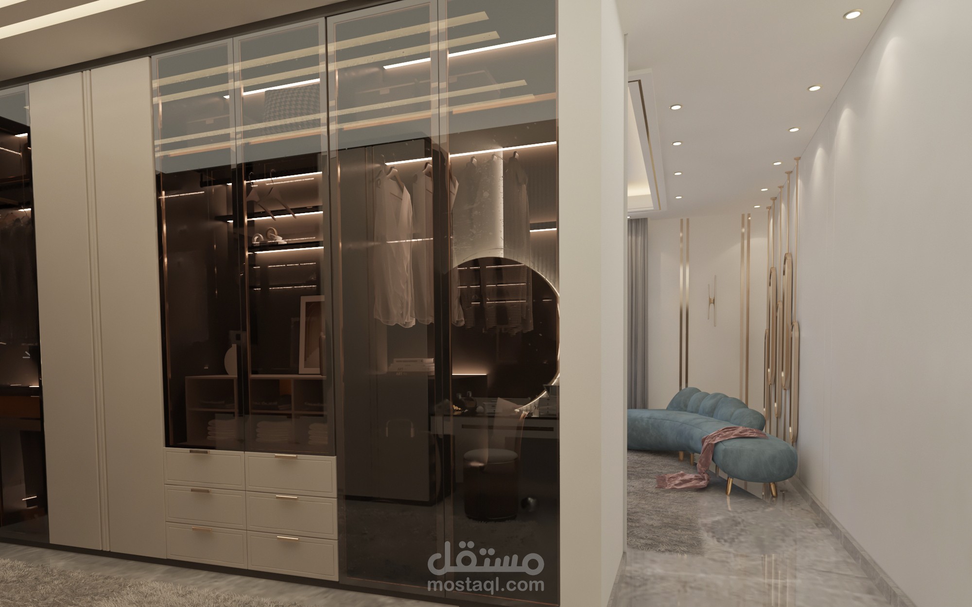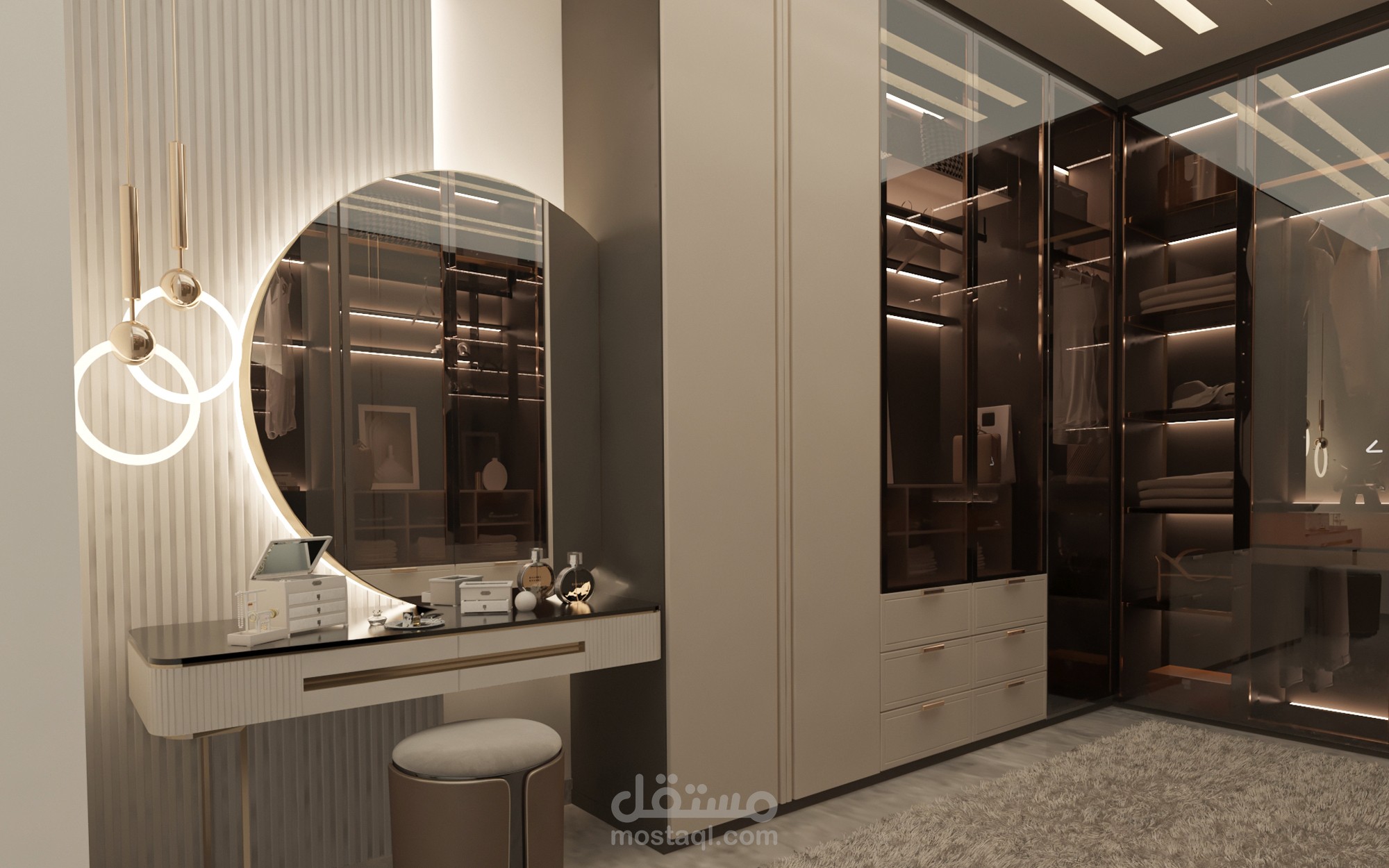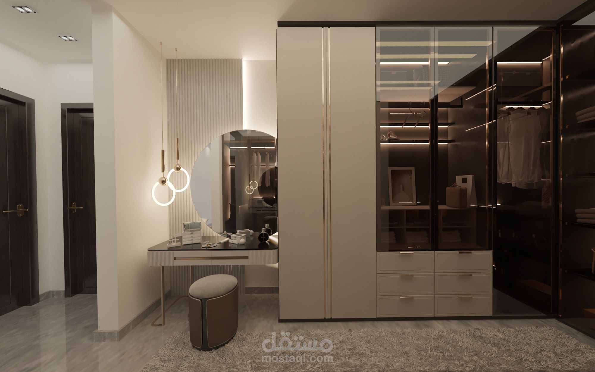 تصميم غرفه ماستر بألوان هادئه ومريحه مع تصميم دريسنج روم من ضمن تصميمات لفيلا بالمملكة العربية السعودية
