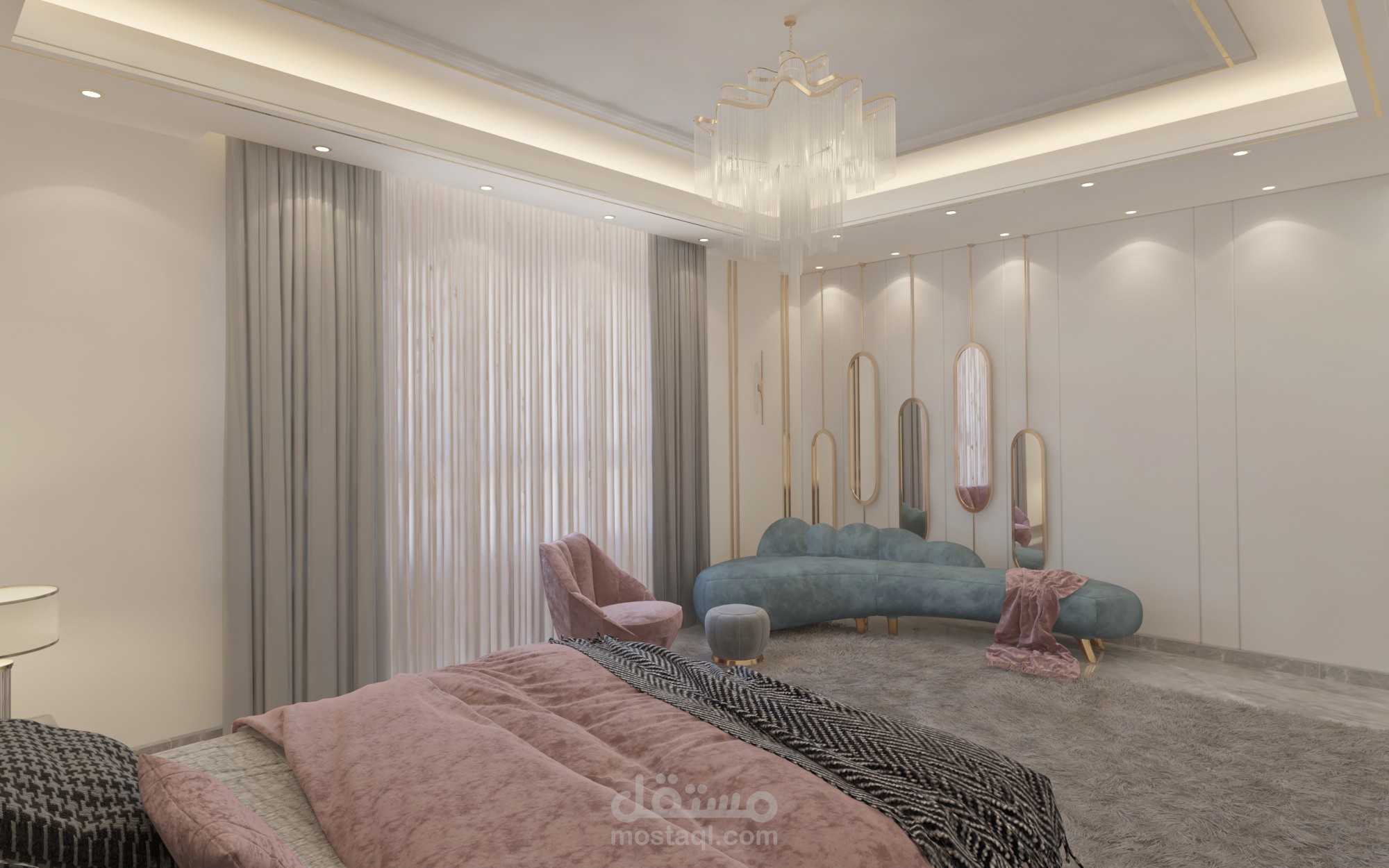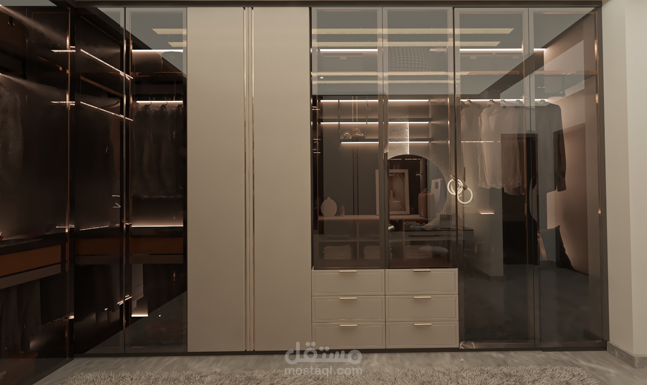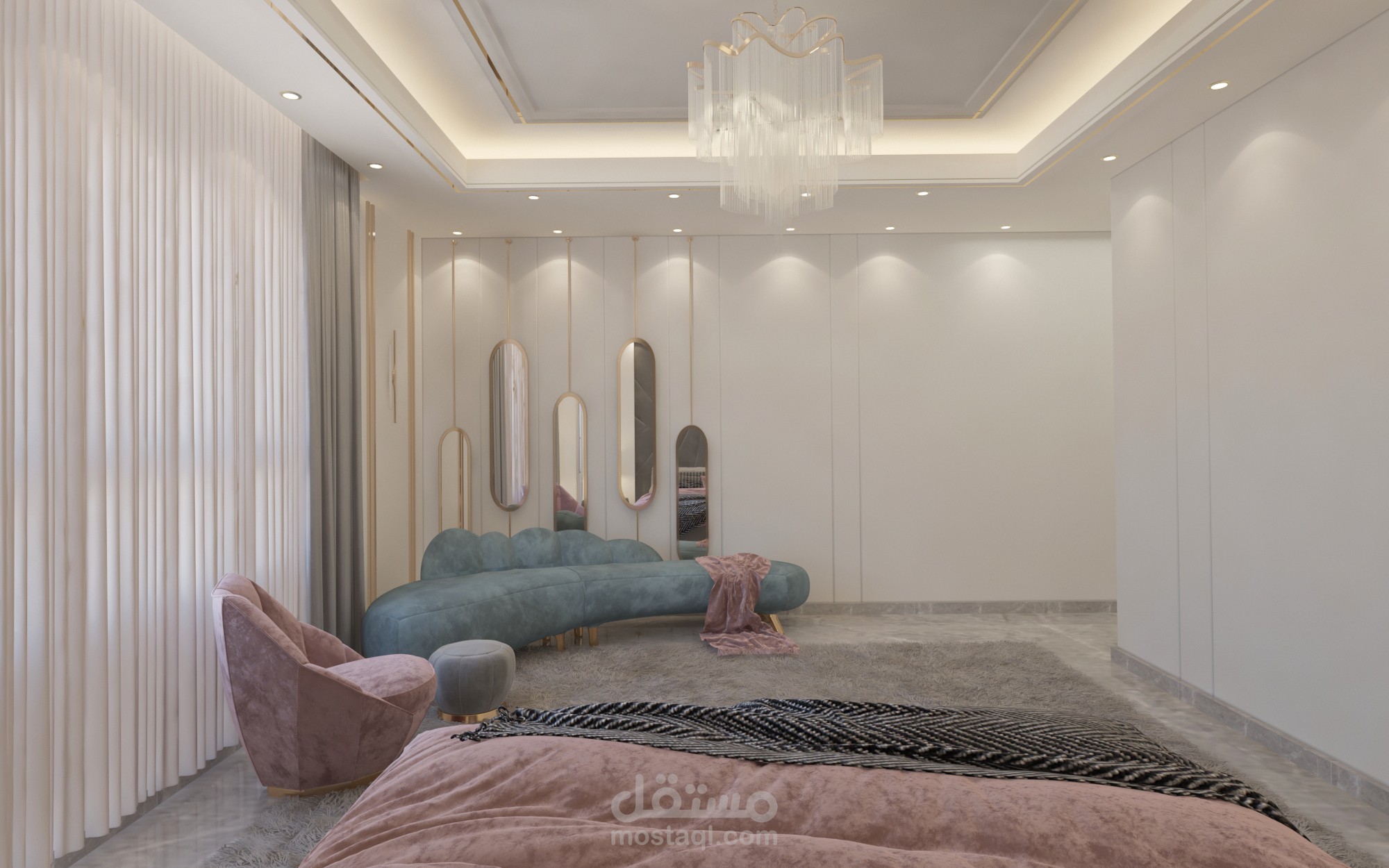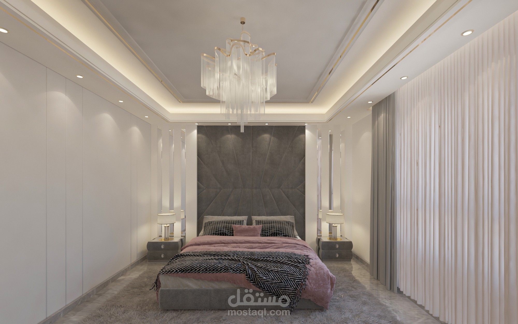 تصميم غرفه ماستر بألوان هادئه ومريحه مع تصميم دريسنج روم من ضمن تصميمات لفيلا بالمملكة العربية السعودية