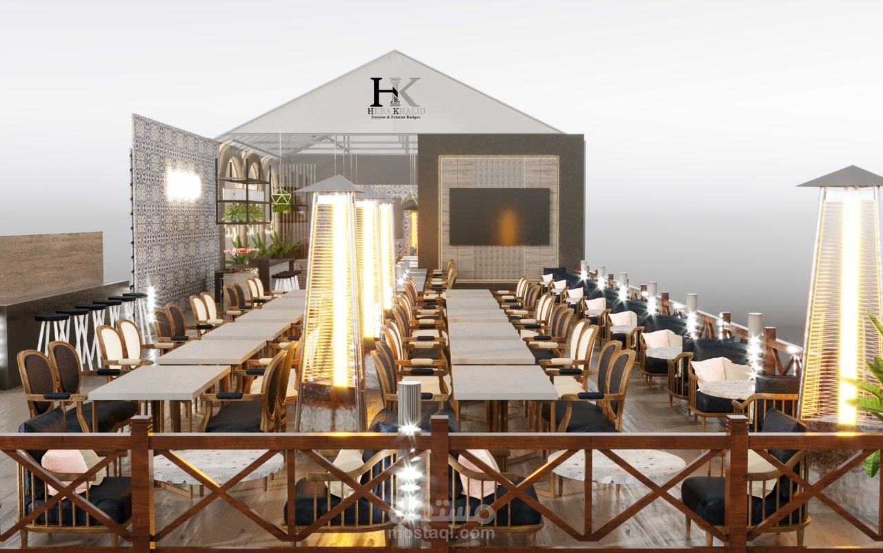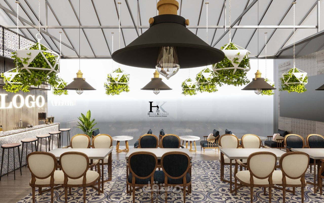 تصميم كافيه يحتوي على منطقه جلسات داخليه ومنطقه خارجيه مفتوحه