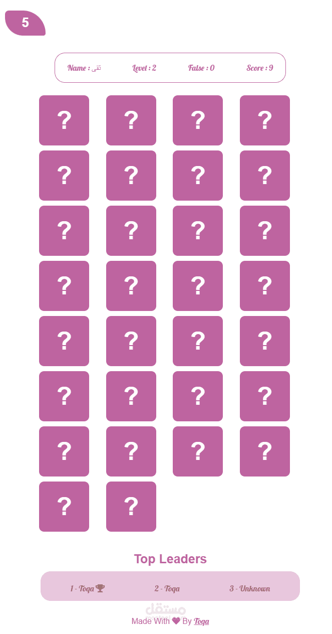 memory game هى لعبة مسليه ومثيرة تتكون من عدة مستويات ، عندما تجتاز كل مستوى تزداد عدد نقاطك وفرصتك ف ان تصبح Top Leader . لقد قمت بتصميمها وبرمجتها باستخدام لغة html css javaScript .