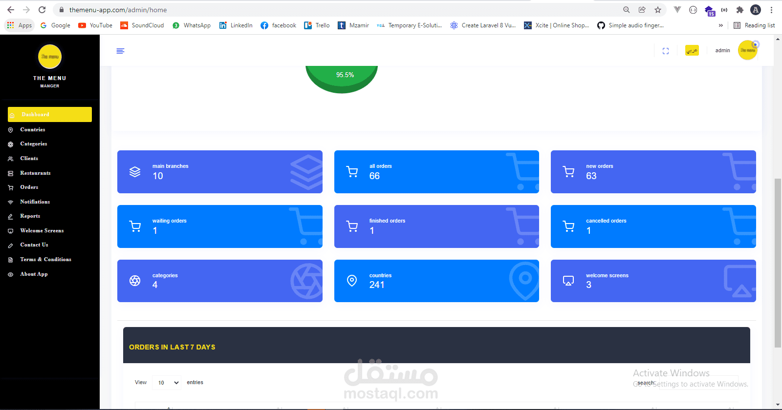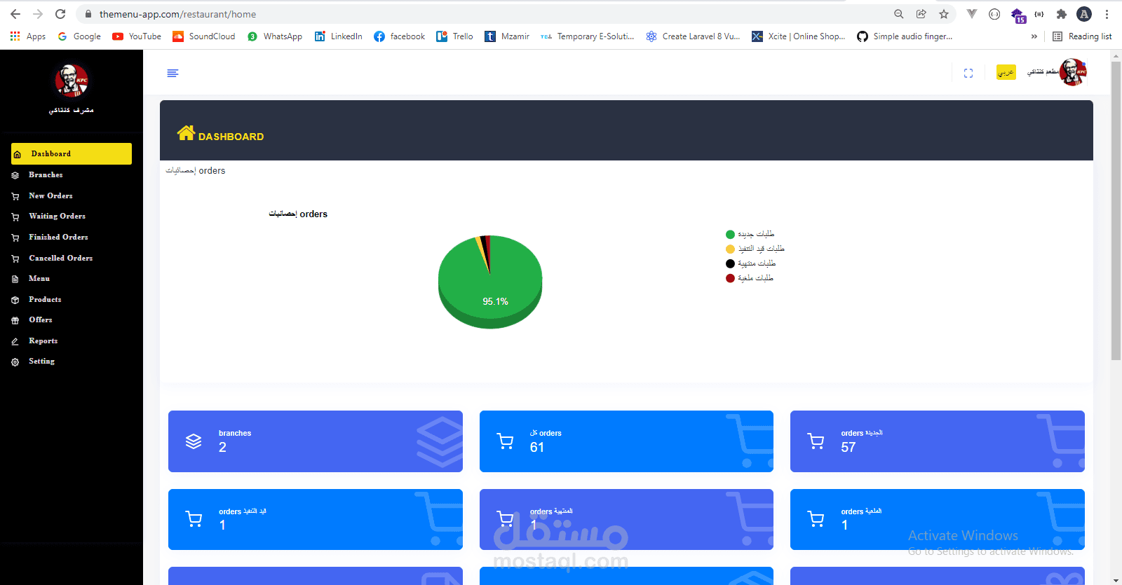 لوحة تحكم للمطعم و التقارير البيع و الطلبات الخاصة بالمطعم