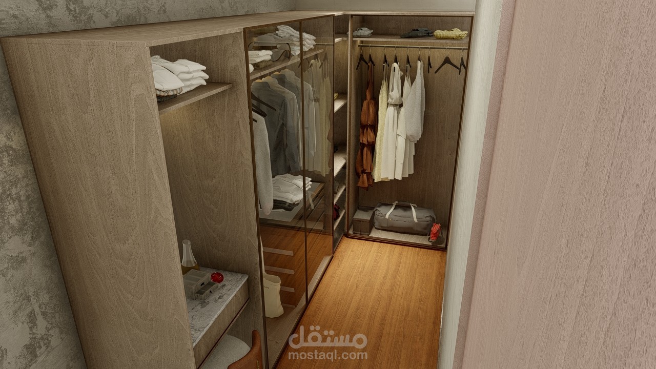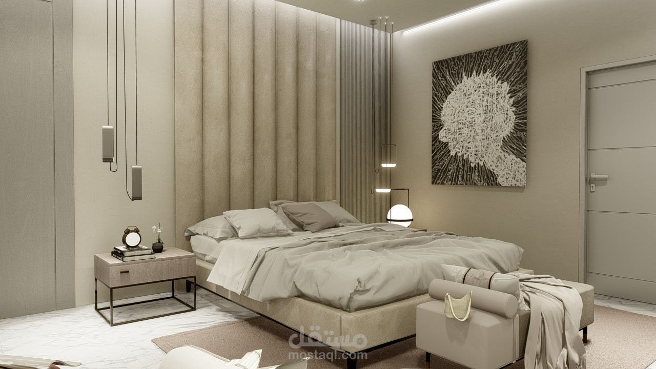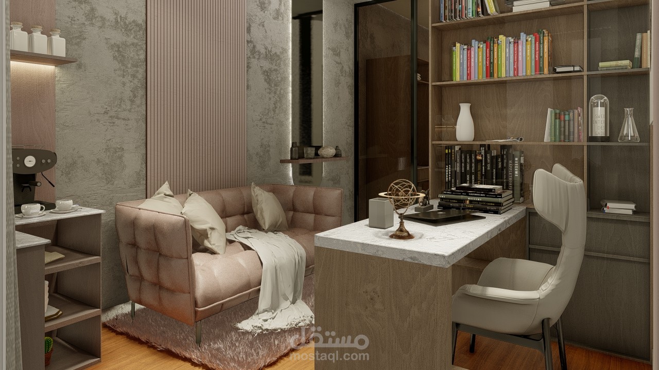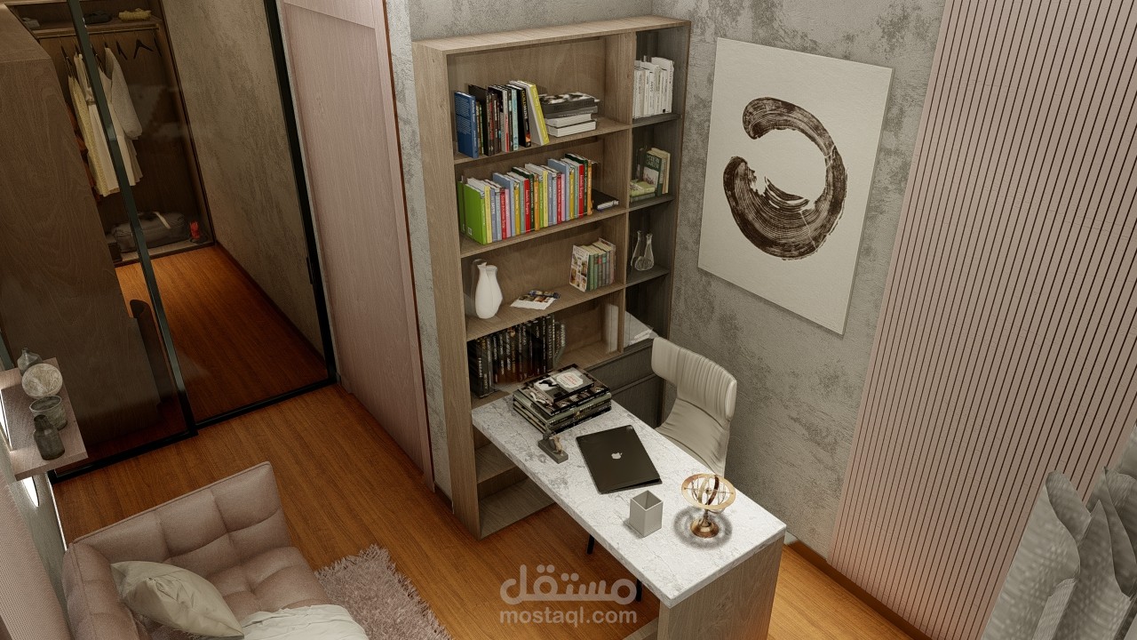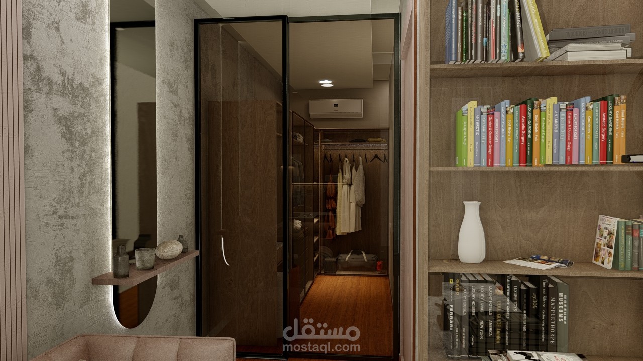 تصميم لغرفة نوم بالاضافة إلى غرفة مكتب وغرفة ملابس على طراز الموديرن مع جولة داخل المشروع بتقنية الواقع المعزز