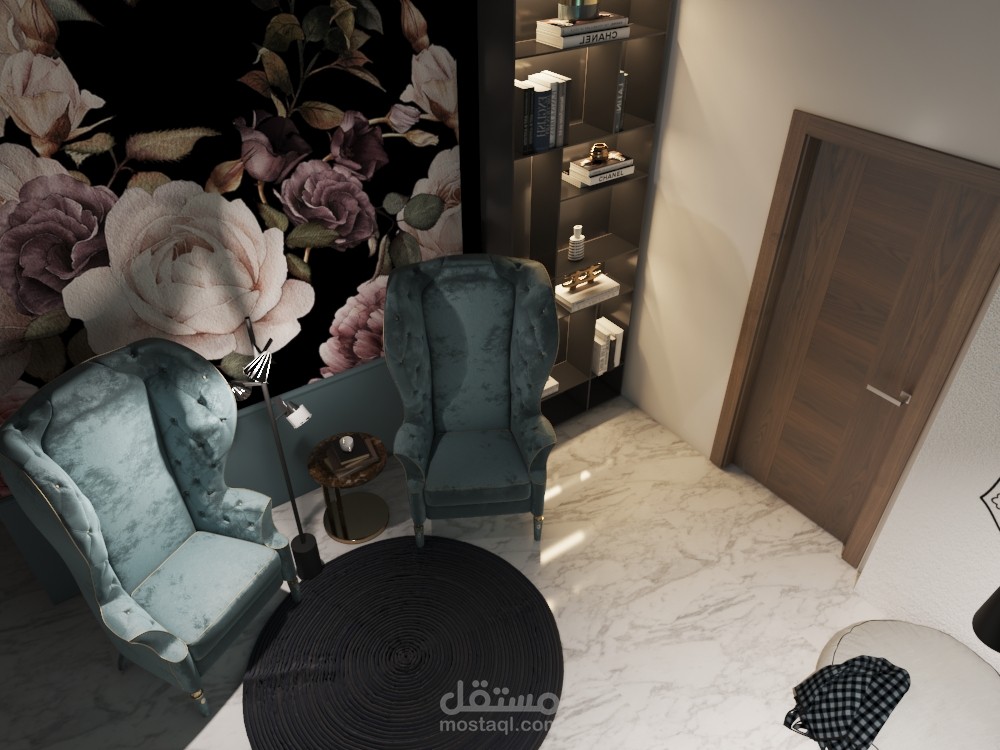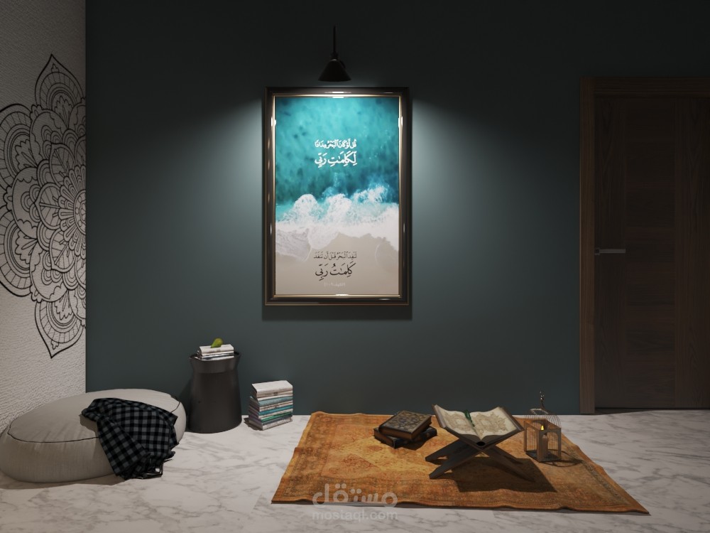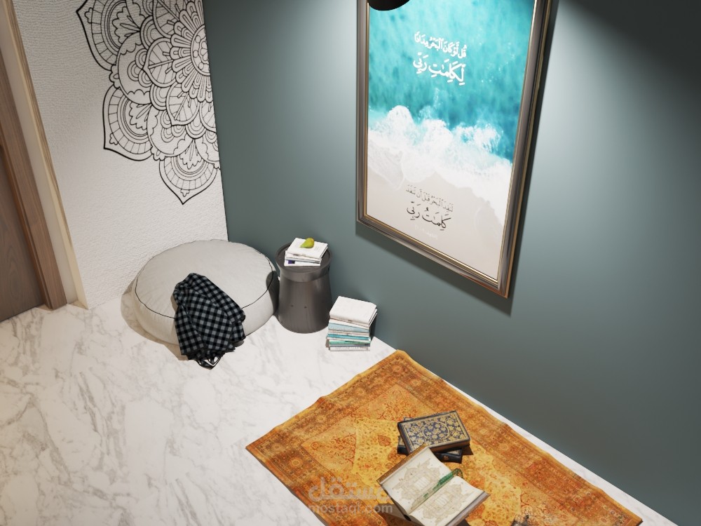 تصميم صالة توزيع بين الغرف واستخدامها في عمل ركن هادئ للقراءه و ركن اخر للصلاه