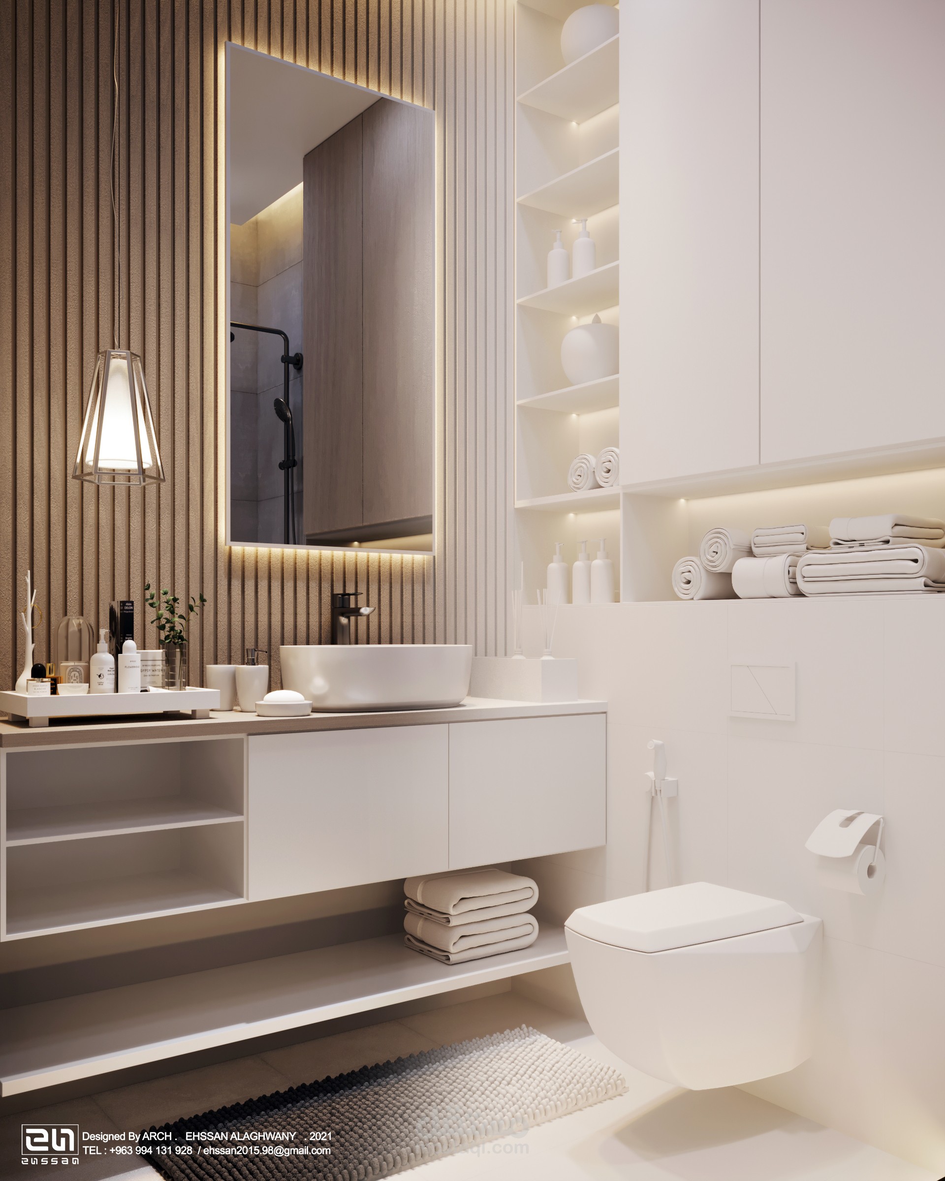 أسفل المرآة، تتوزع وحدة مغسلة مُعلقة بتشطيب أبيض مطفي، مزودة بحوض دائري فوق السطح، مع رف سفلي مفتوح لتخزين المناشف.