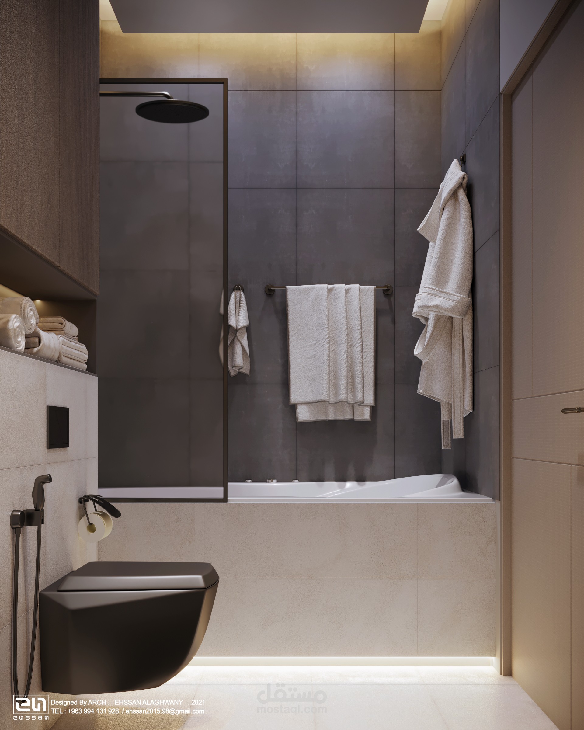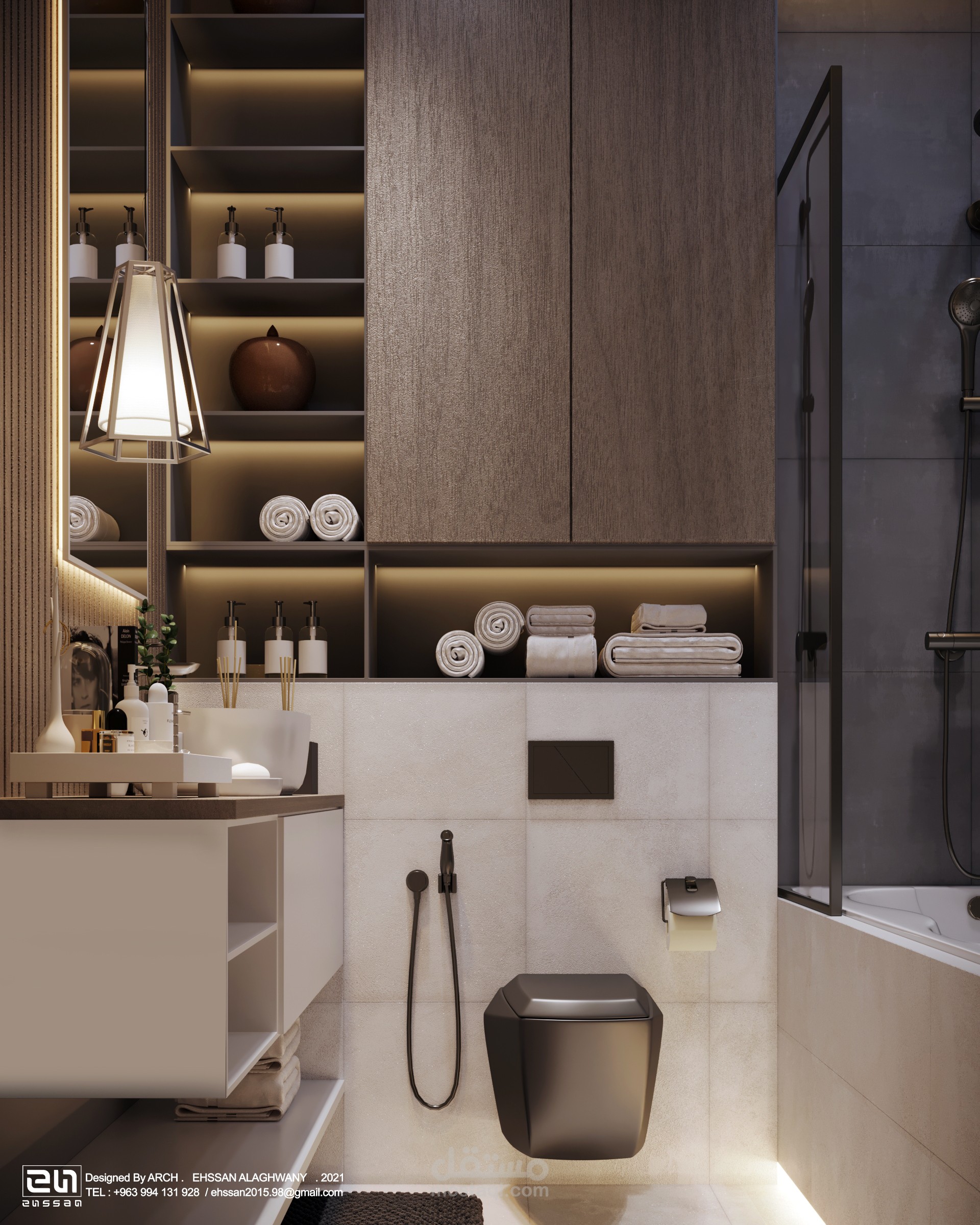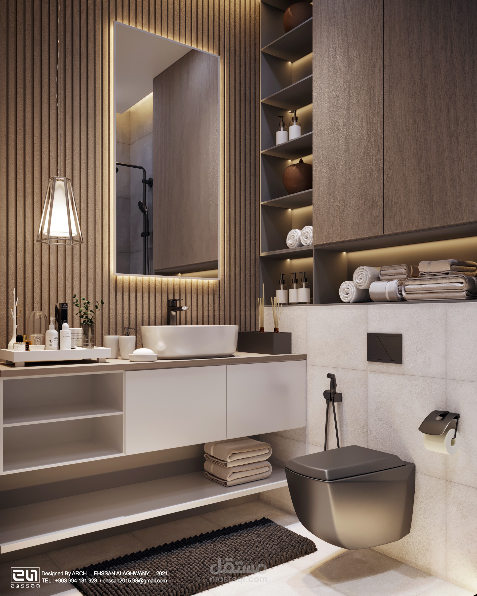 ُجسد التصميم حماماً معاصراً يتميز باستخدام تكوينات هندسية دقيقة وخامات طبيعية.