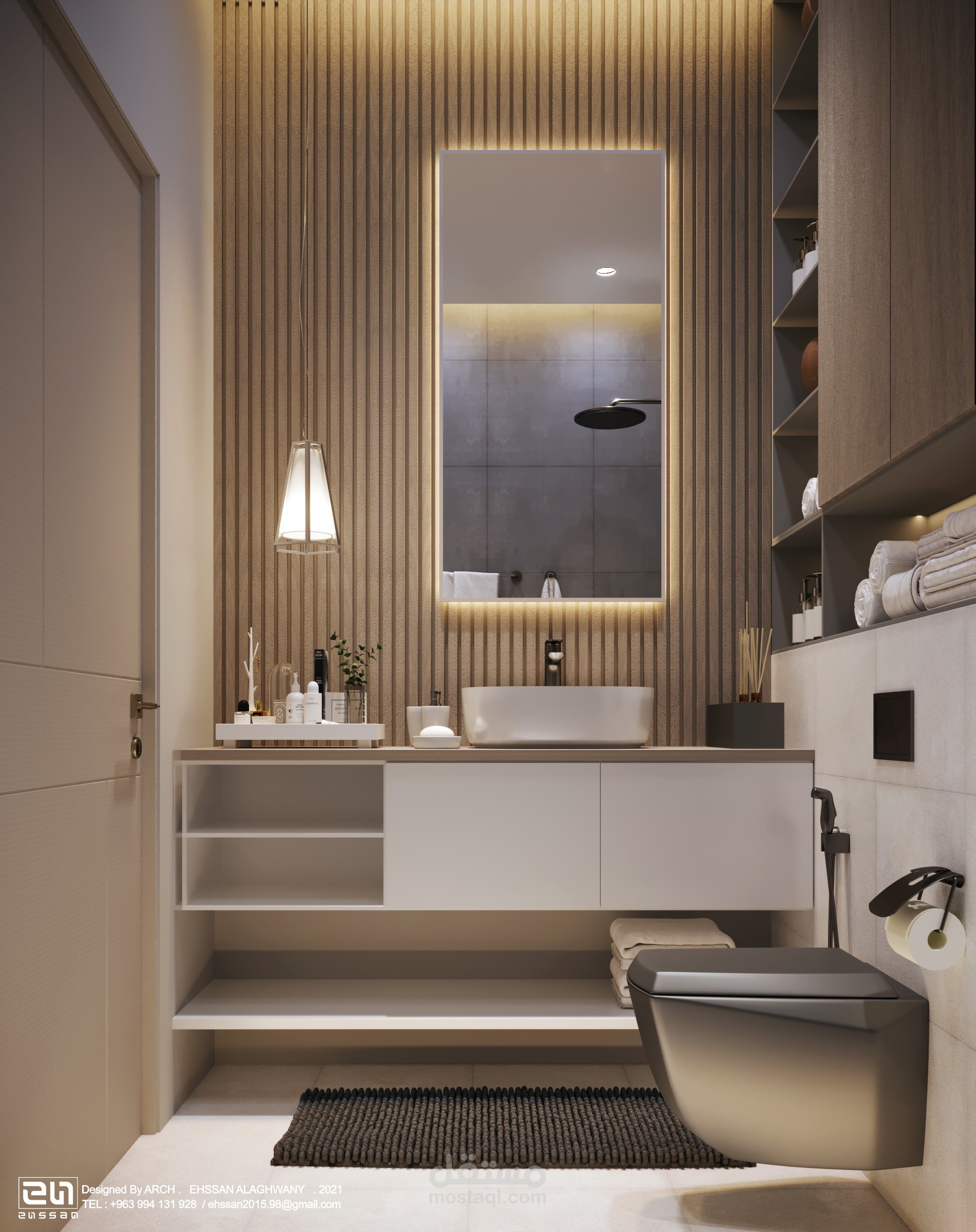 الجدار الخلفي مغطى بألواح خشبية رأسية منتظمة، تبرز التوجه العمودي للفراغ. تتوسطه مرآة مستطيلة مزودة بإضاءة محيطية LED مخفية، تعمل كعنصر بصري محوري.