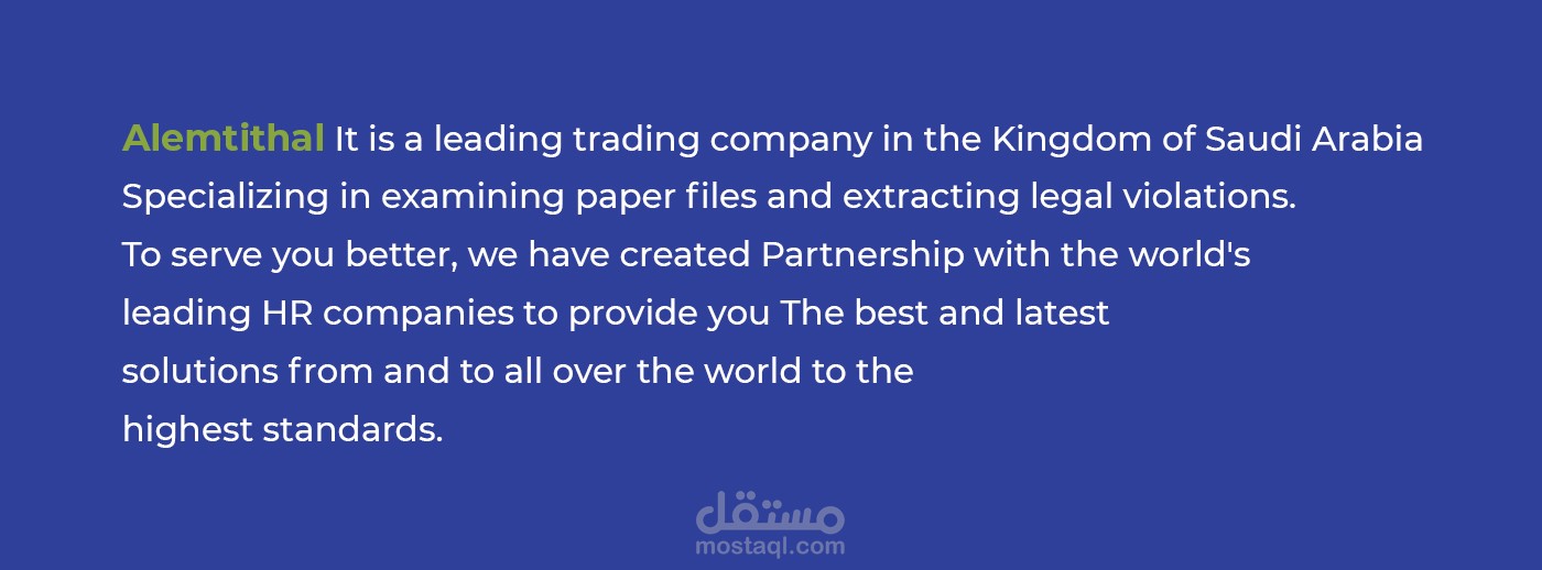 Alemtithal It is a leading trading company in the Kingdom of Saudi Arabia Specializing in examining paper files and extracting legal violations. To serve you better, we have created a partnership with the world's leading HR companies to provide you with The best and latest solutions from and to all over the world to the highest standards.
