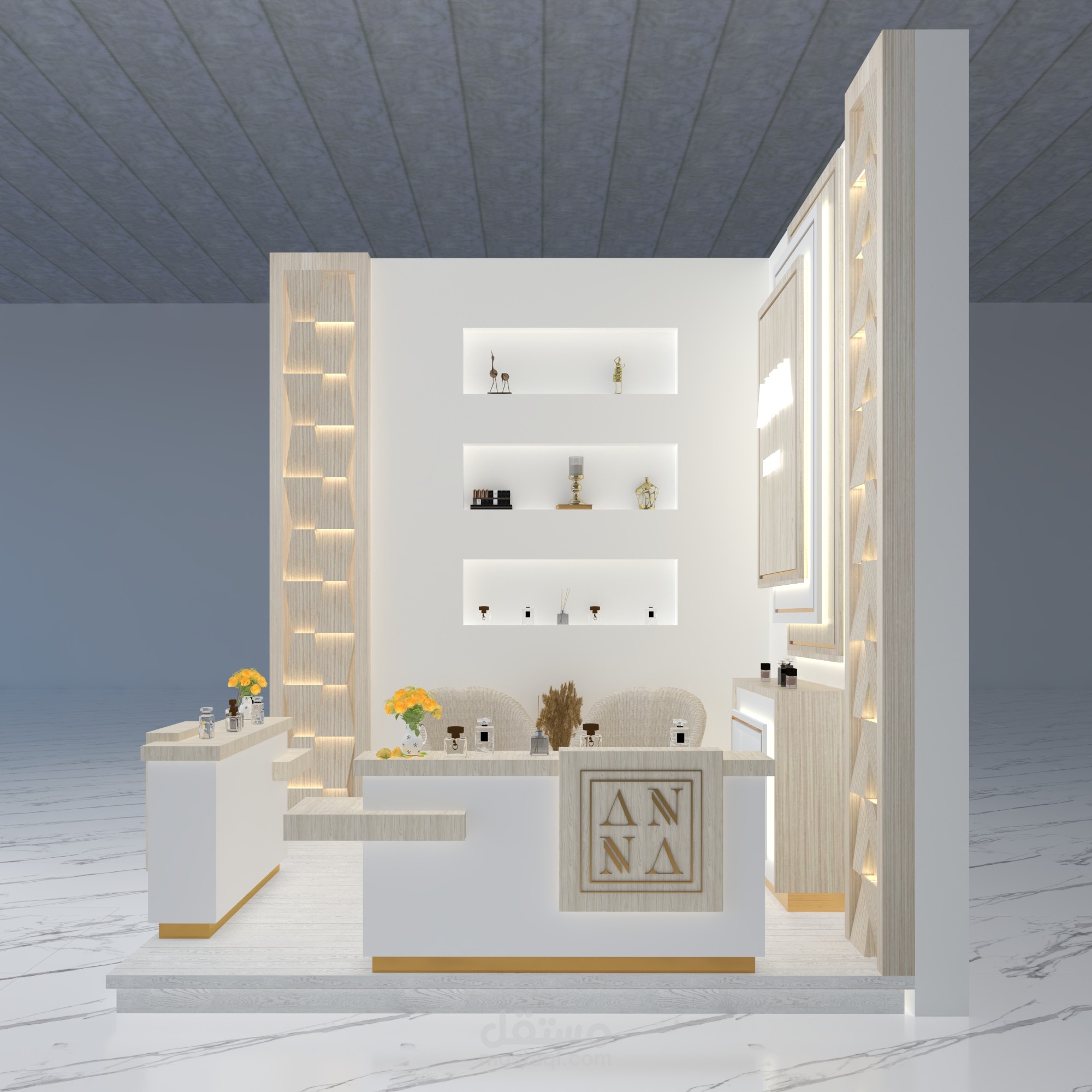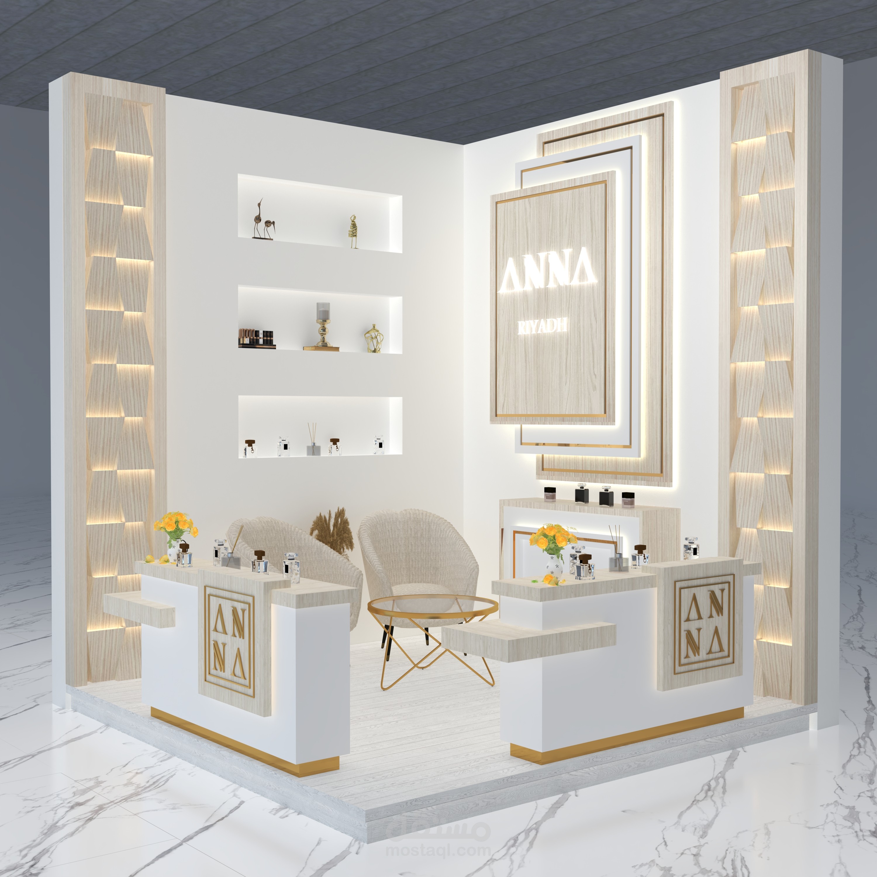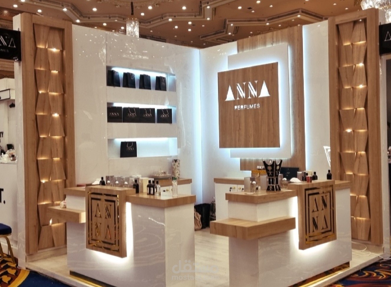 تصميم بوث عطور 3*3 داخلى لأعمال المعارض مع عمل شوب دروينج وتحديد المواد المستخدمة للتنفيذ ومرفق صورة العمل بعد التنفيذ وصور للعمل بلون آخر