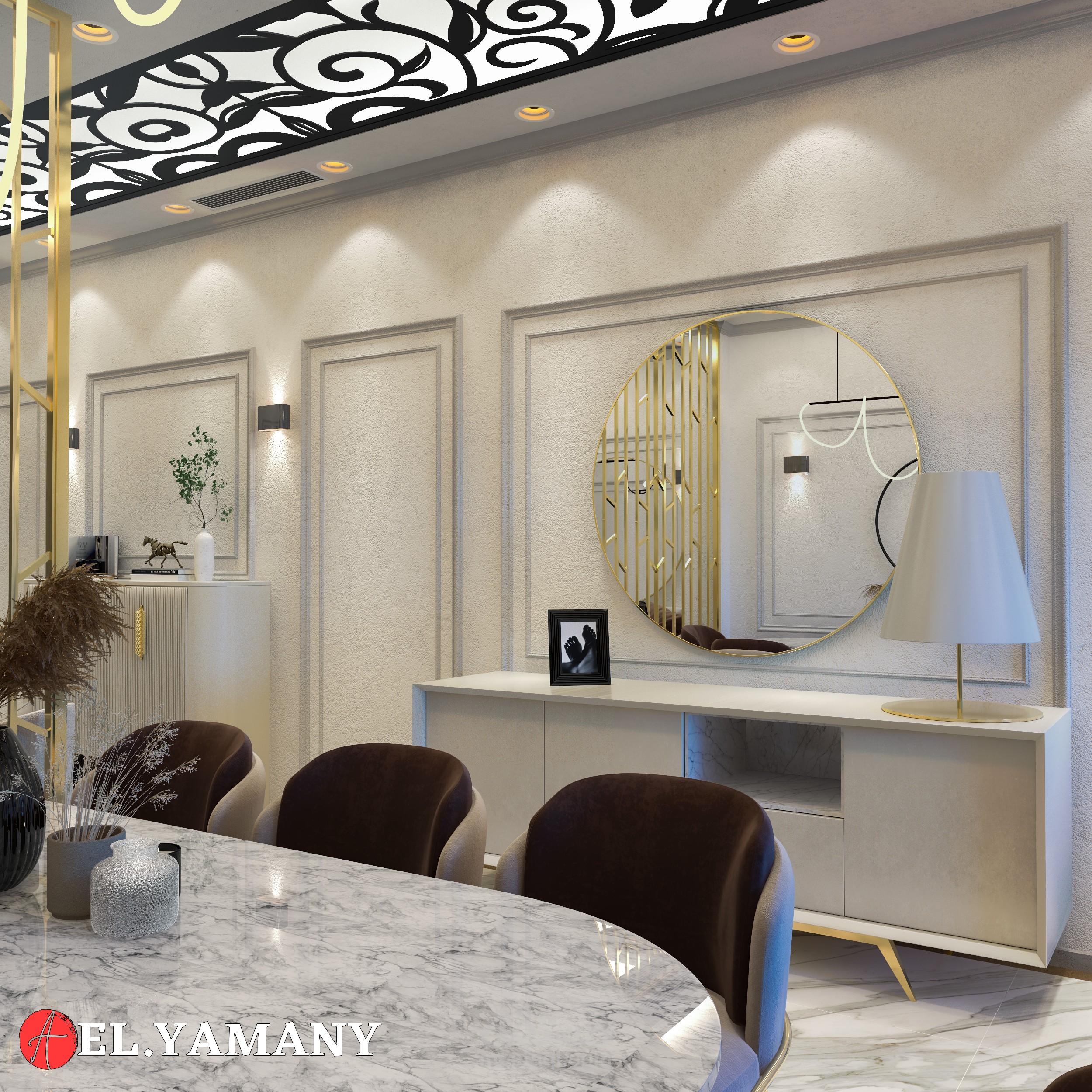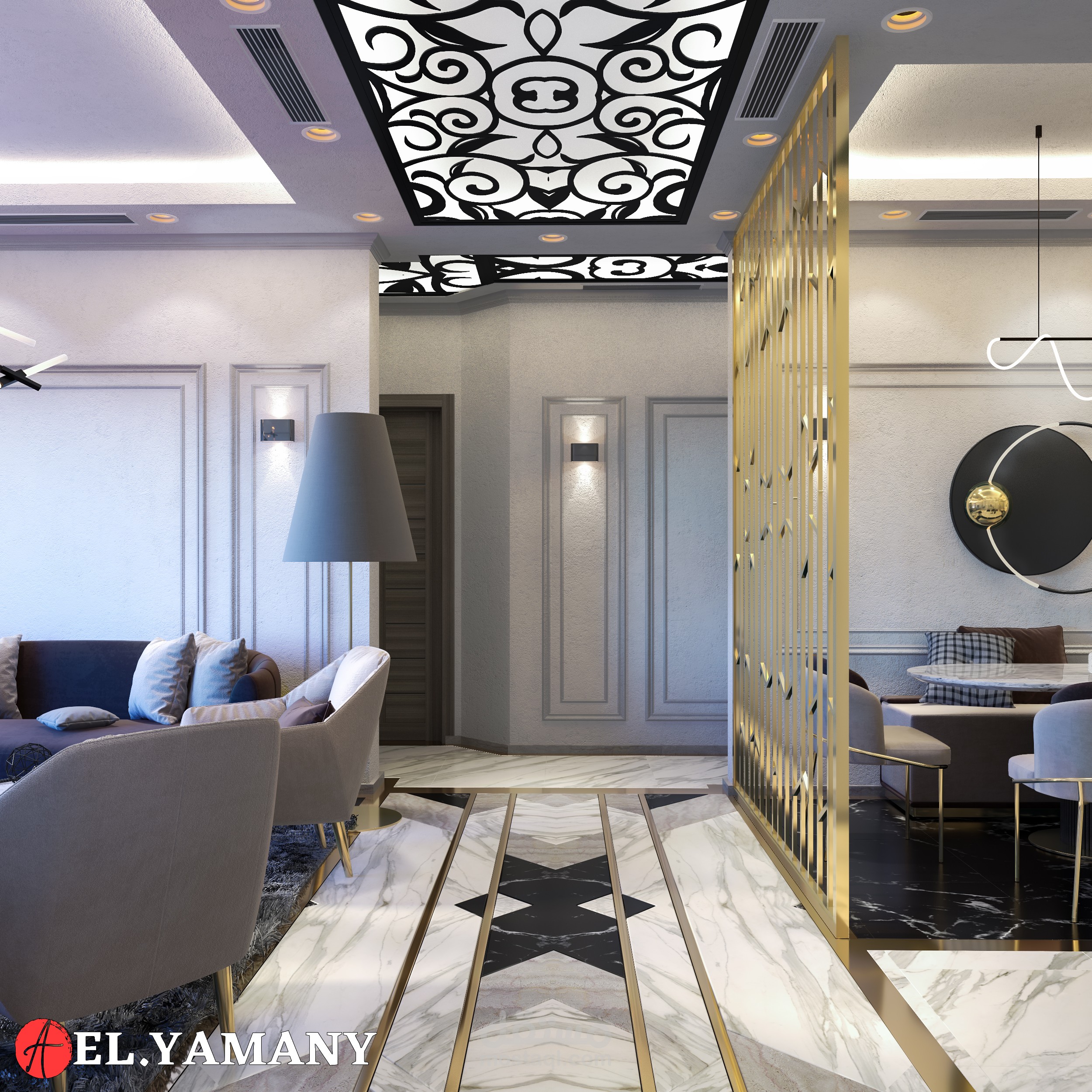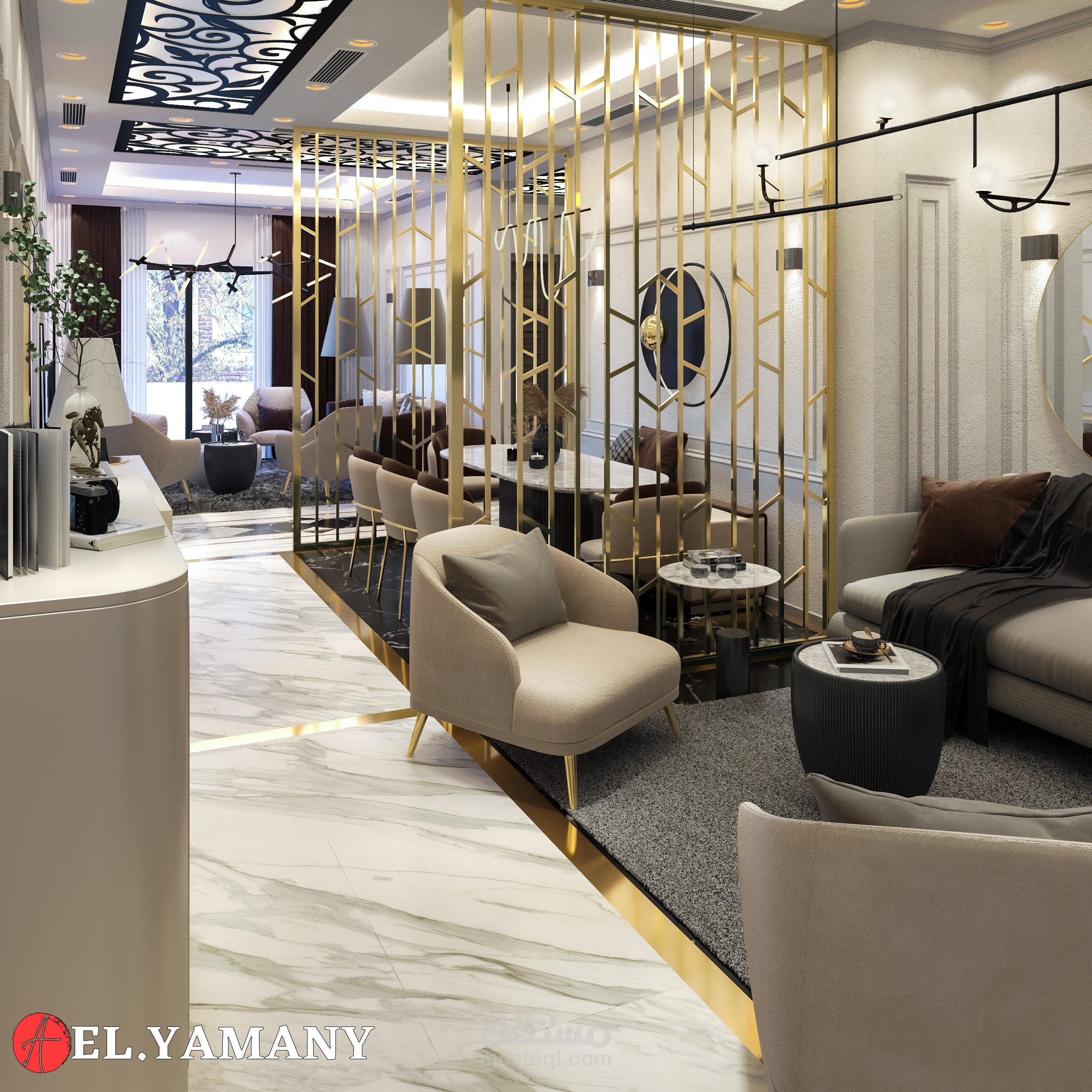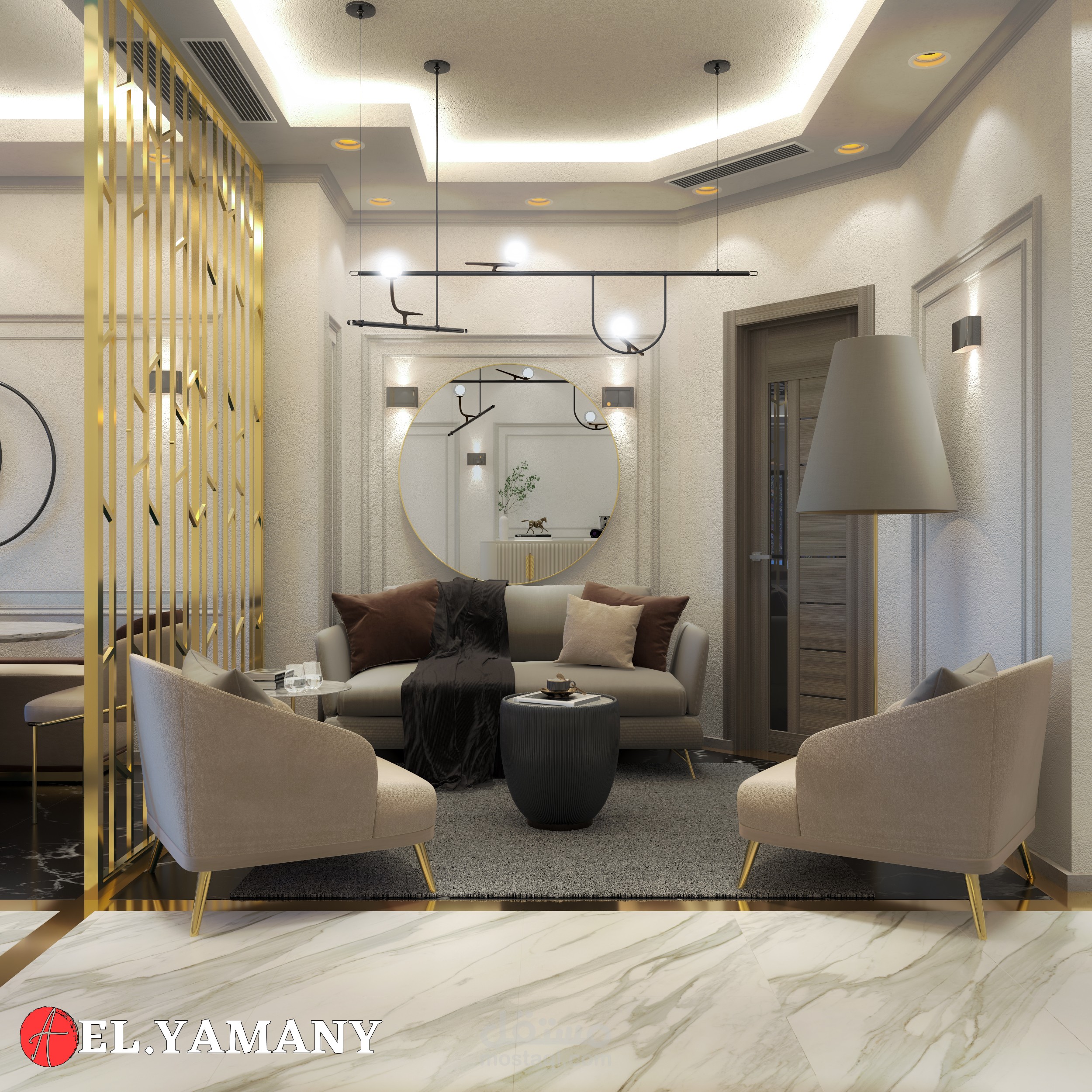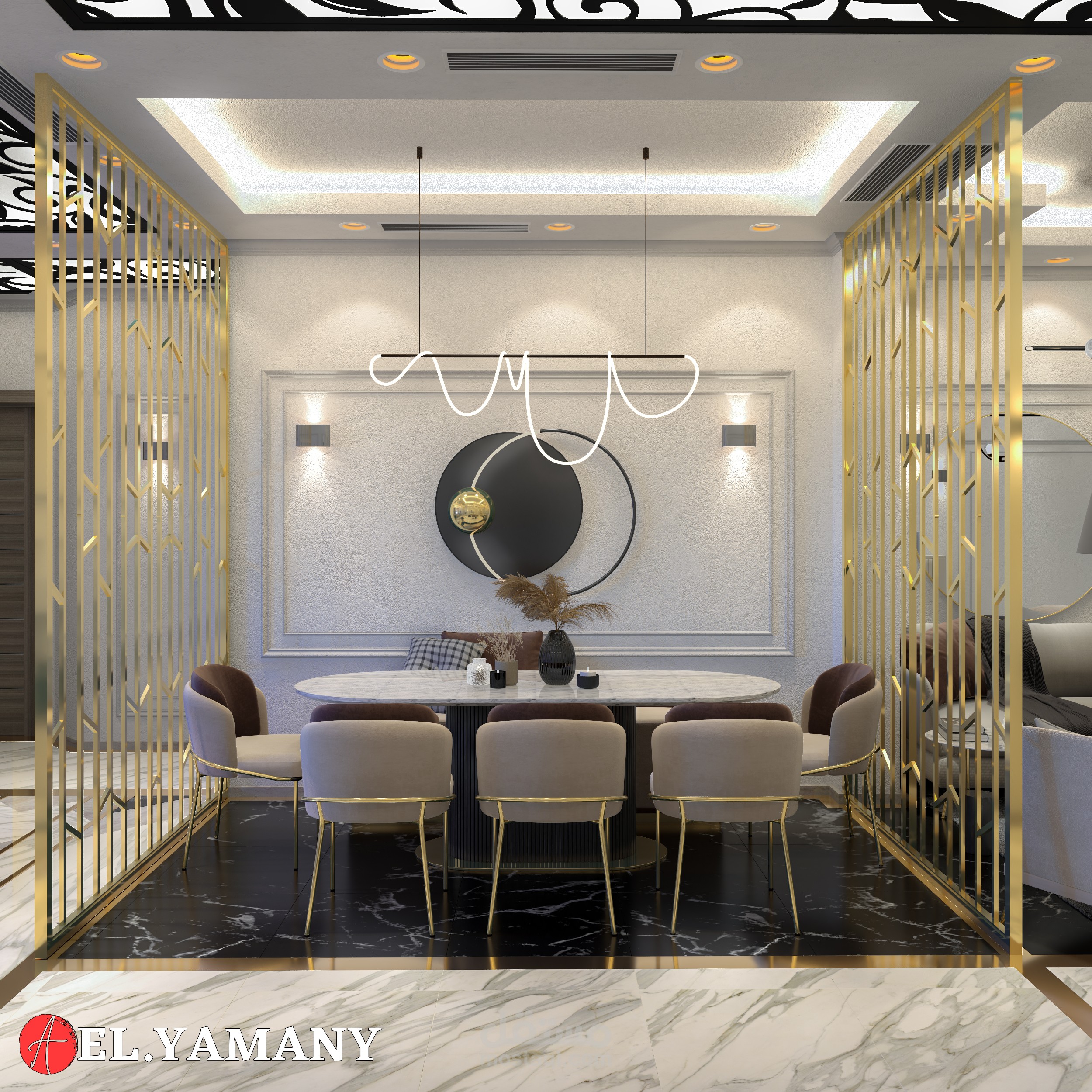 تصميم داخلي لliving room عباره عن 3 قطع جزء living & جزء طاوله طعام & جزء استقبال صغير&طرقه داخليه للغرف