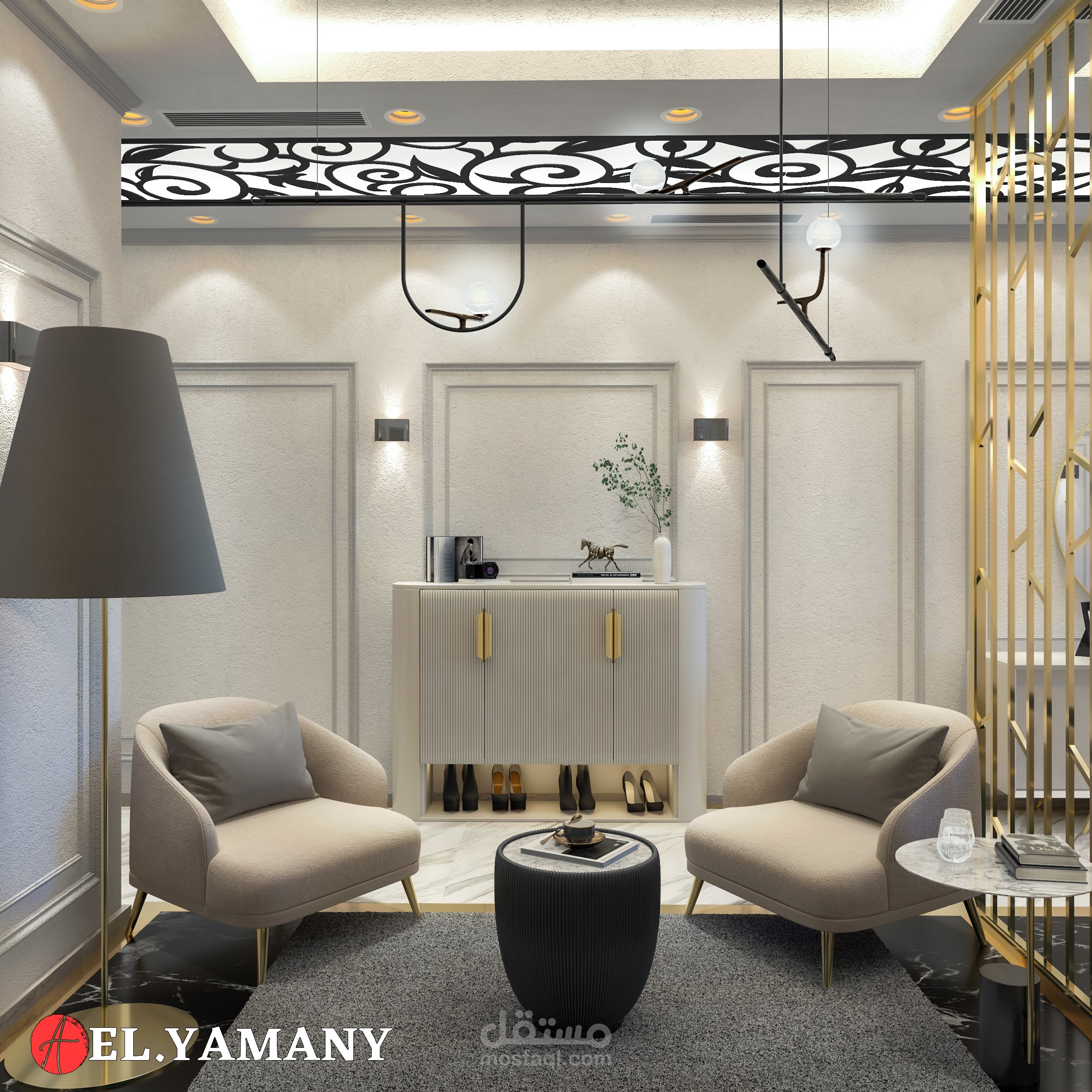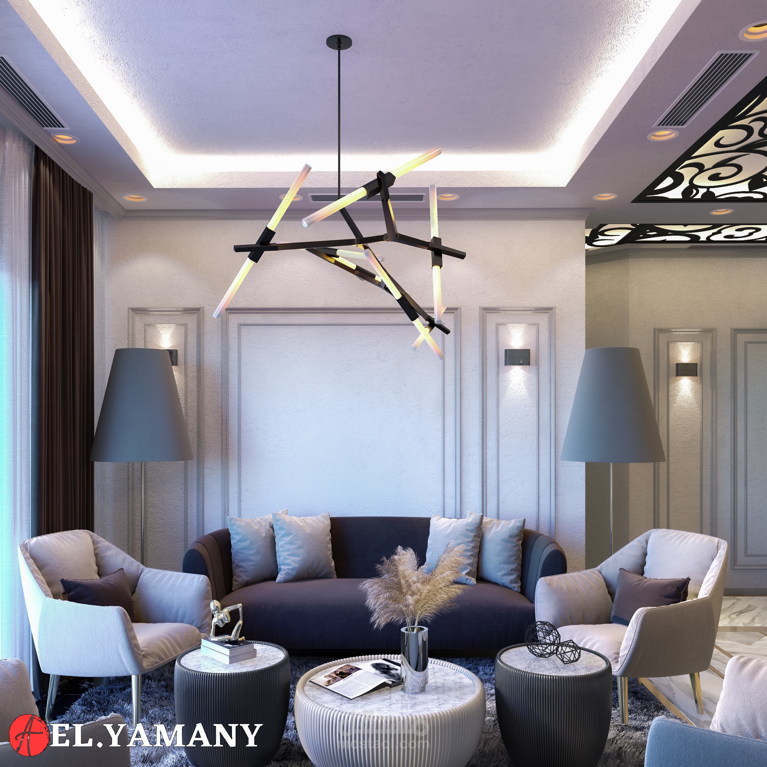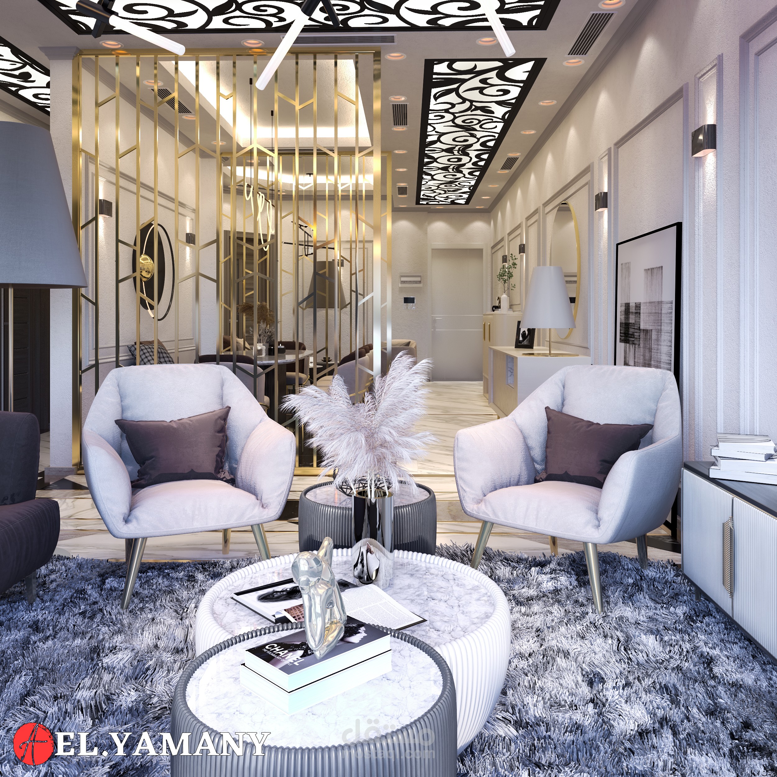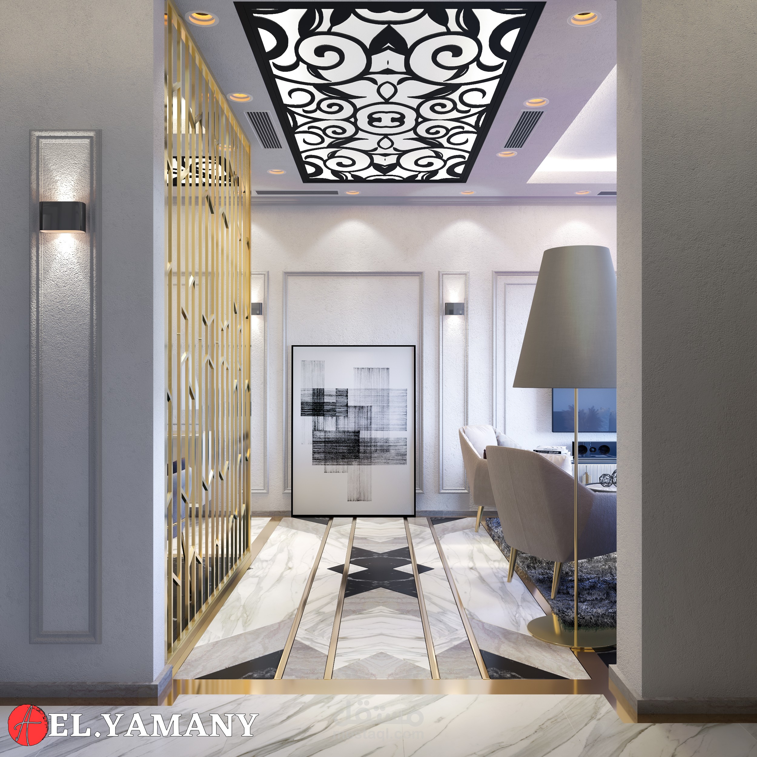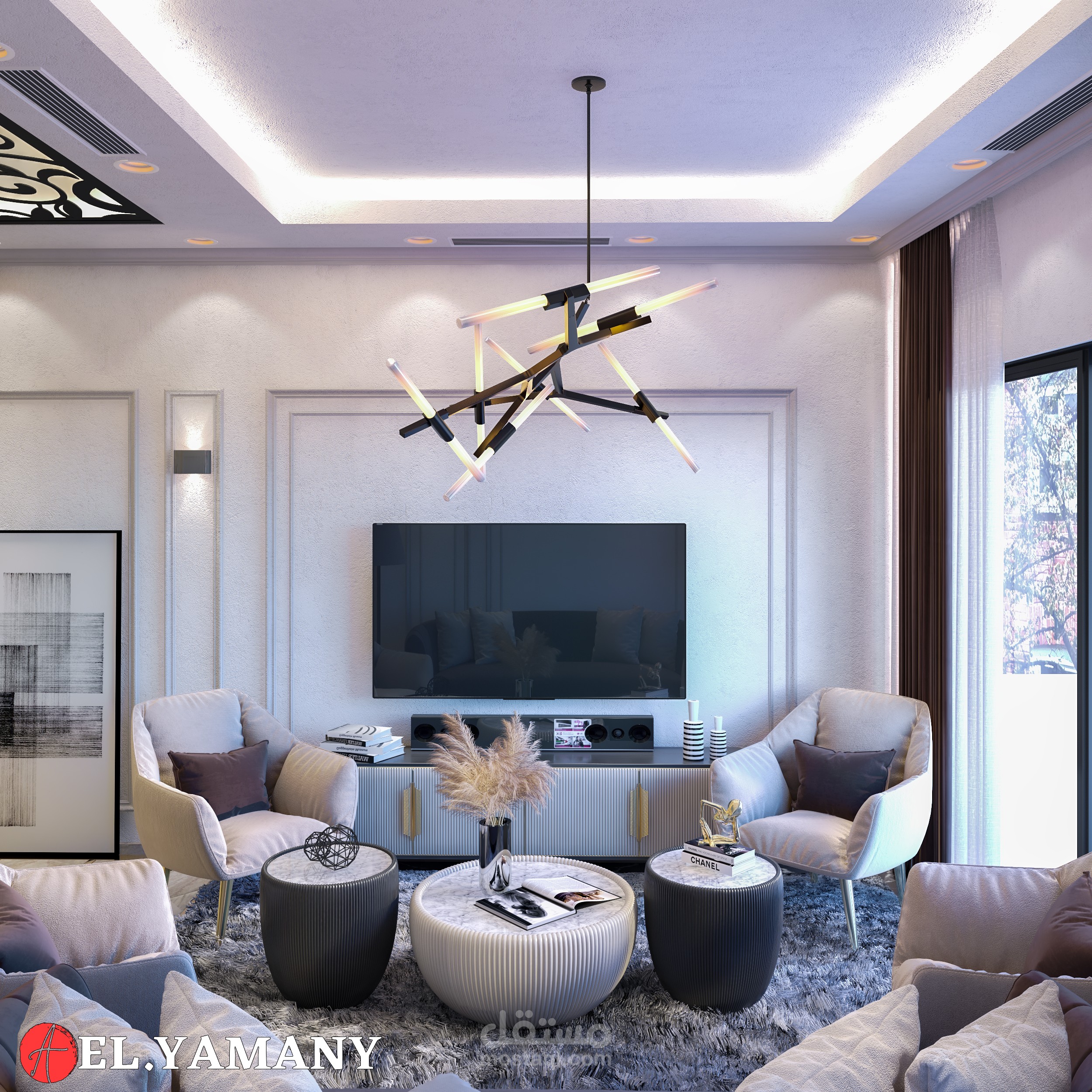 تصميم داخلي لliving room عباره عن 3 قطع جزء living & جزء طاوله طعام & جزء استقبال صغير&طرقه داخليه للغرف
