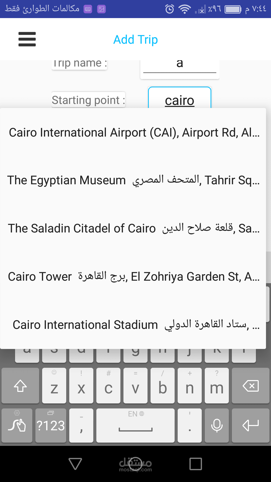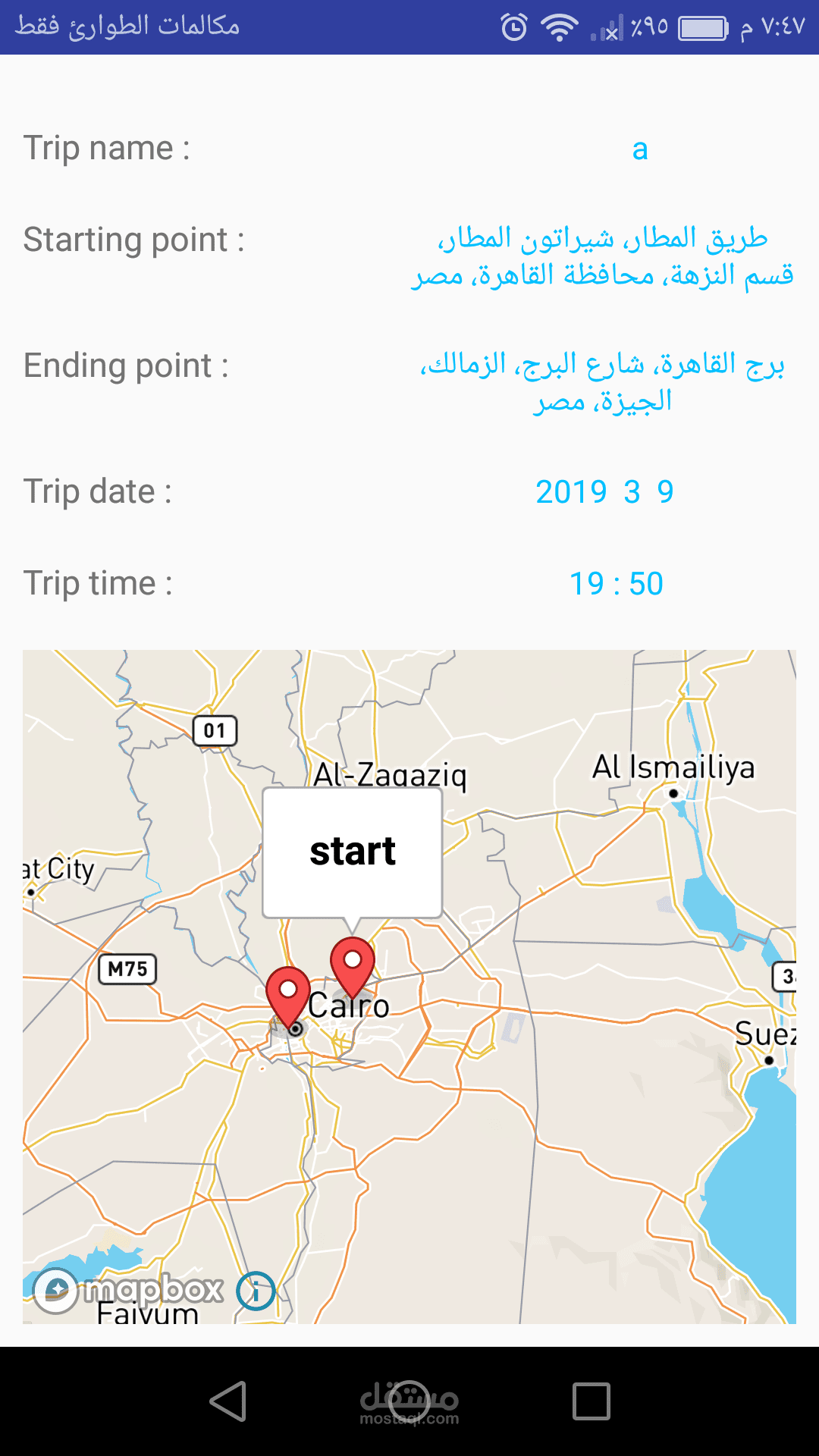 * التطبيق يتيح للمستخدم انشاء الرحلة في الميعاد الذي يريده المستخدم ويتيح له اختيار نقطة البداية والنهاية من خلال البحث عن المكان الذي يريده أو حتي بإختياره للمكان من خلال الخرائط.