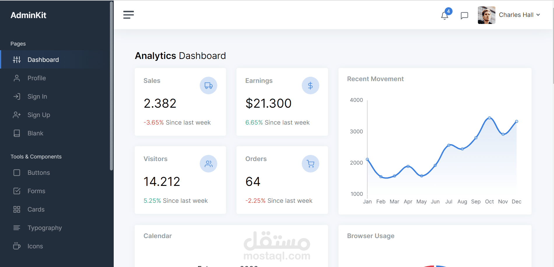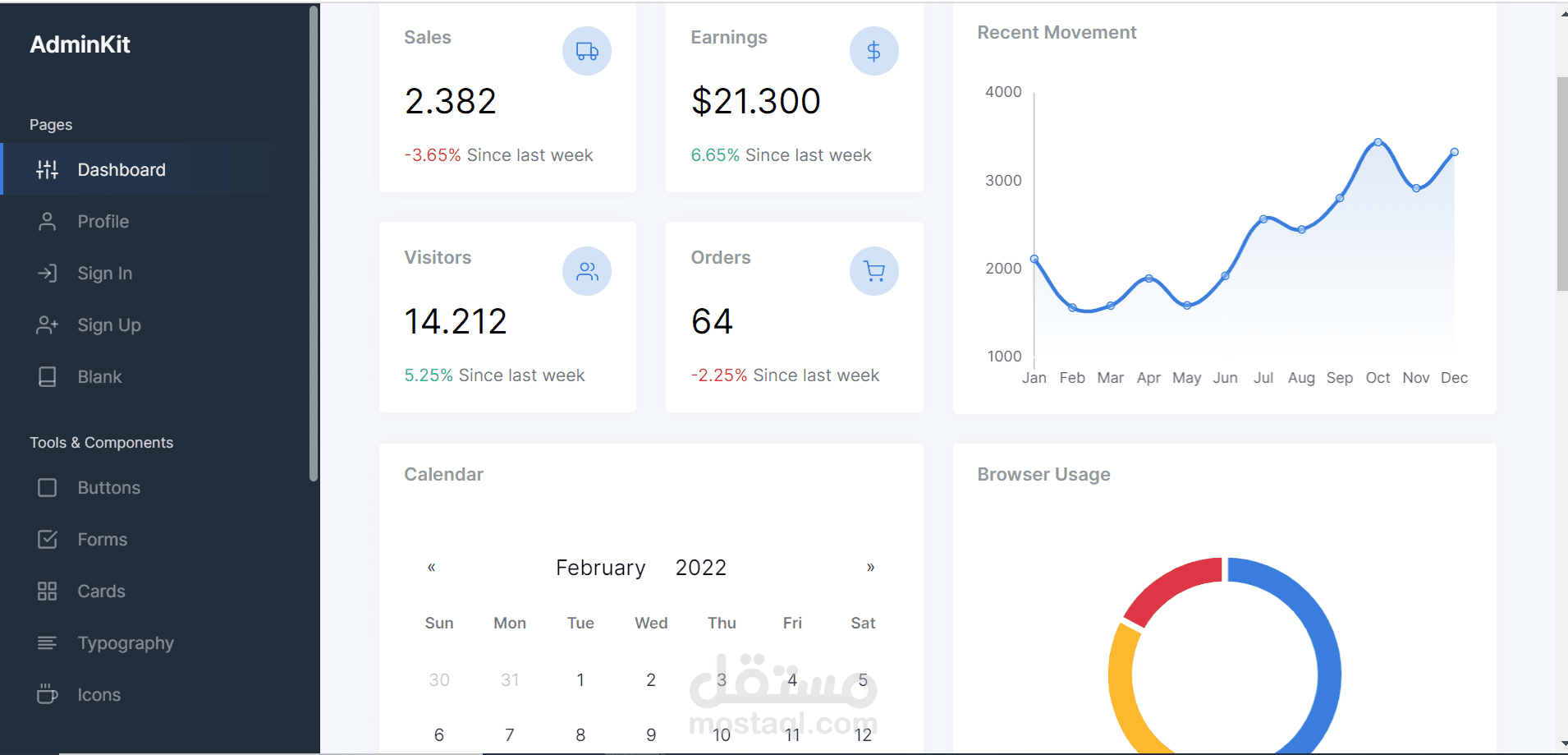قالب Bootstrap 5 لمجموعات واجهة المستخدم. AdminKit هو أكثر من مجرد قالب مسؤول HTML. هناك الكثير من الخيارات والإمكانيات التي يمكن أن تساعدك في تشغيل واجهة المستخدم الإدارية عبر الإنترنت. المظهر الجديد مستجيب بنسبة 100٪ ومُحسَّن جيدًا ومناسب لجميع المتصفحات وشاشات شبكية العين المتاحة.