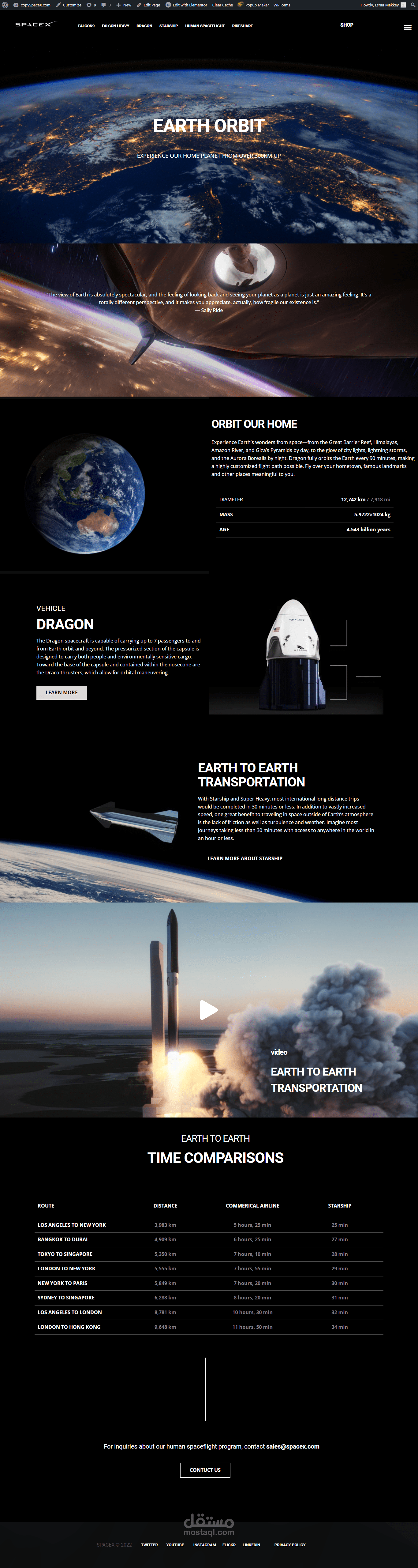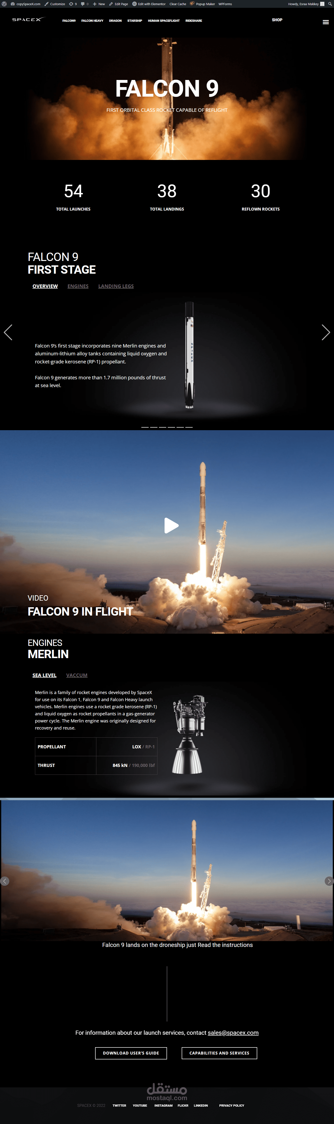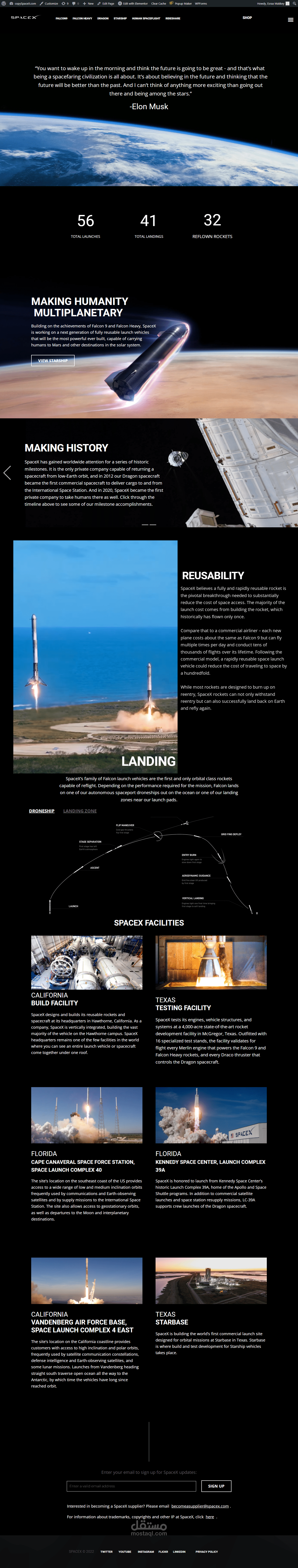 تصميم copy من موقع spacex باستخدام wordpress واستخدام Nicepage فى بناء الصفحات , Elementor لتصميم header و footer و ايضا استخدام plugins اخلرى مثل :popup maker للمساعدة فى اظهار الفيديو و فتحه فى نفس الصفحة ز