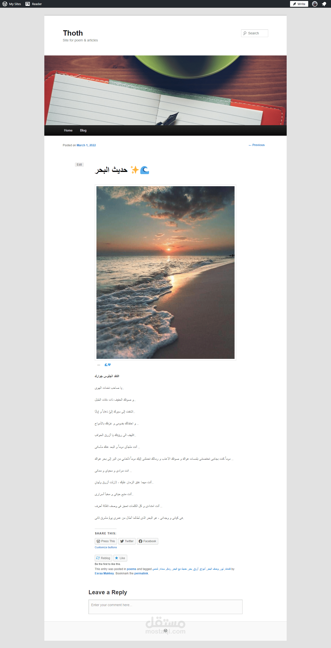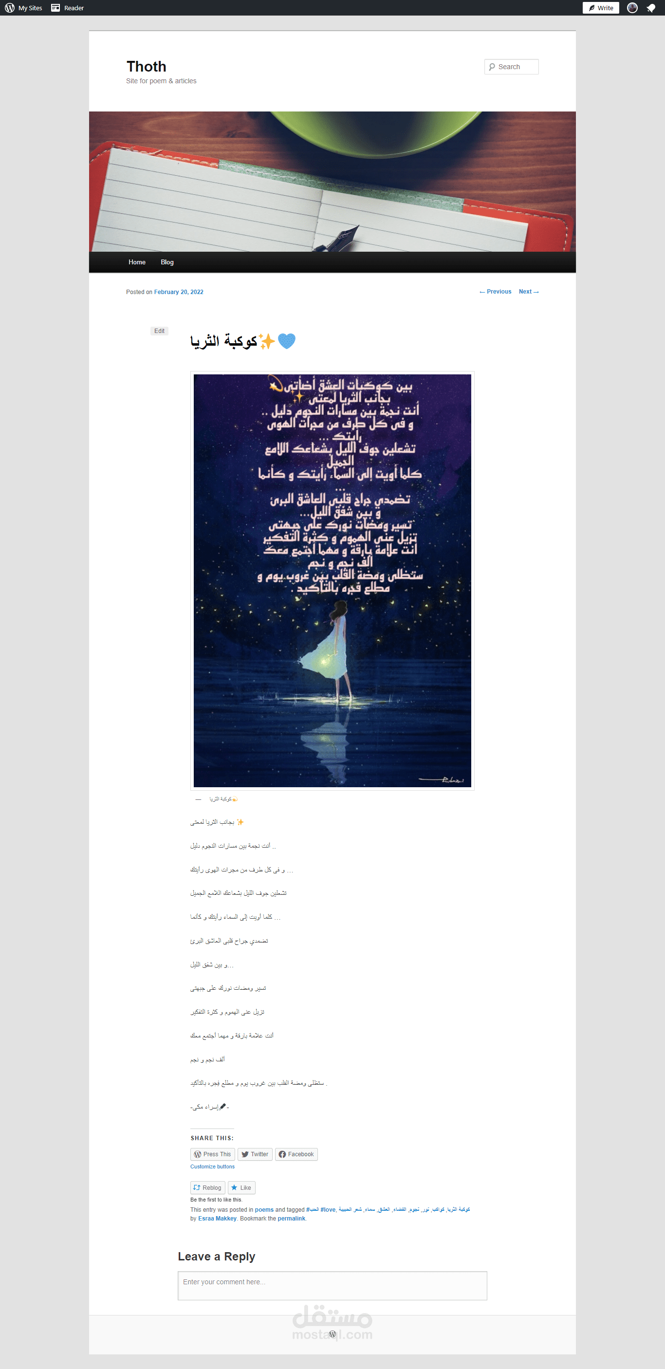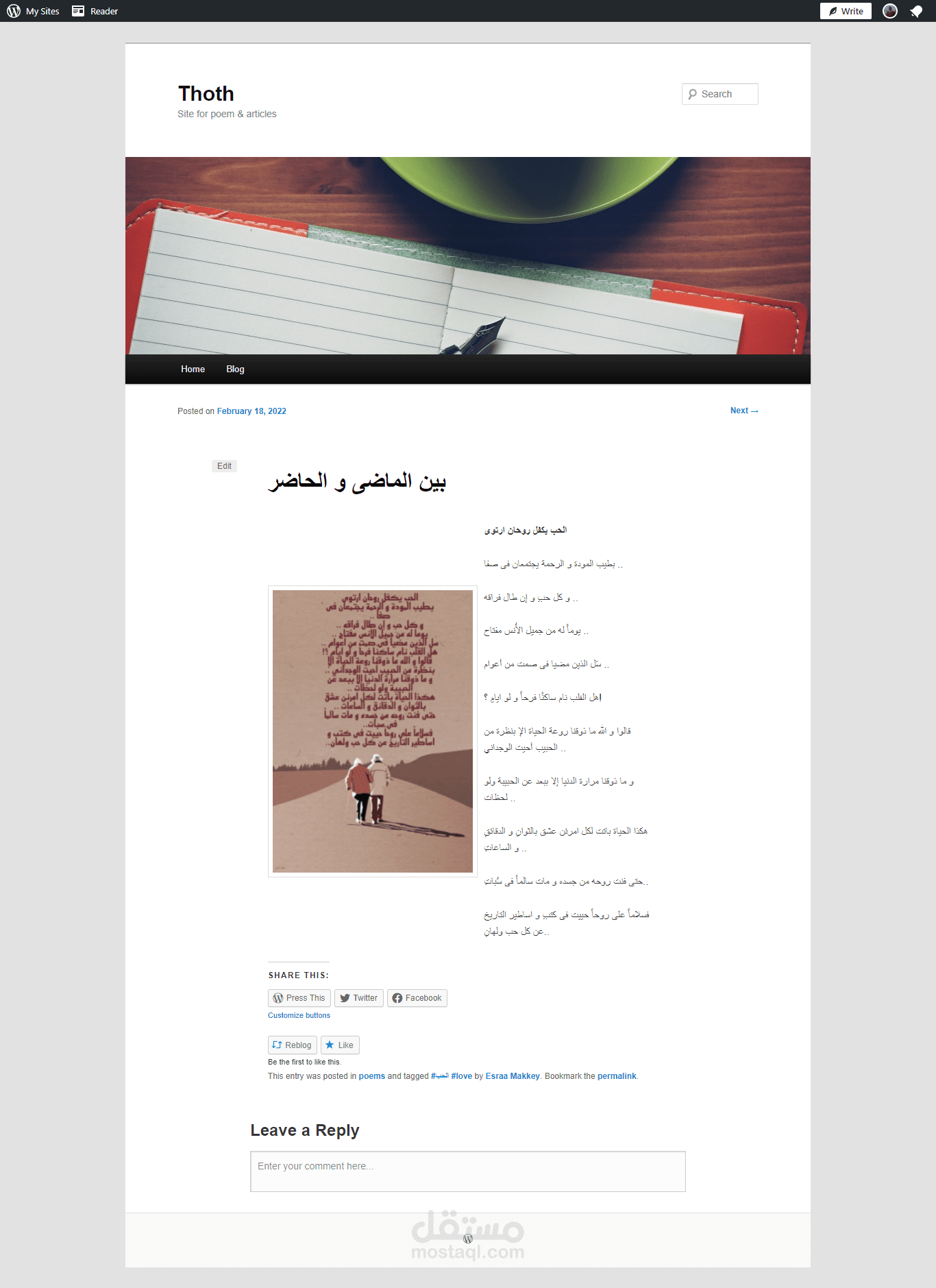 تصميم blog خاص بتدوين و نشر الشعر و المقالات الخاصة بى باستخدام wordpress واستخدام host & domain مجانى من موقع wordpress.com