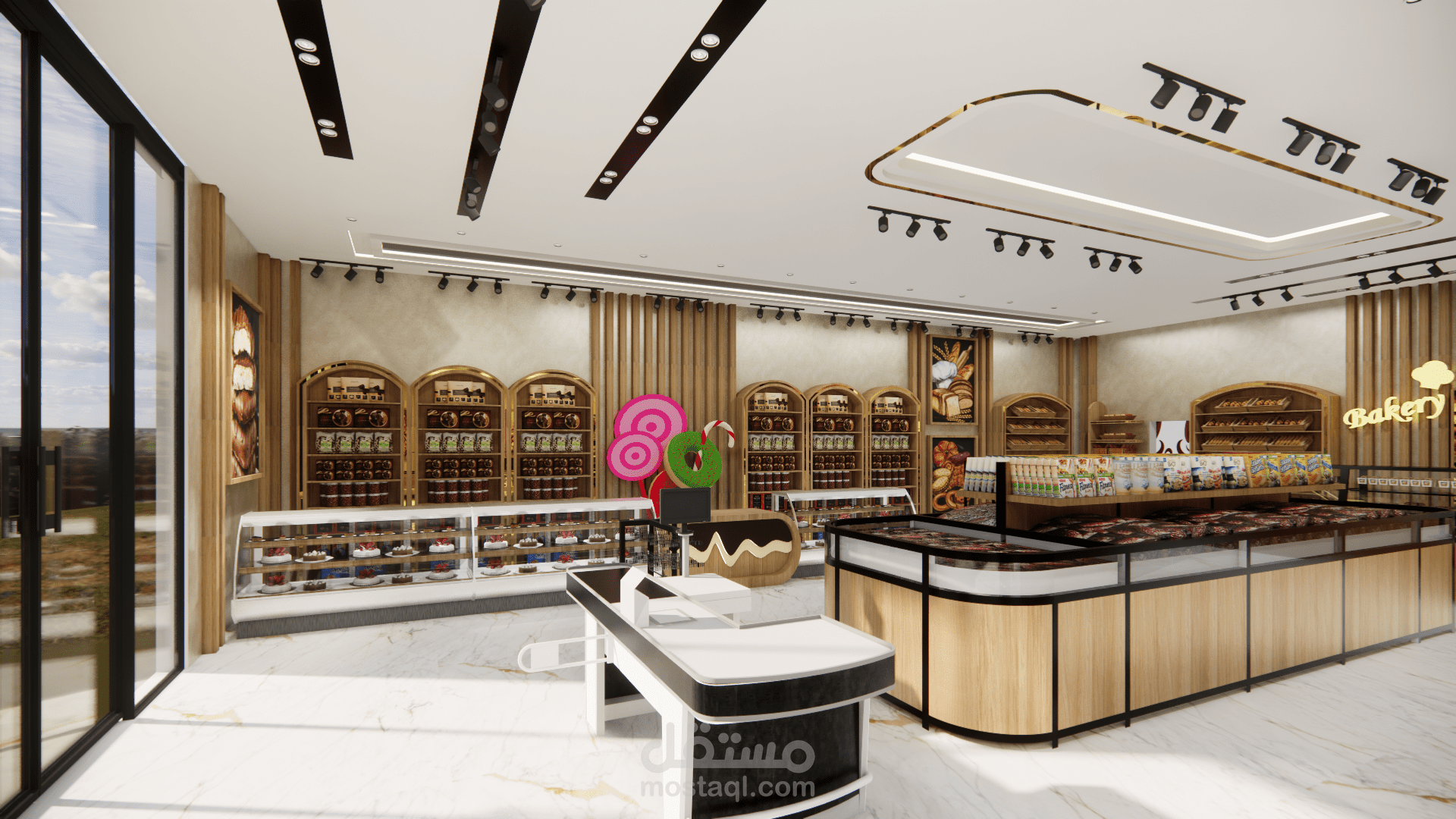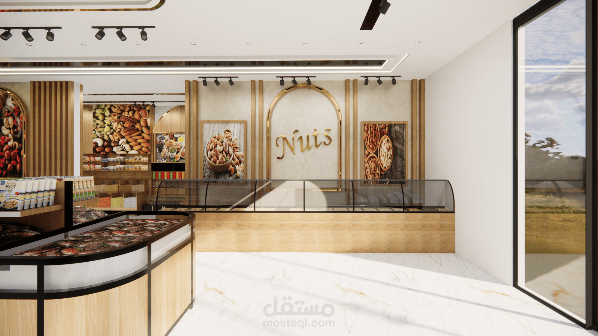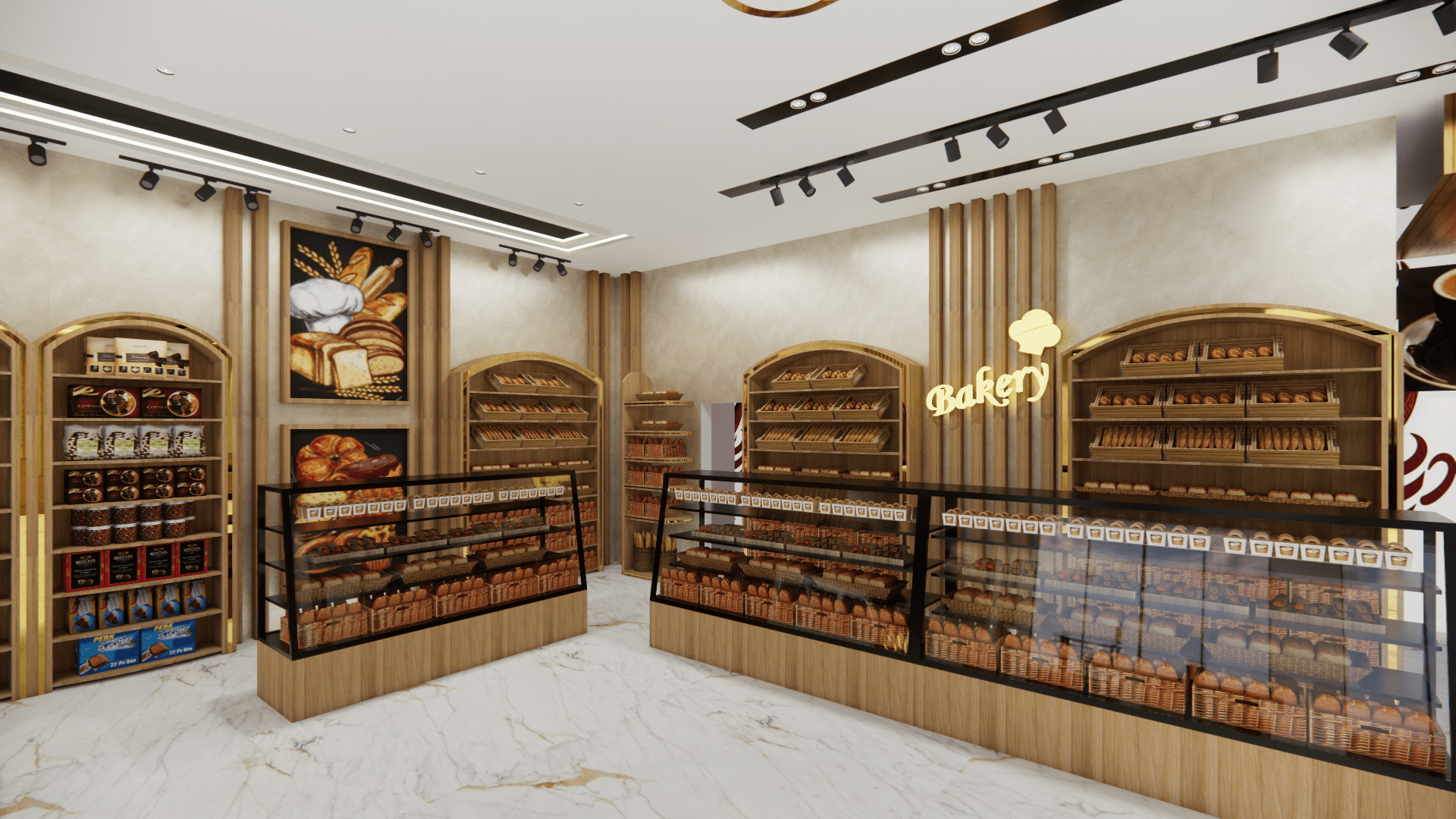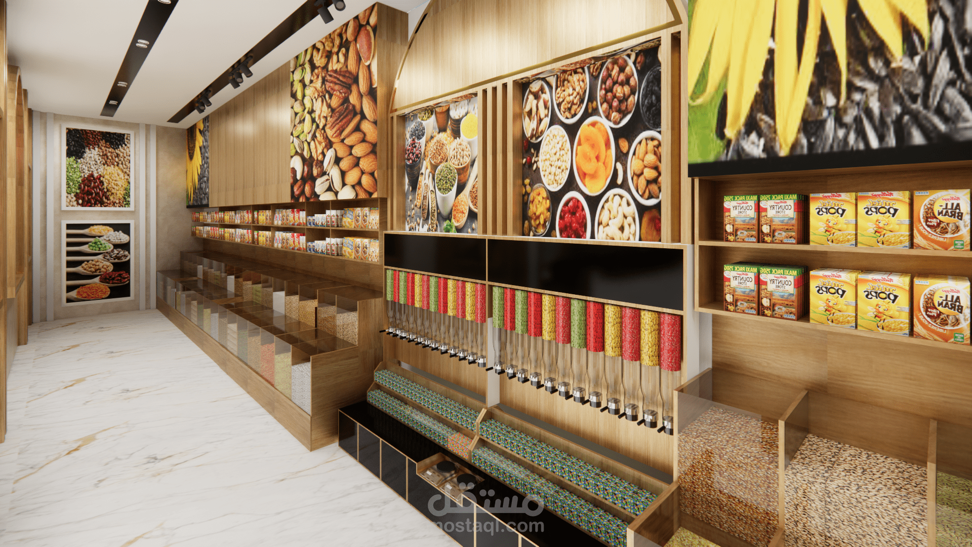 تصميم داخلي لسوبر ماركت تتكون من مساحة لعرض المنتجات ومساحة لمخبز صغير وكوفي صغير وقسم لبيع البقوليات