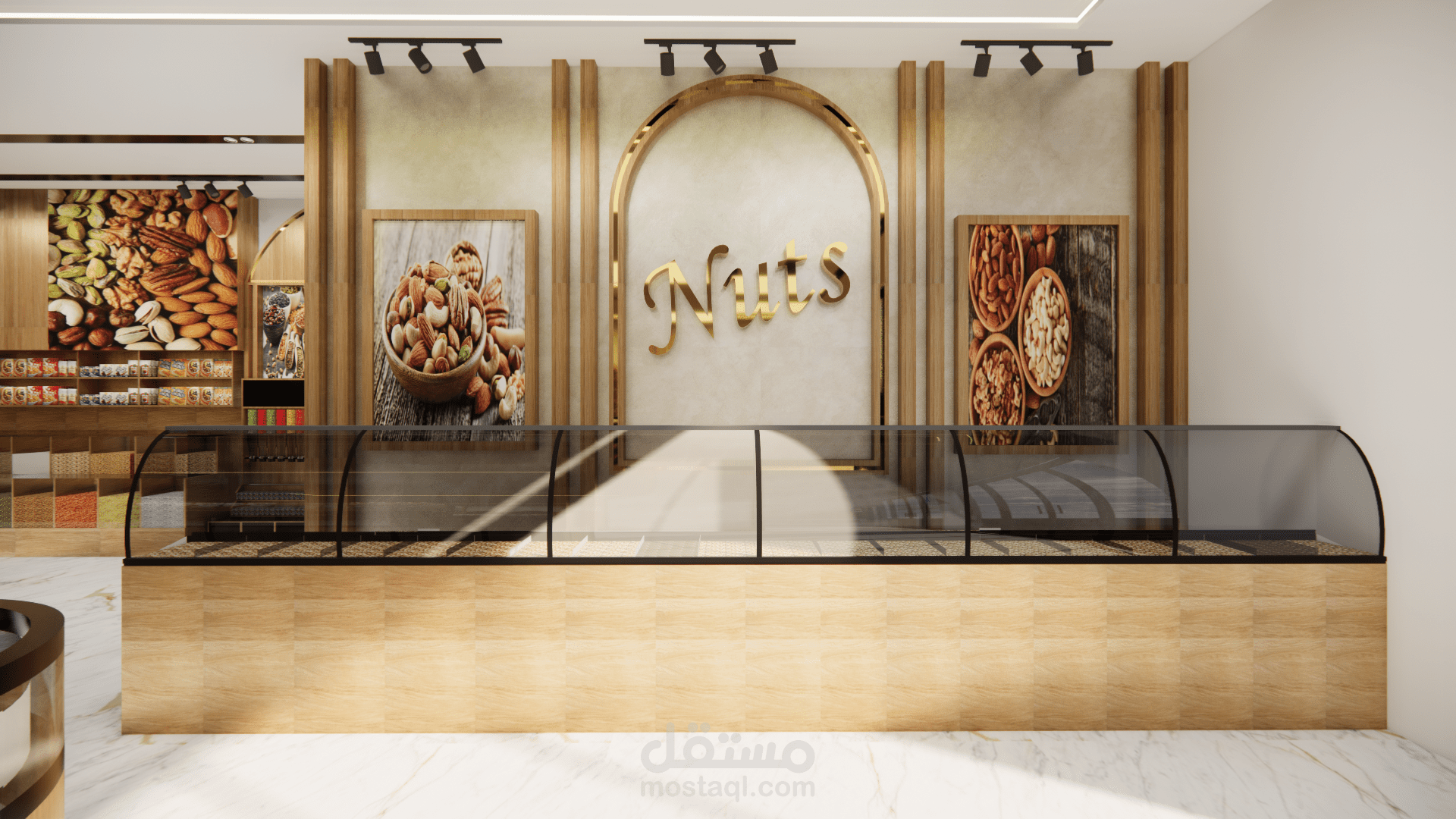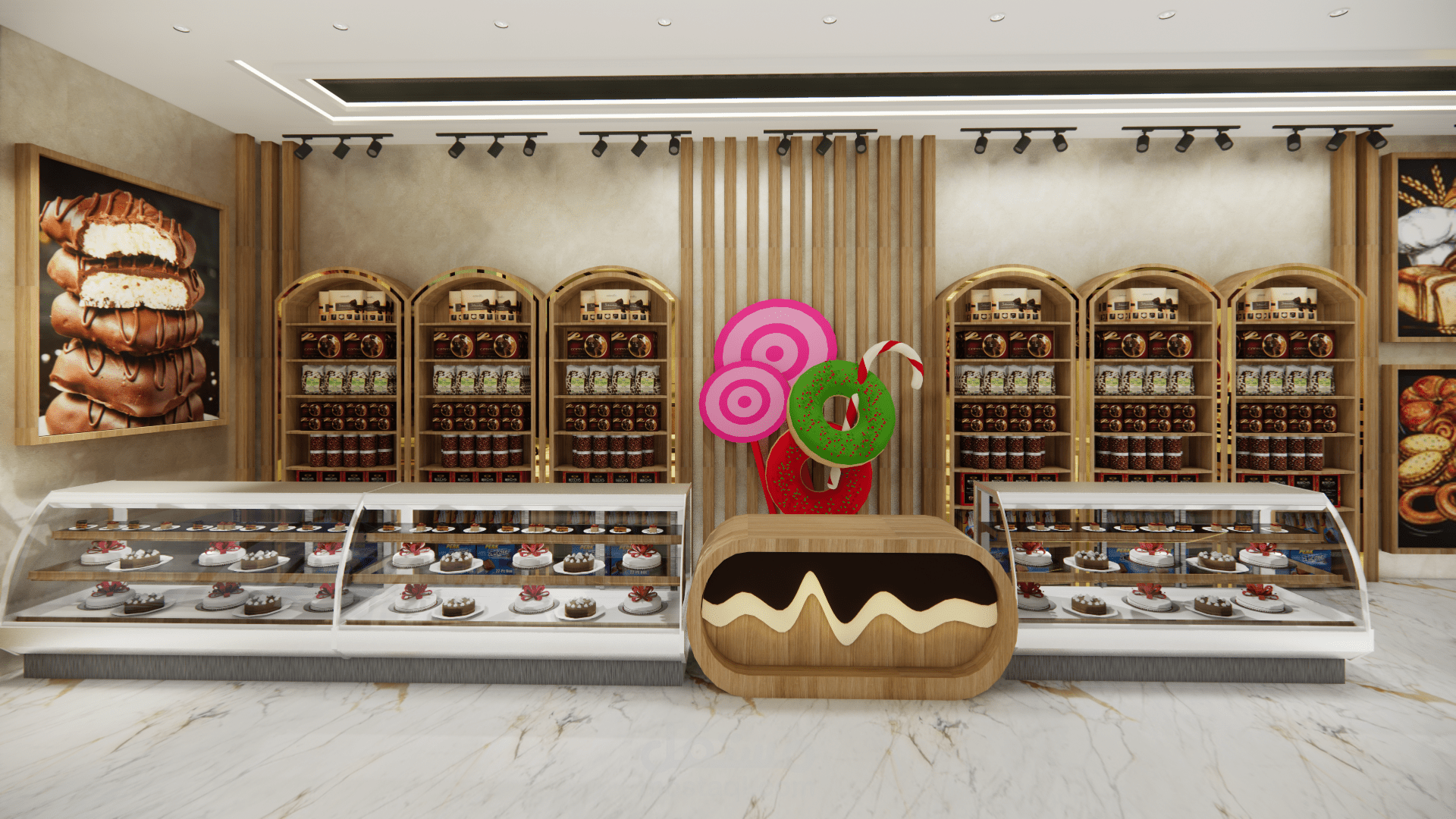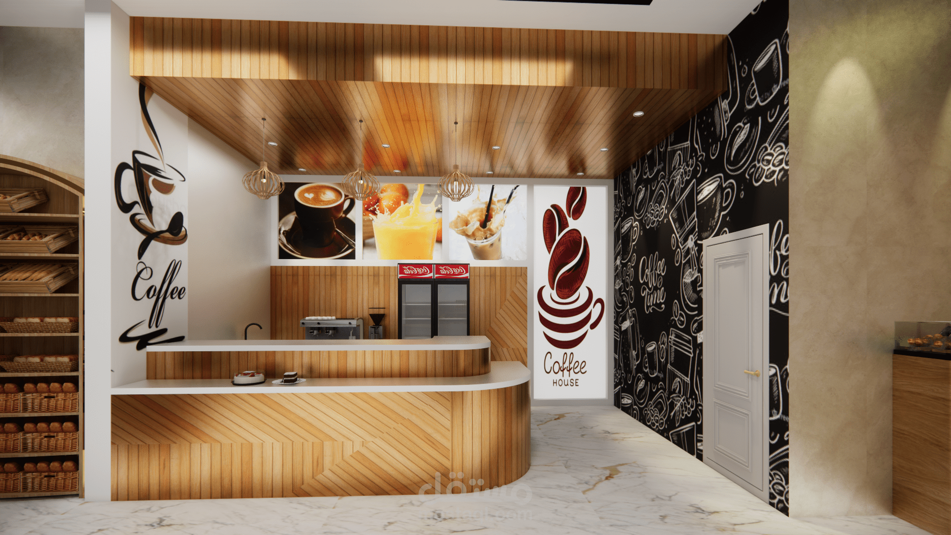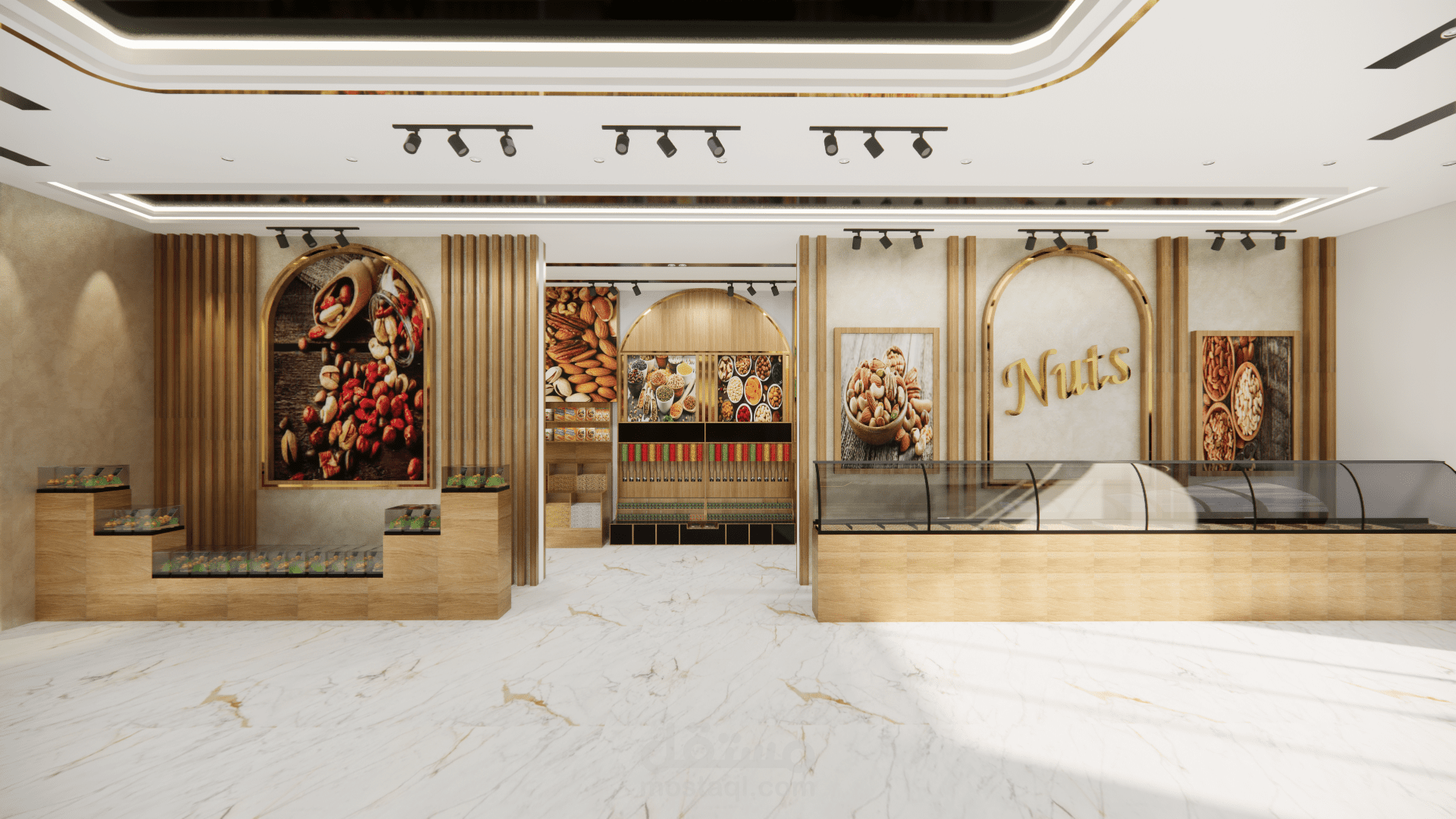 تصميم داخلي لسوبر ماركت تتكون من مساحة لعرض المنتجات ومساحة لمخبز صغير وكوفي صغير وقسم لبيع البقوليات