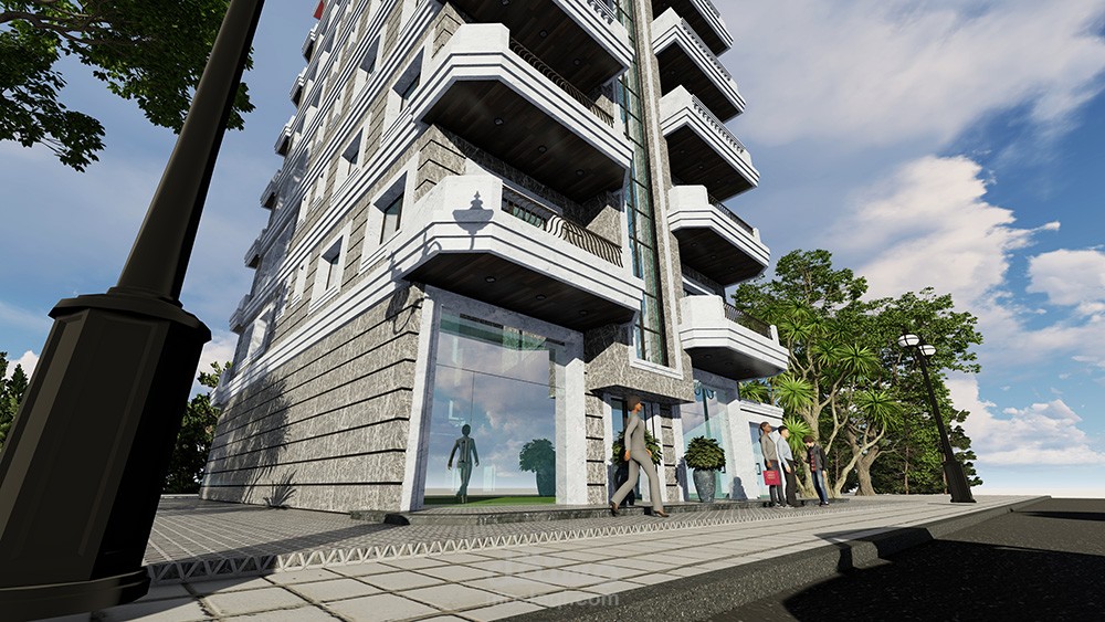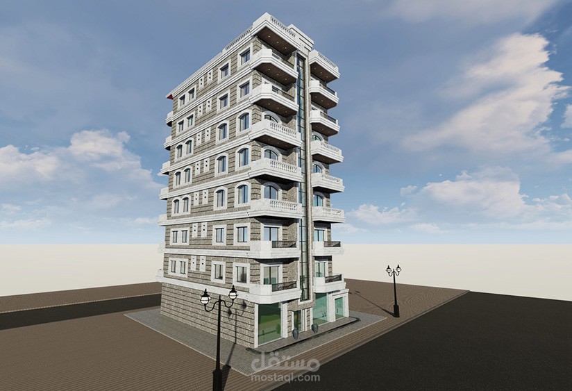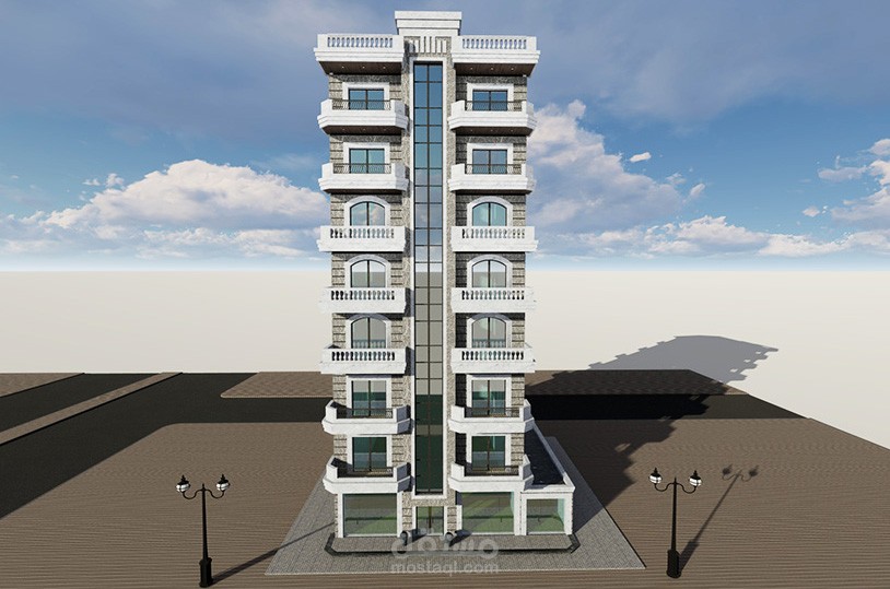 البناء في مدينة جبلة ،مكون من ثمانية طوابق، الطابق الأرضي عبارة عن مخازن تجارية وغرفة حارس، الطابق الأول عبارة عن طابق مكاتب، الطوابق المتكررة مخصصة للسكن ، كل طابق شقتين سكنيتين، أما السقف الأخير فهو سقف جمالوني مع قسم أفقي