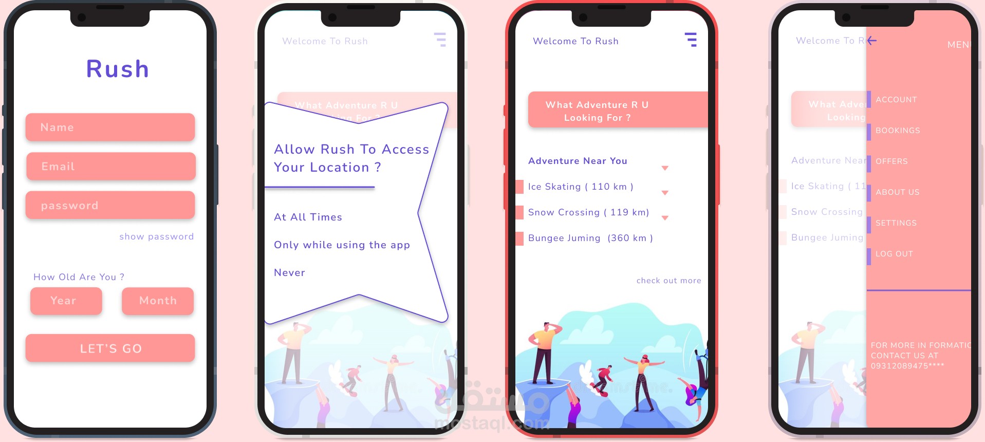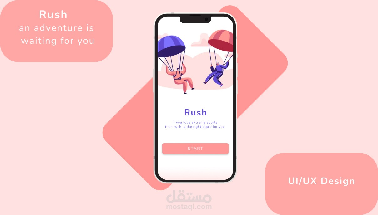 مشروع UI / UX لتطبيق يسمى RUSH ، وهو تطبيق يساعد في حجز المغامرات ويظهر أقرب المواقع لنا .