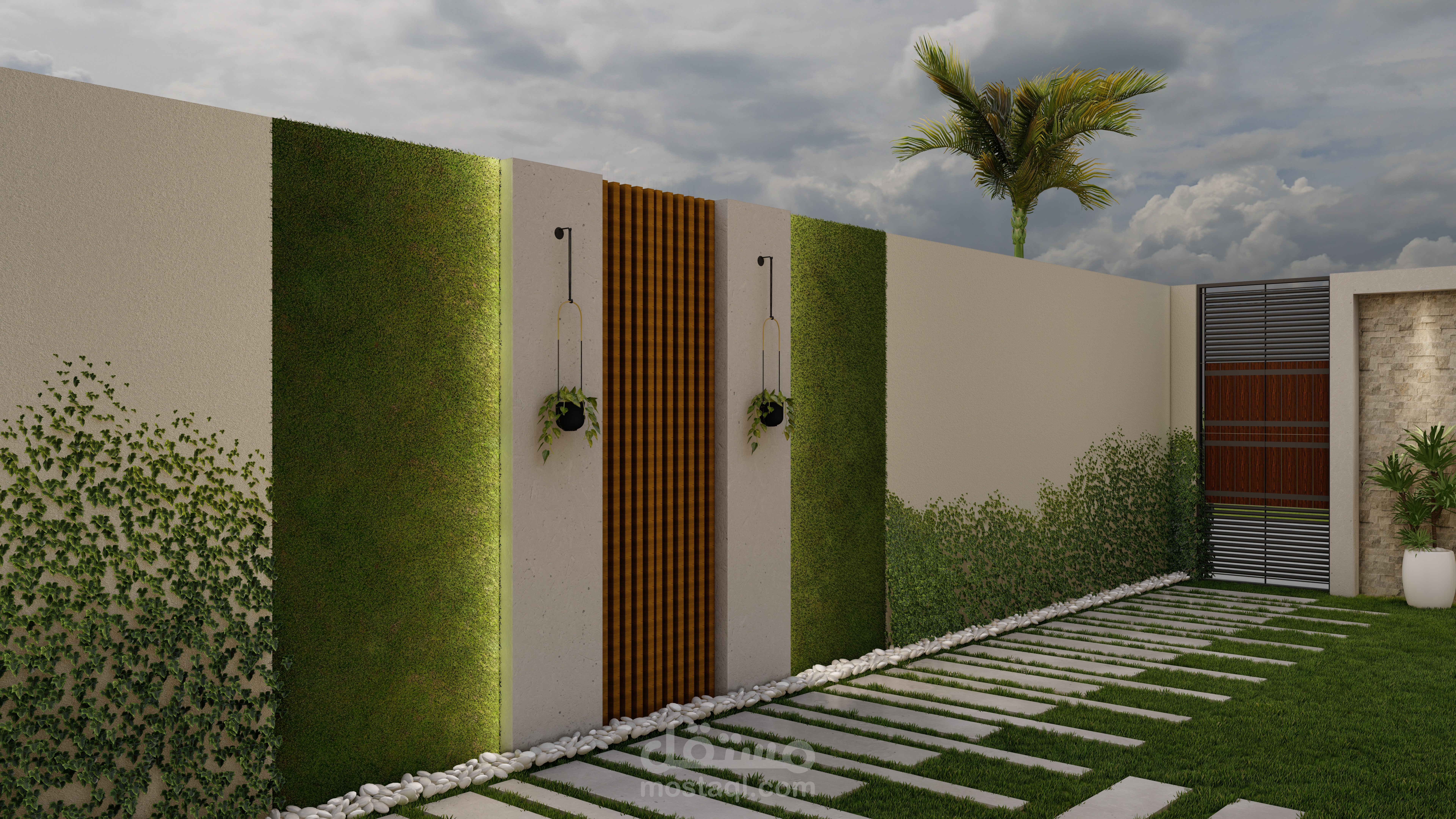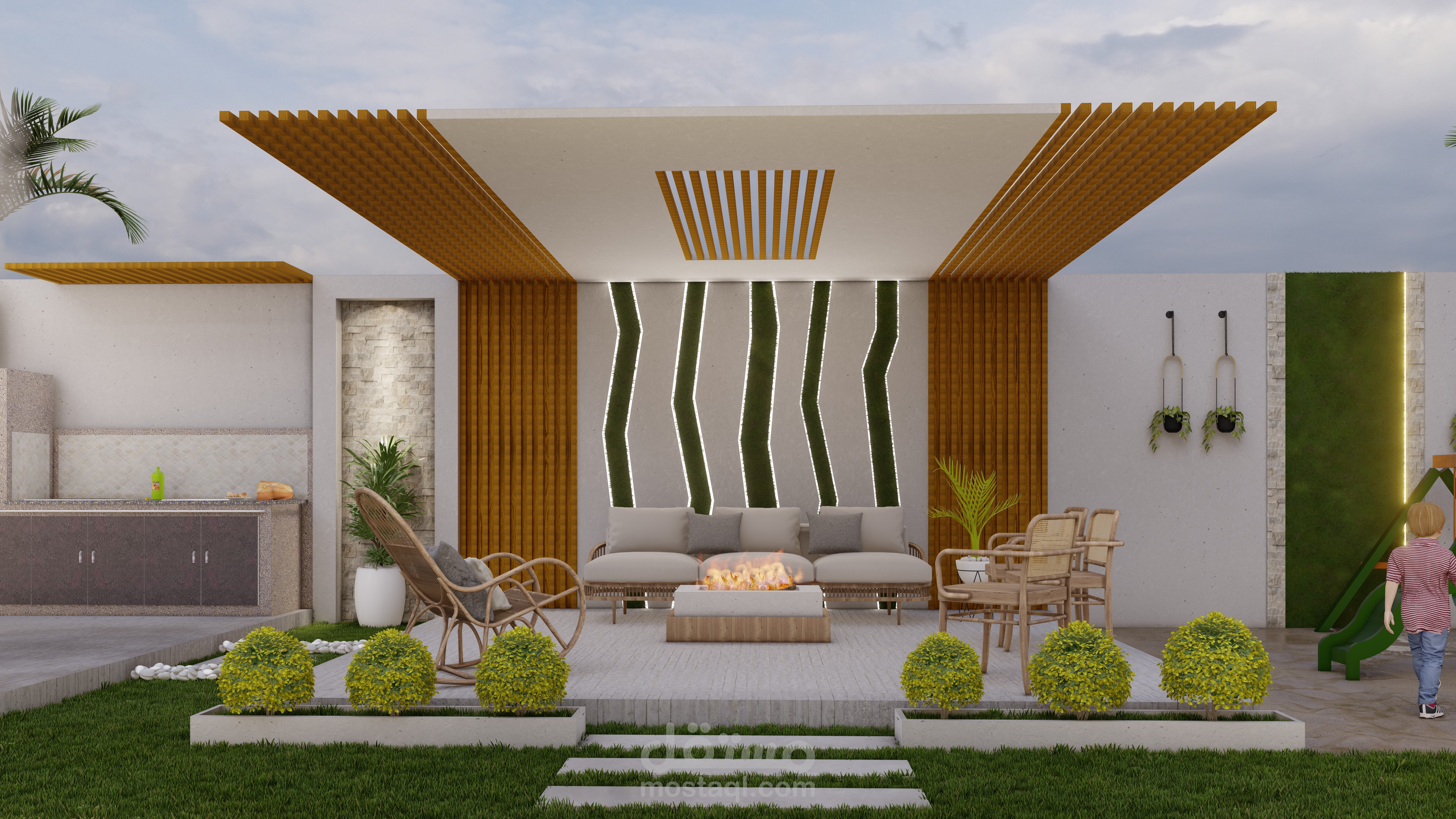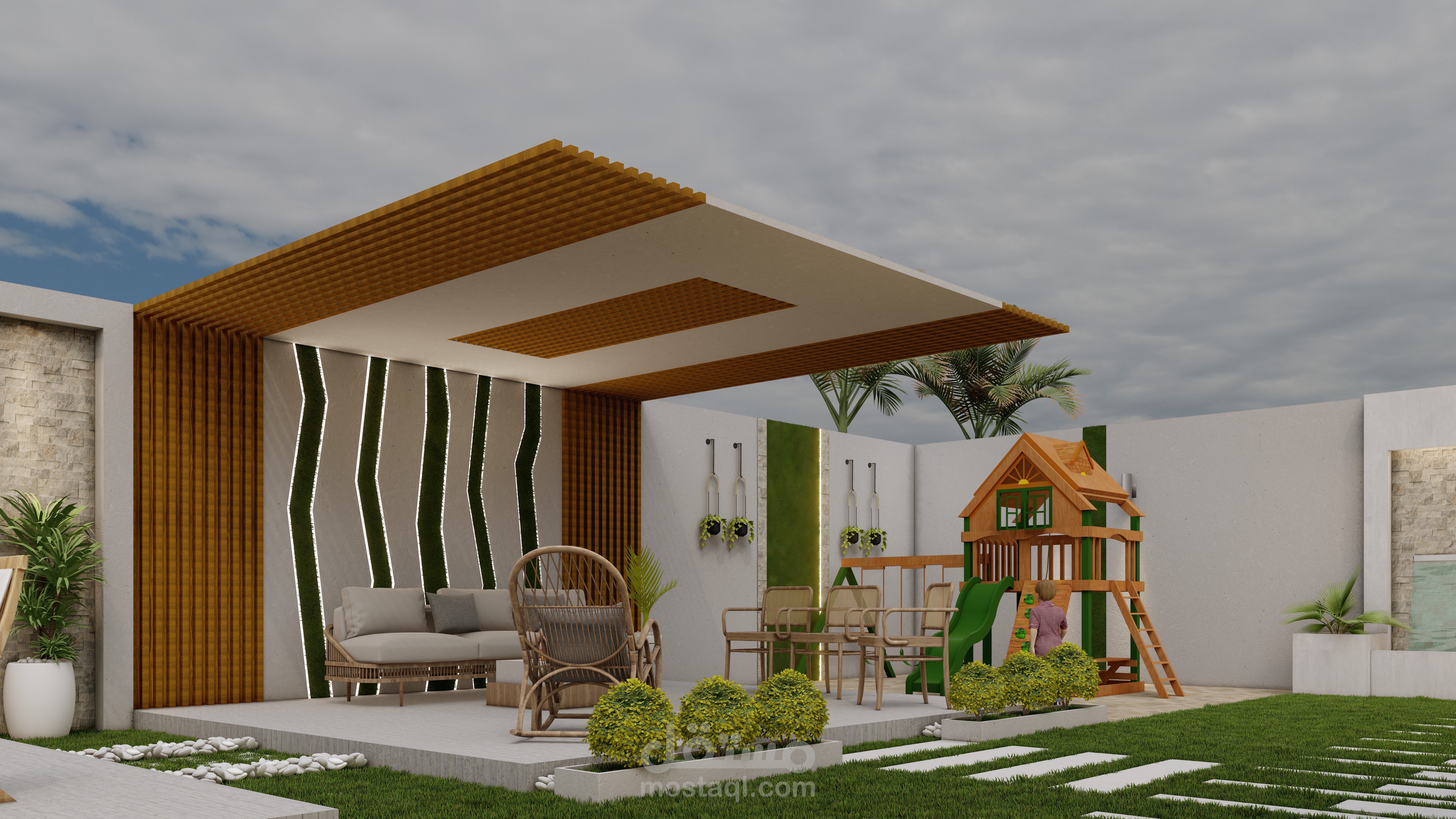 التصميم الابداعي واستغلال المساحات بطريقة مدروسة ... تصميم حديقة بمساحة 9*15م تضم جلسة مظللة مع منطقة شواء ومنطقة لعب اطفال يتخللها المساحات الخضراء