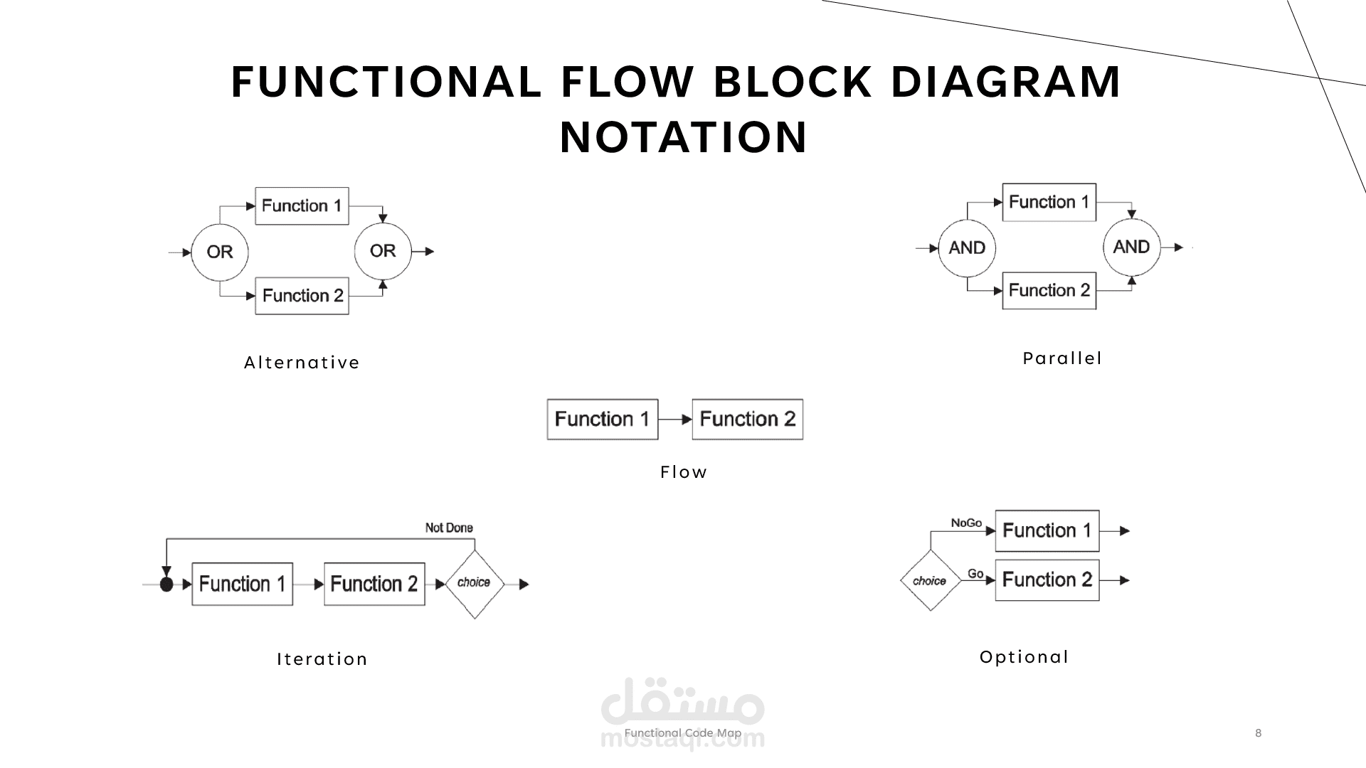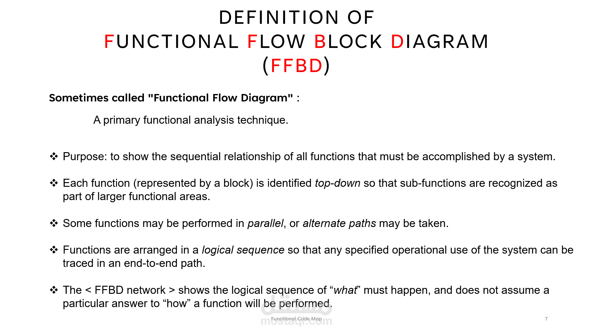 The < FFBD network > shows the logical sequence of “what” must happen, and does not assume a particular answer to “how” a function will be performed.