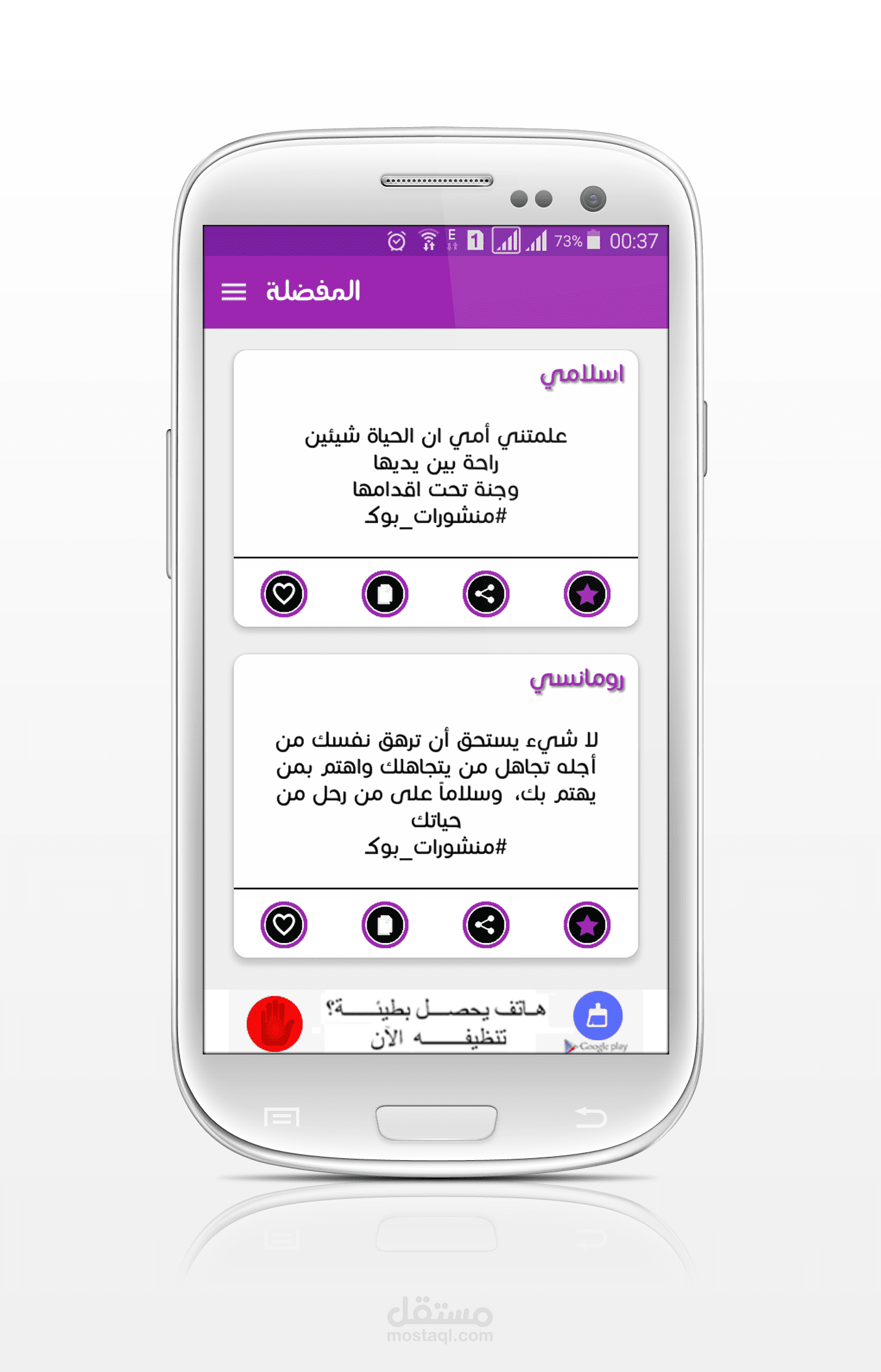 5- وجود اقسام ( رومانسي - اسلامي - نكت - حالات واتساب ) ويوجد في كل قسم مجموعة كبيرة من المنشورات ويتم تحديثها يومياً