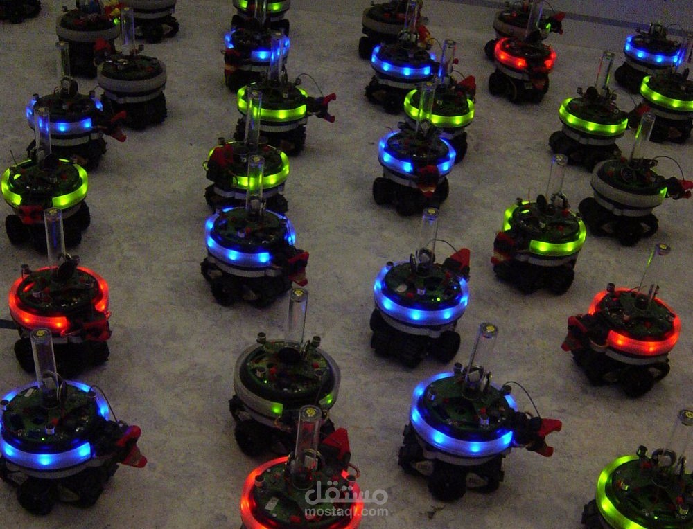 مجموعة من الروبوتات الأرضية تتحرك جميعها بحركة متناسقة بمسارات معينة دون الاصطدام ببعضها متجاوزةً كل العوائق، مع وجود الpath planning المتمثل بخوارزمية *A والكاميرا التي تراقب الحركة ومواقع الروبوتات من الأعلى تستطيع الذهاب للهدف بأقصر طريق ممكن. مطورة باستخدام نظام تشغيل الروبوتات ROS و باستخدام المتحكمات esp32 من أجل التحكم وتأمين الاتصال عبر الwifi.