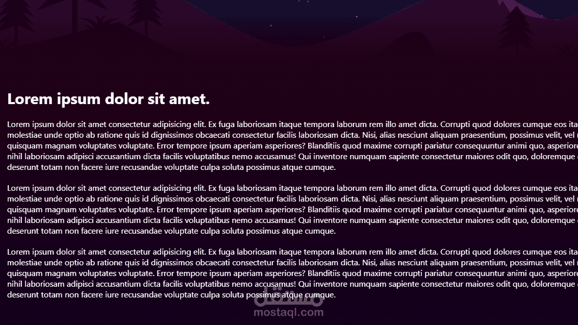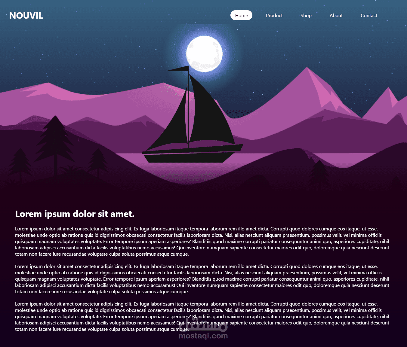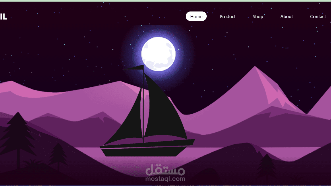صفحة موقع ويب تظهر فيها النجوم والقمر والمركب ليلا وعند التمرير لاسفل يبدا المركب فى التحرك وكذلك النجوم تختفى تدريجيا والقمر ويبدا نور الصباح فى السطوع.