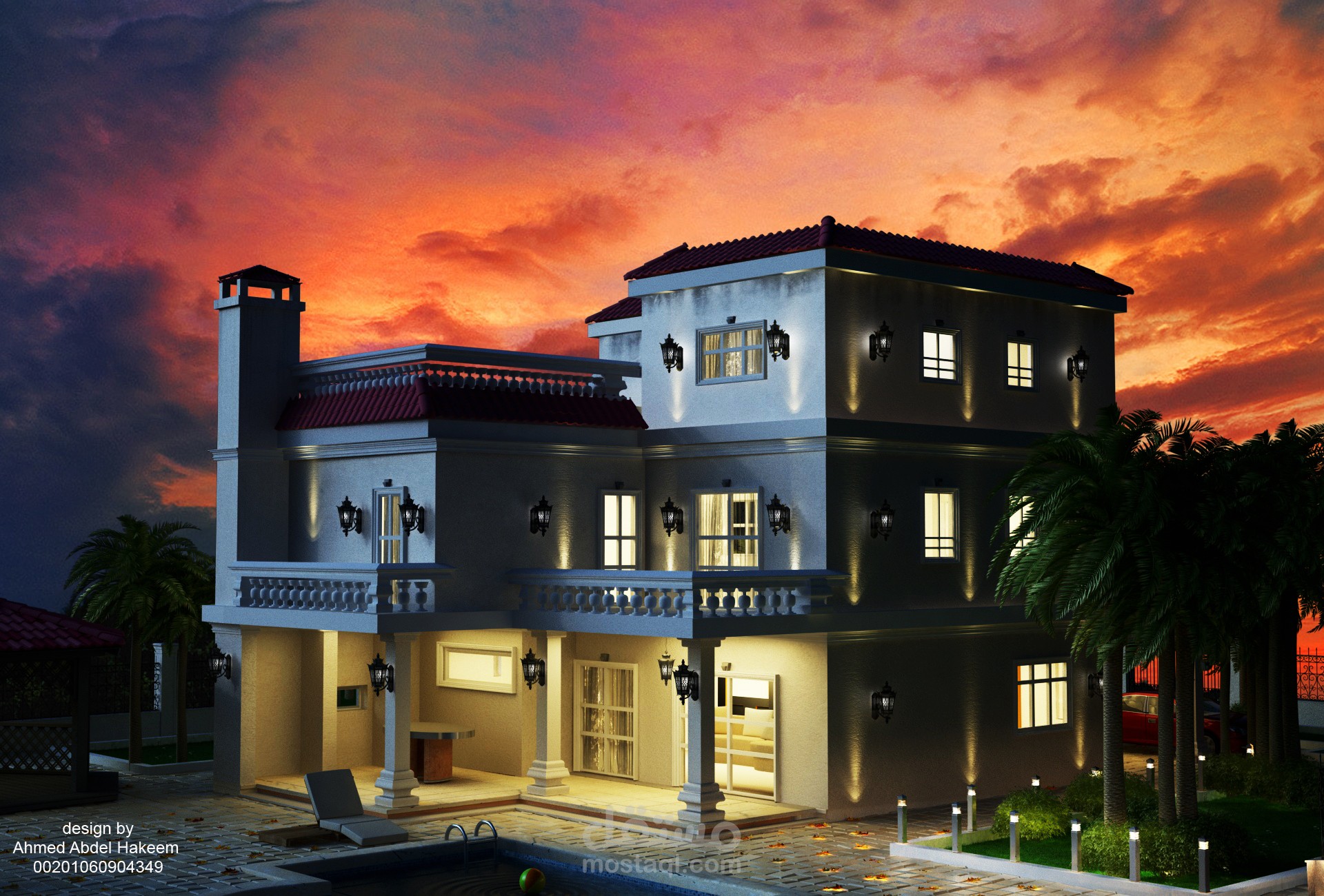 تصميم لمشهد خارجى لفيلا مع لقطة نهارية واخرى ليلية و ثالثة للمدخل