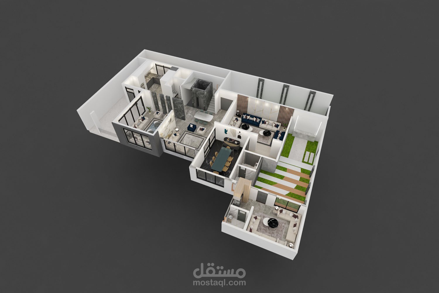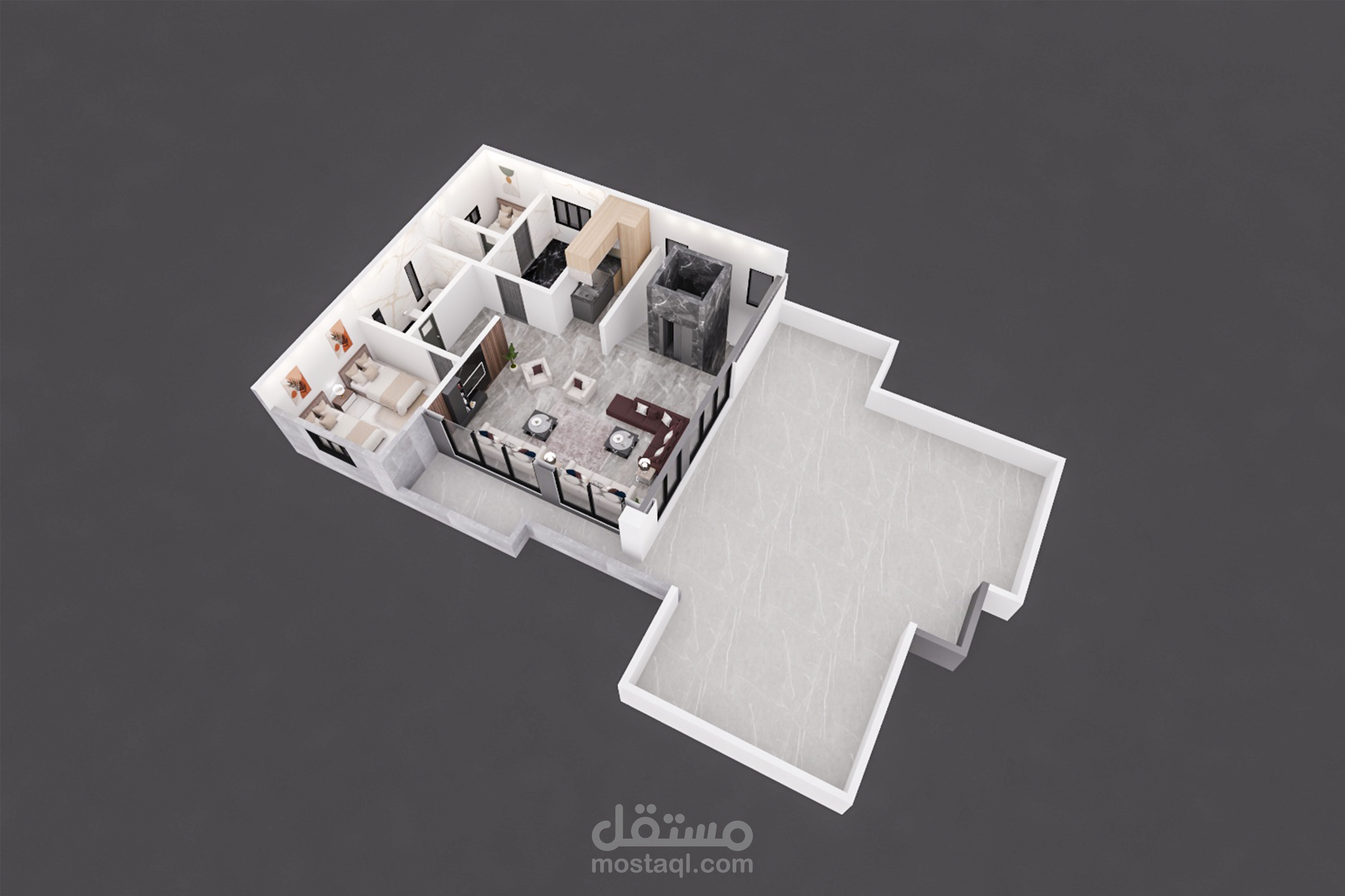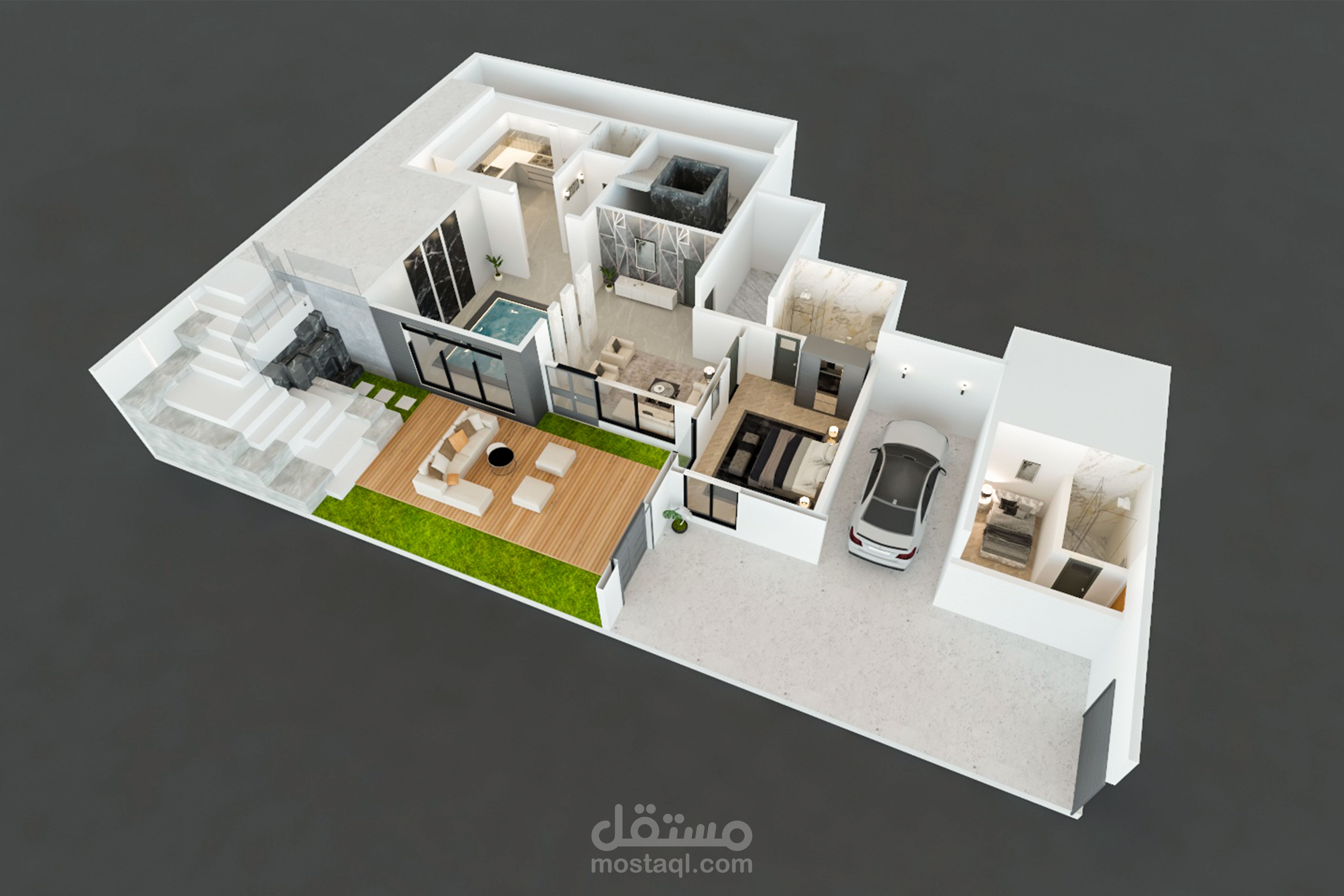 فيلا سكنية مكونة من دور بدروم ودور أرضي وأول وملحق، المساقط ثلاثية الأبعاد تعطي تصور مبدأي عن توزيع الفرش في جميع الأدوار ،تم اعتماد الطراز الموديرن في اختيار الوان الفرش وخامات الحوائط والأرضيات ليتمكن المالك من تكوين صورة مبدأية عن التصميم ككل قبل البدء في عمل التصميمات الداخلية للمشروع