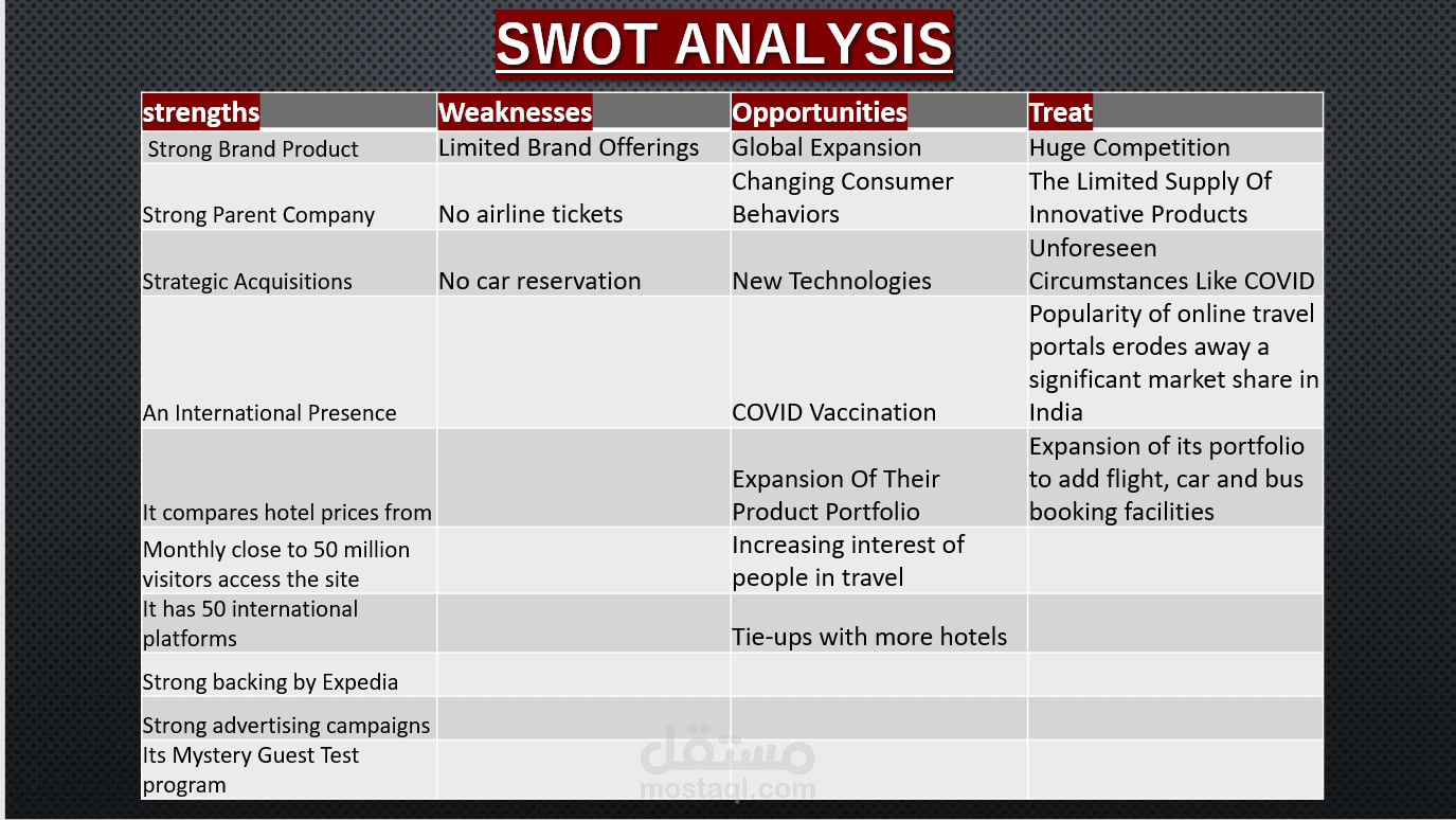 تم طلب مني عمل SWOT Analysis لتطبيق Trivago وقمت بتوضيع نقاط القوة والضعف وما هي الفرص المتاحة واكثر ما قد يهددهم