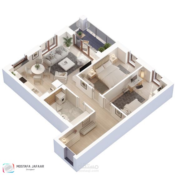 3d plan It is designed to see the distribution of furniture within the space with the appropriate materials for walls and floors