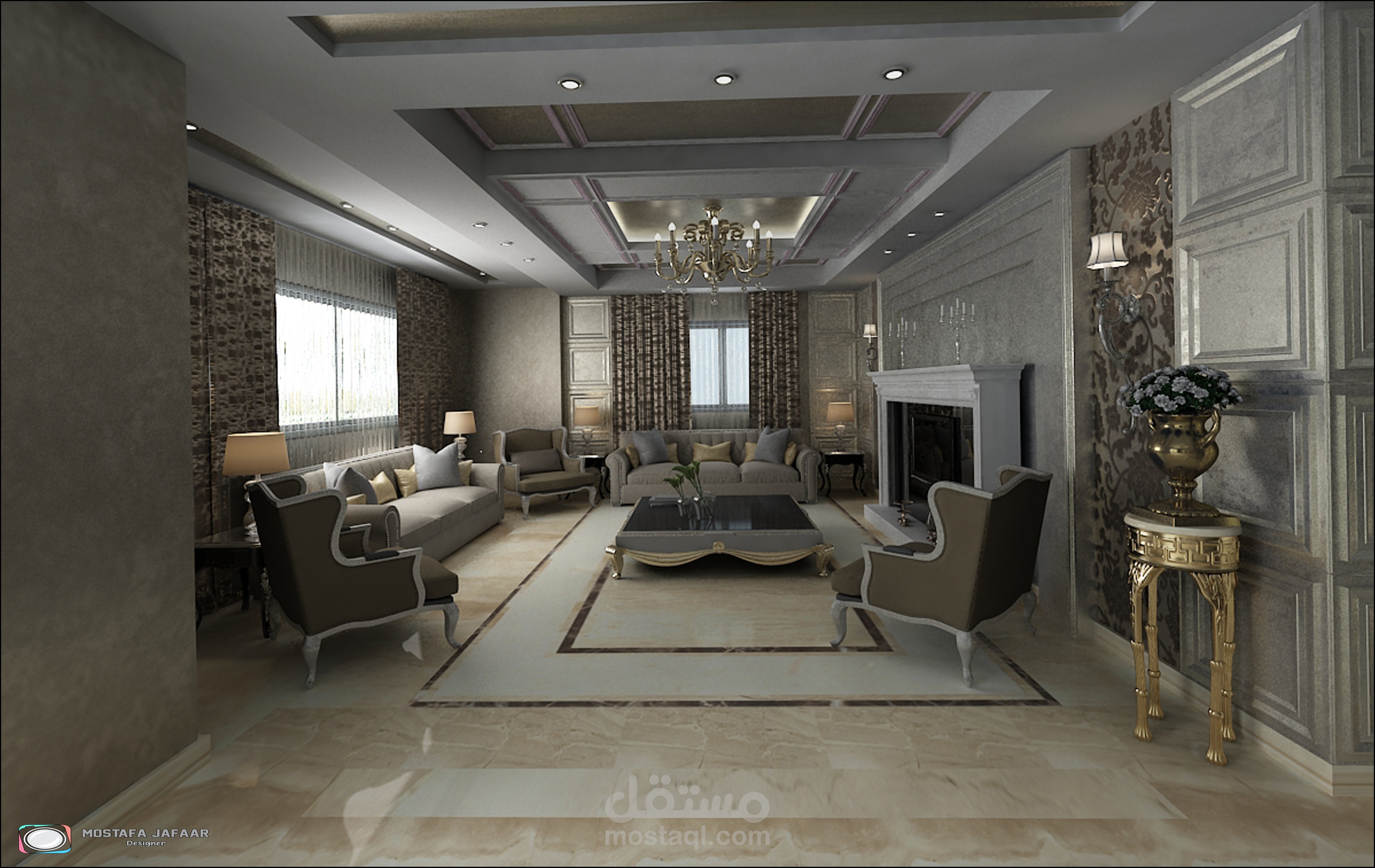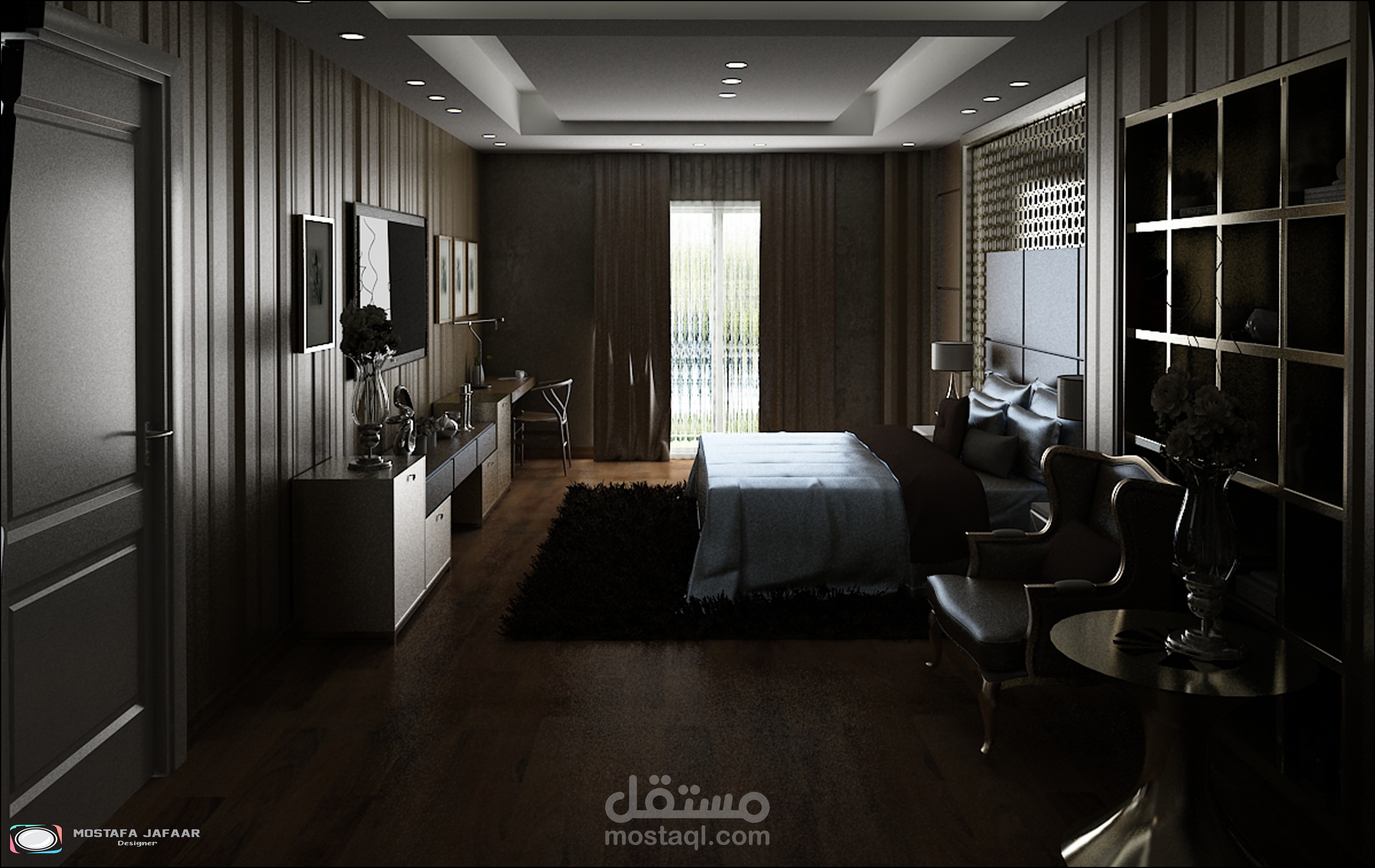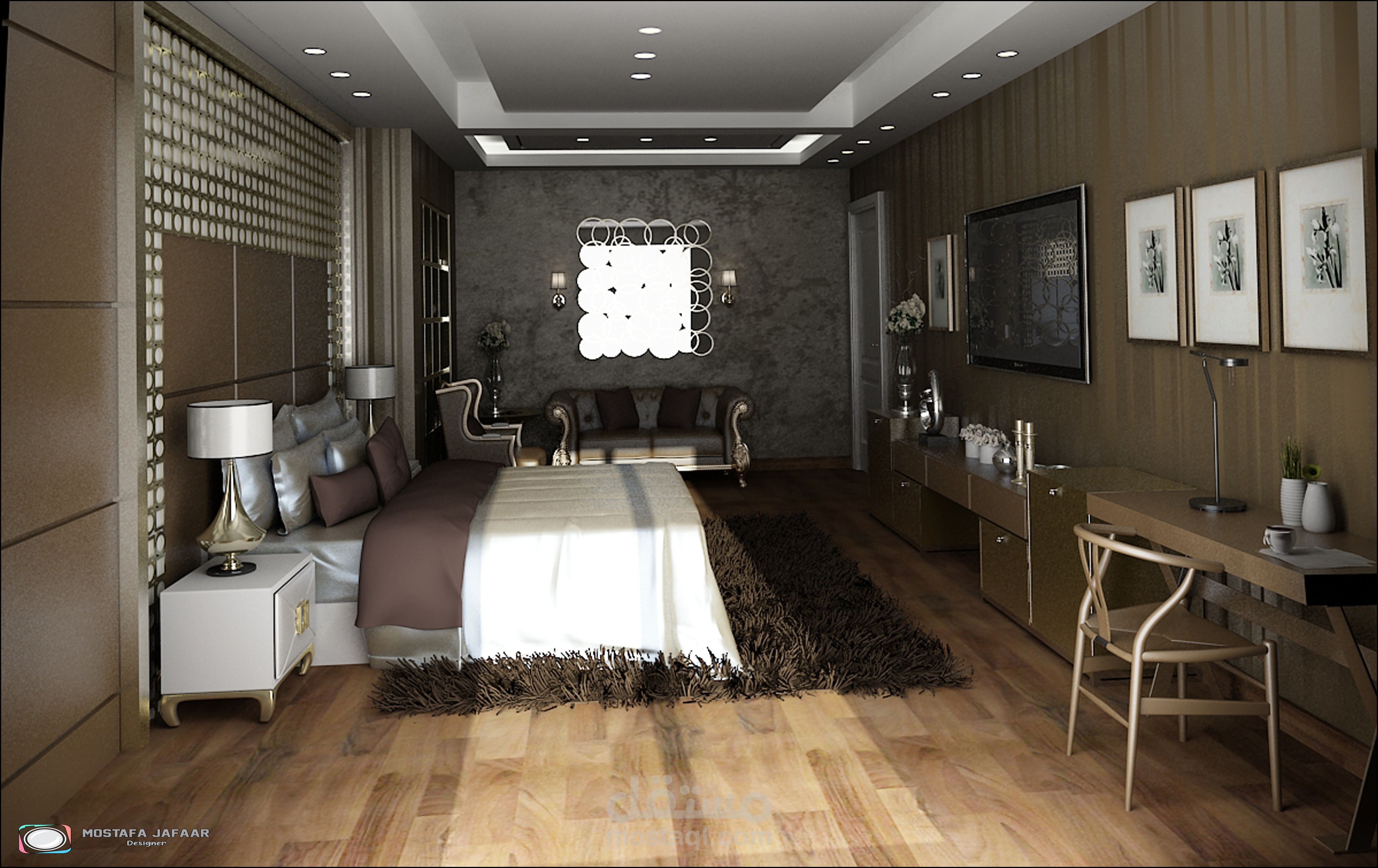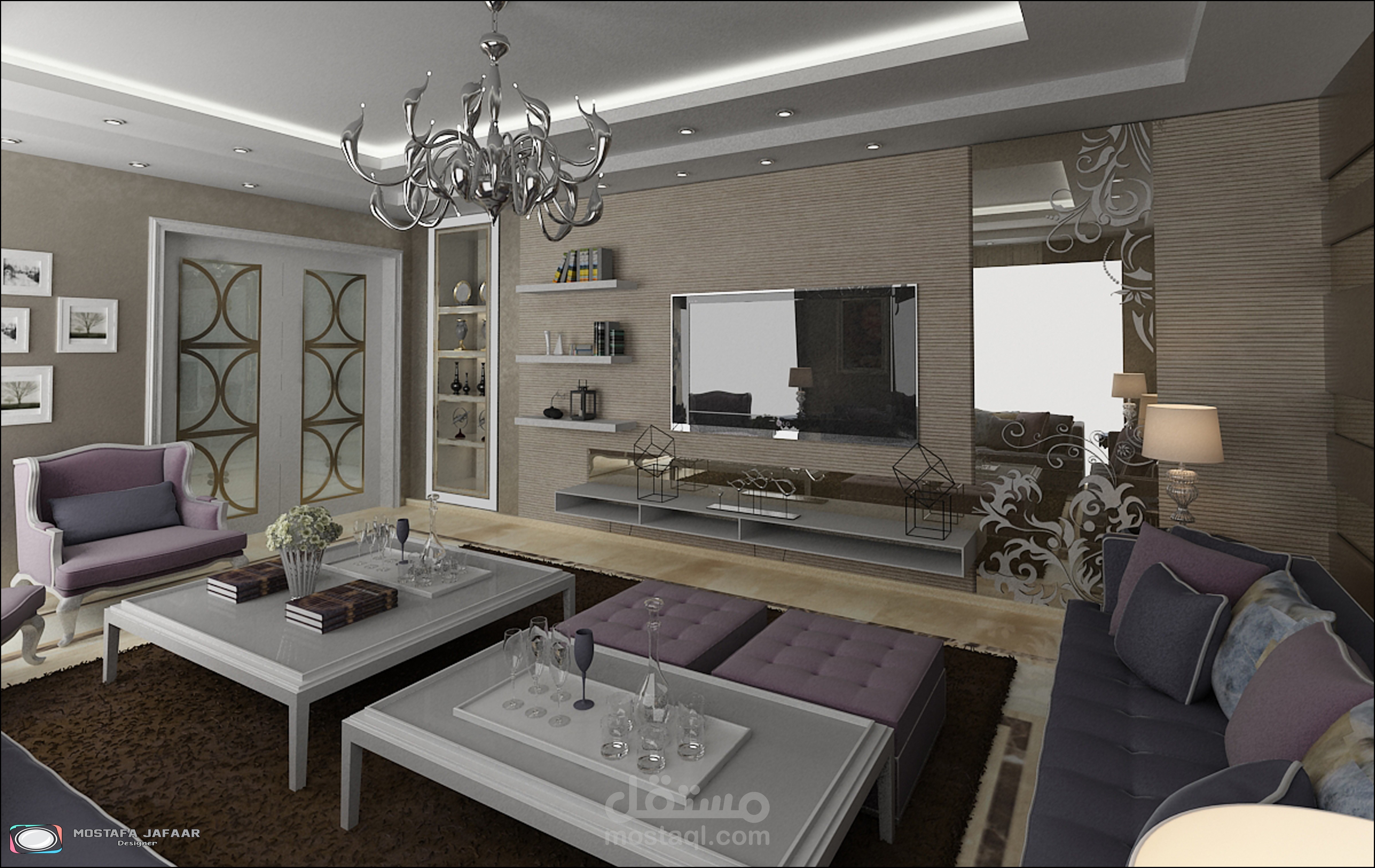" Show the Interior of an FLAT in a modern style showing the distribution of furniture and materials for walls and floors and various lighting "