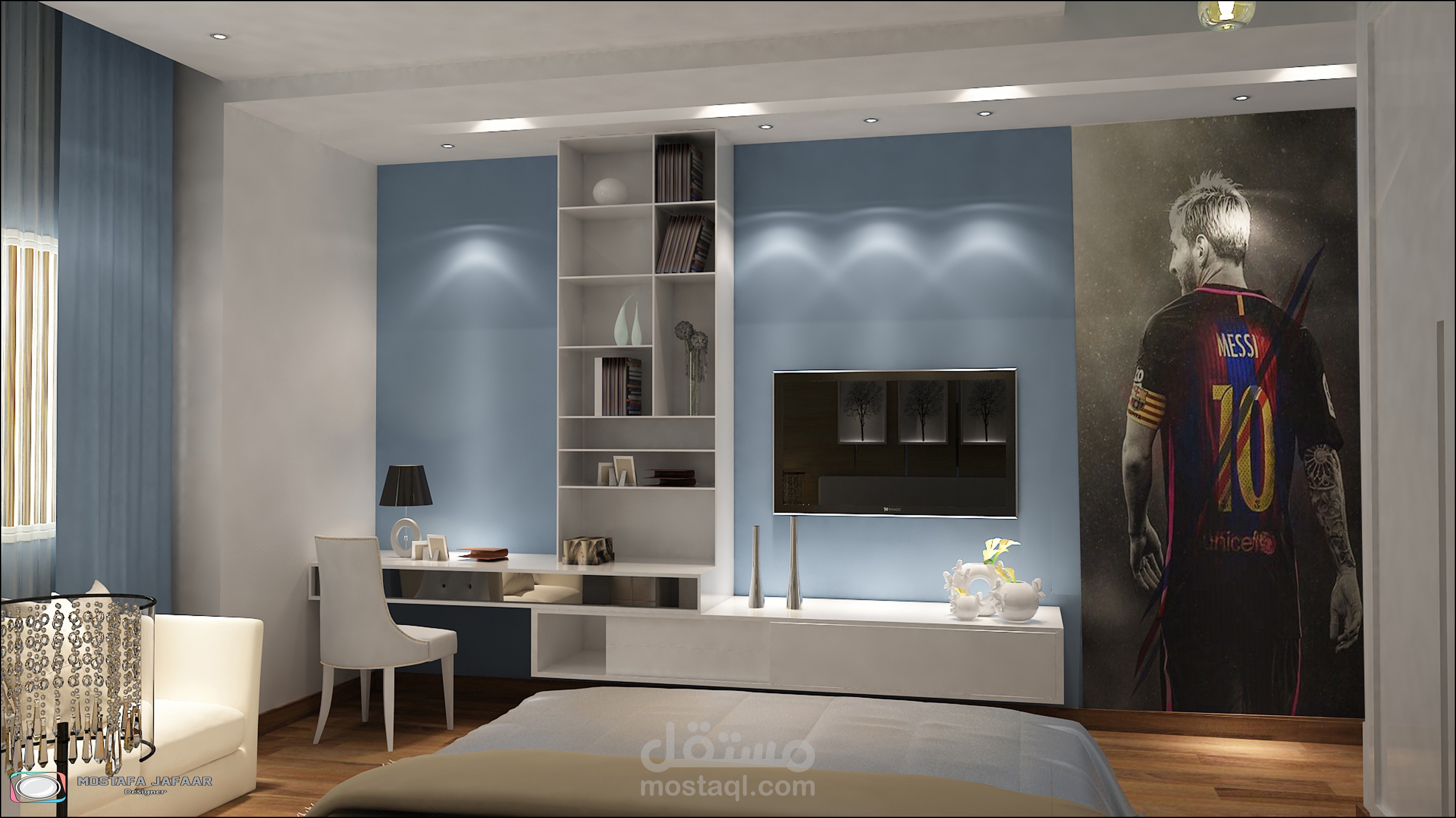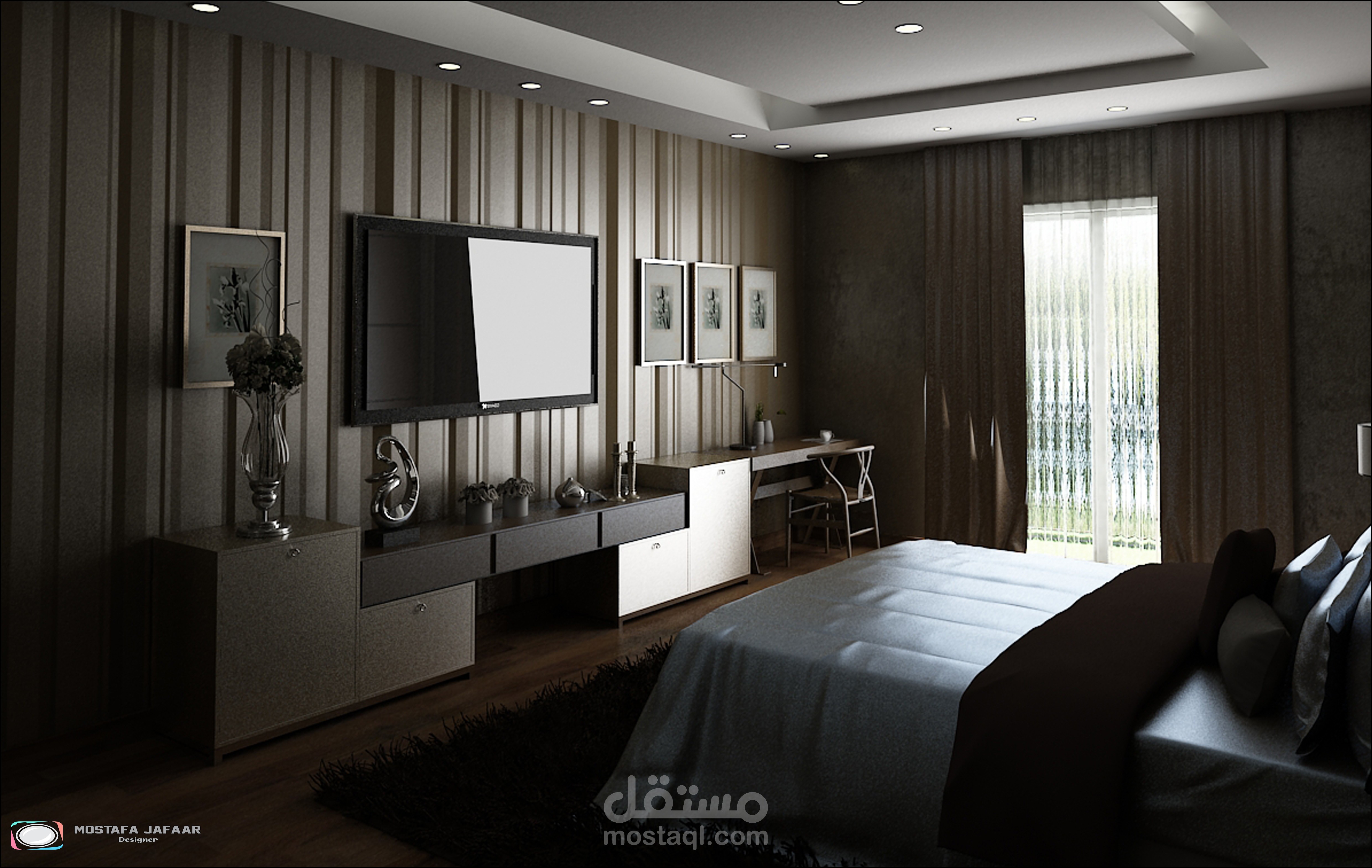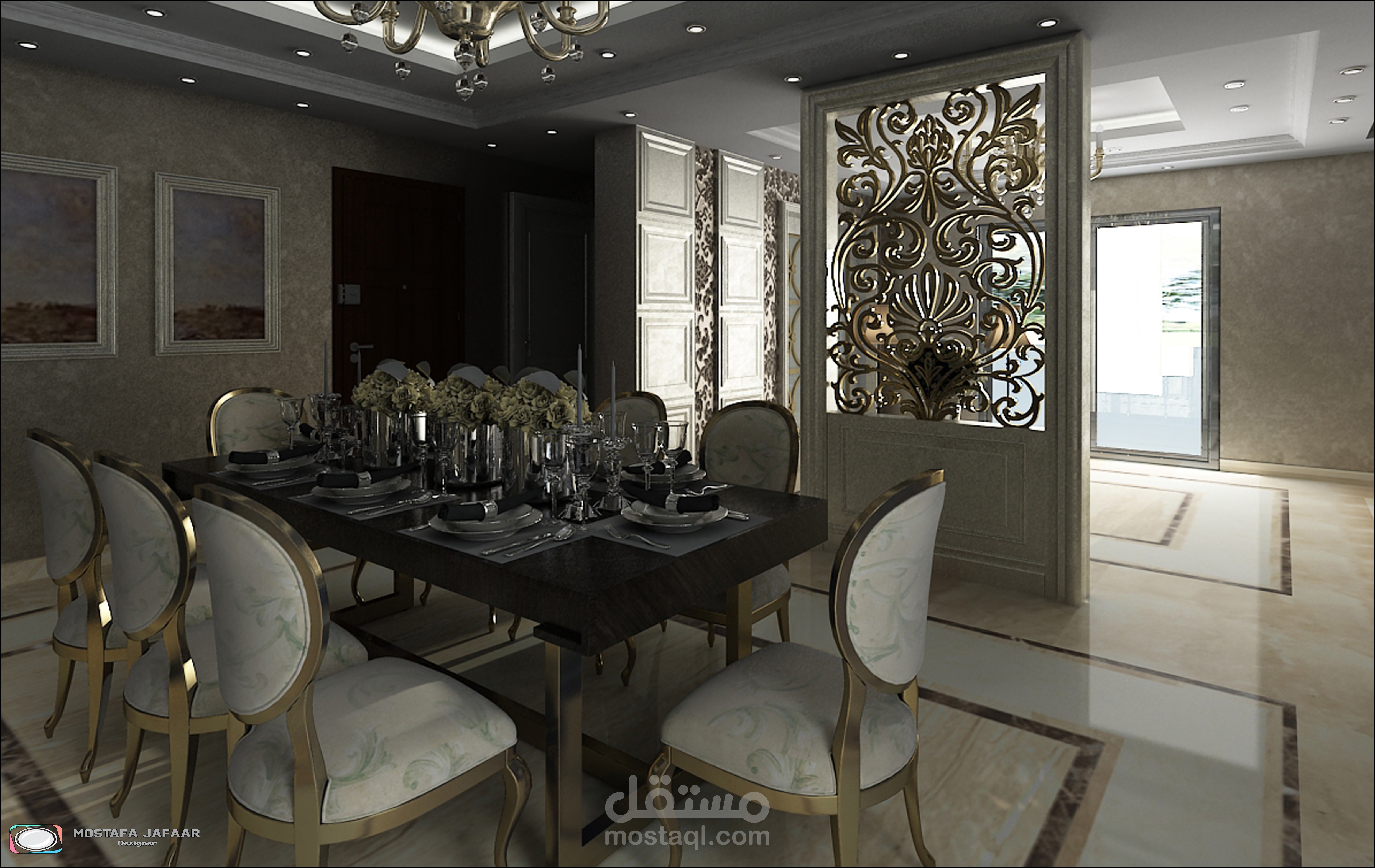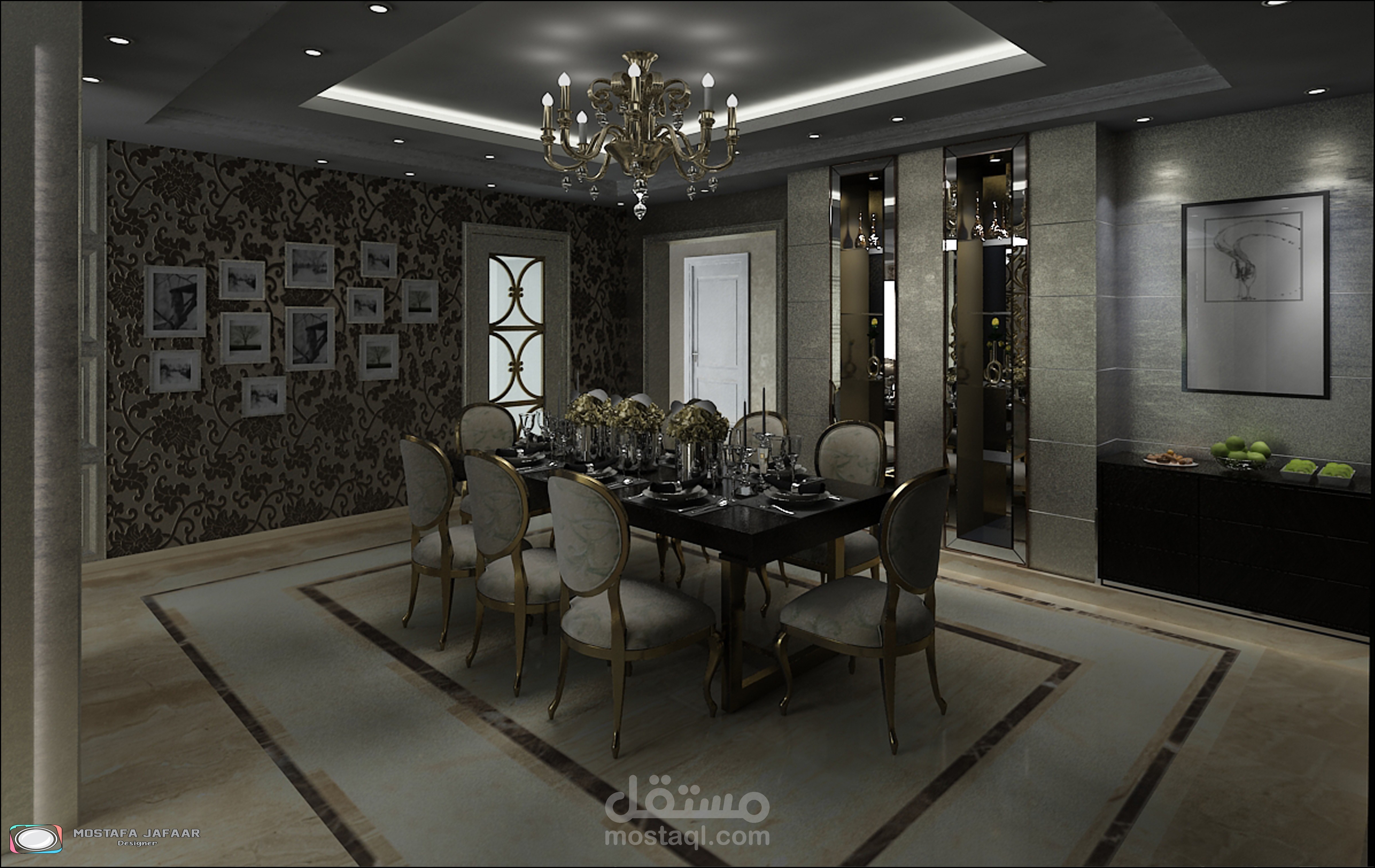 " Show the Interior of an FLAT in a modern style showing the distribution of furniture and materials for walls and floors and various lighting "