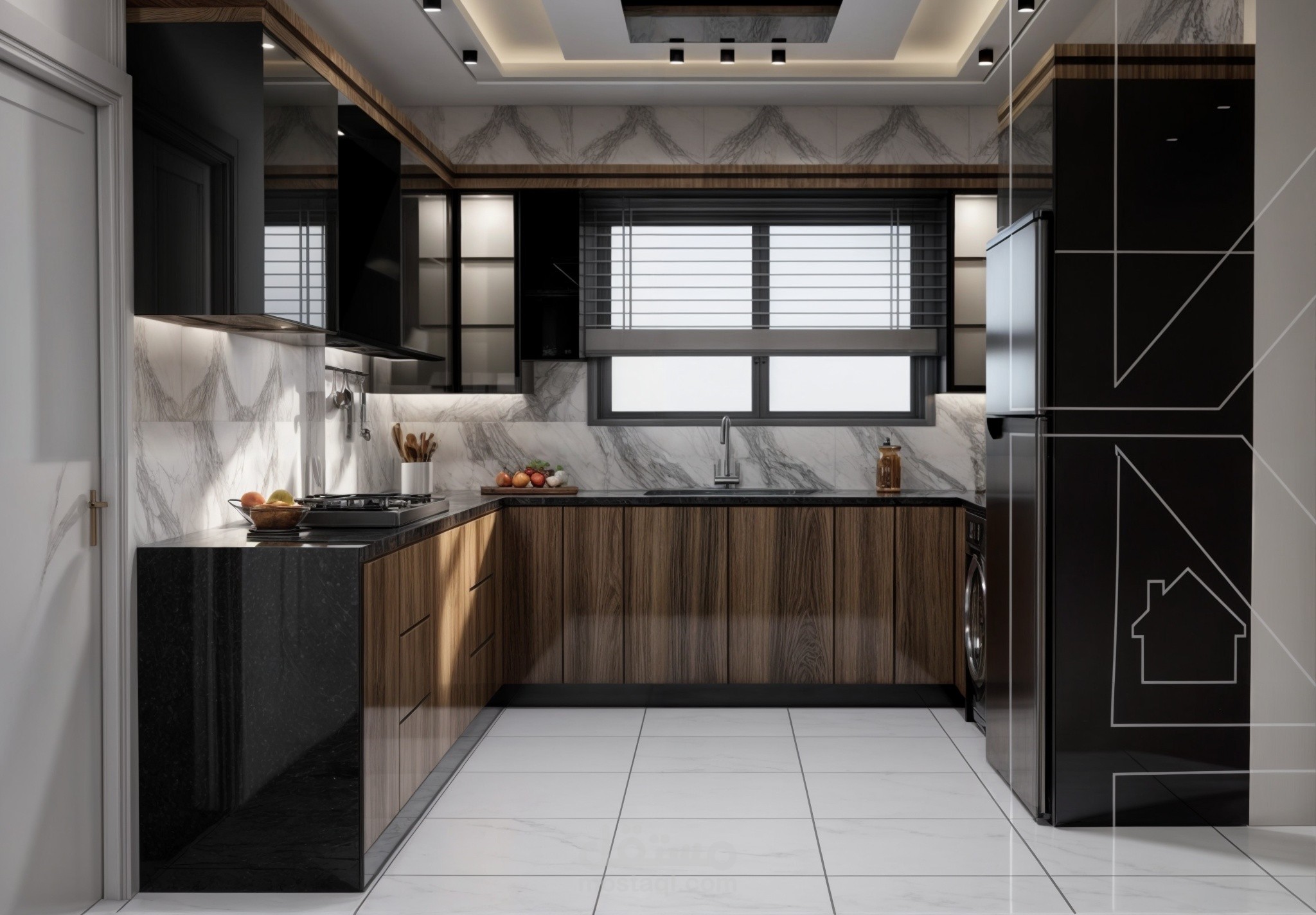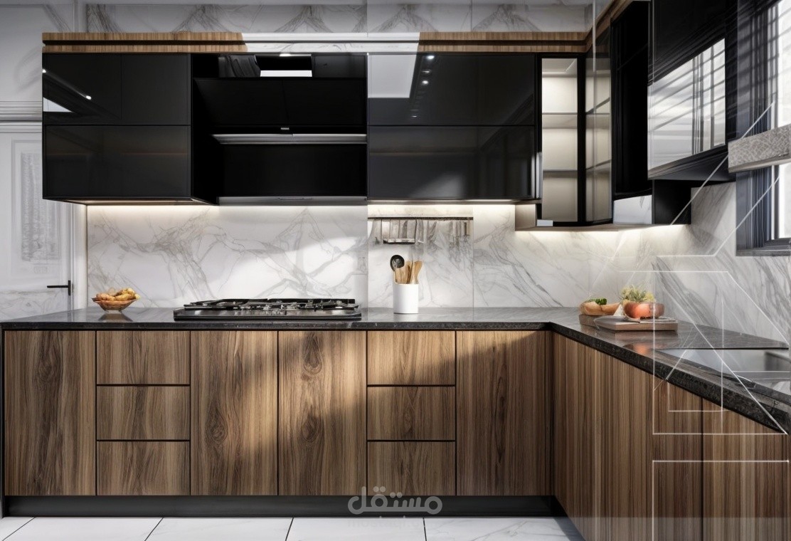 تم تنفيذ التصميم بأسلوب عصري عملي، مع توزيع على شكل حرف L لتسهيل الحركة بين مناطق العمل (منطقة الطبخ، الغسيل، والتخزين).