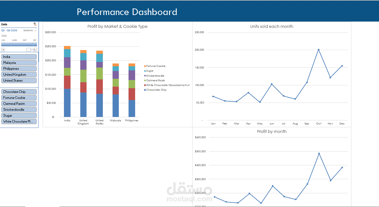 عمل لوحة معلومات تفاعلية لشركة توضح العلاقة بين الربح حسب نوع السوق والوحدات المباعة كل شهر وربح كل شهر.