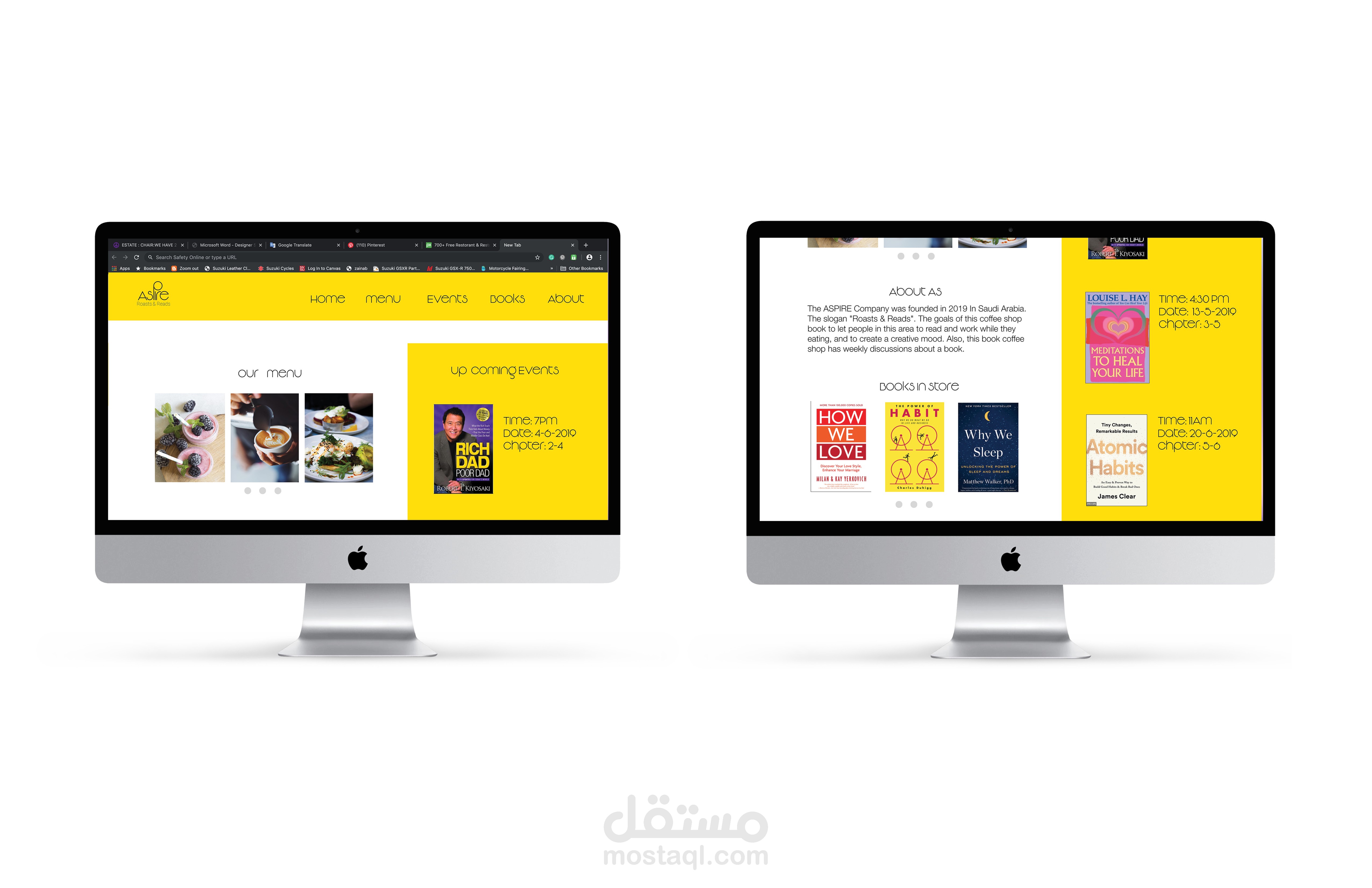The ASPIRE Company was founded in 2019 In Saudi Arabia. The slogan “Roasts & Reads”. The goals of this book coffee shop to let people in this area to read and work while they eating, and to create a creative mood.