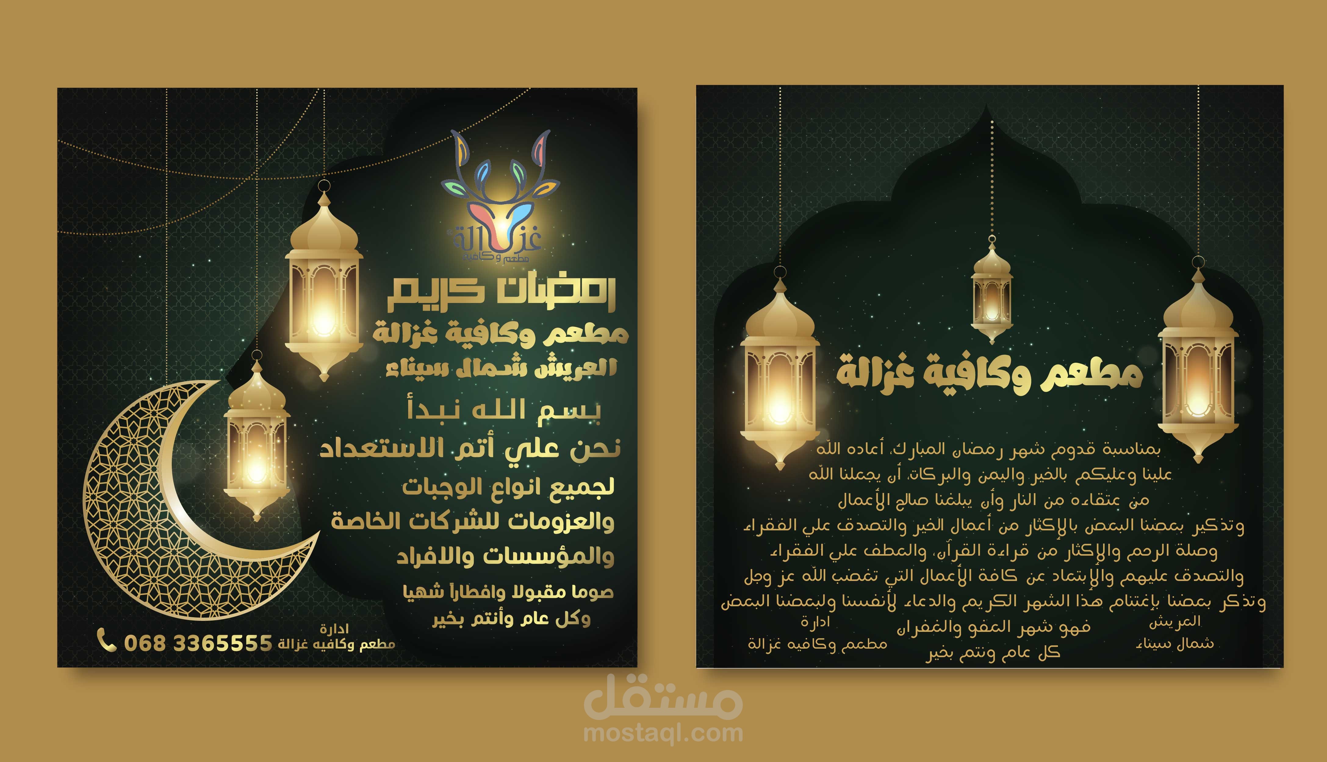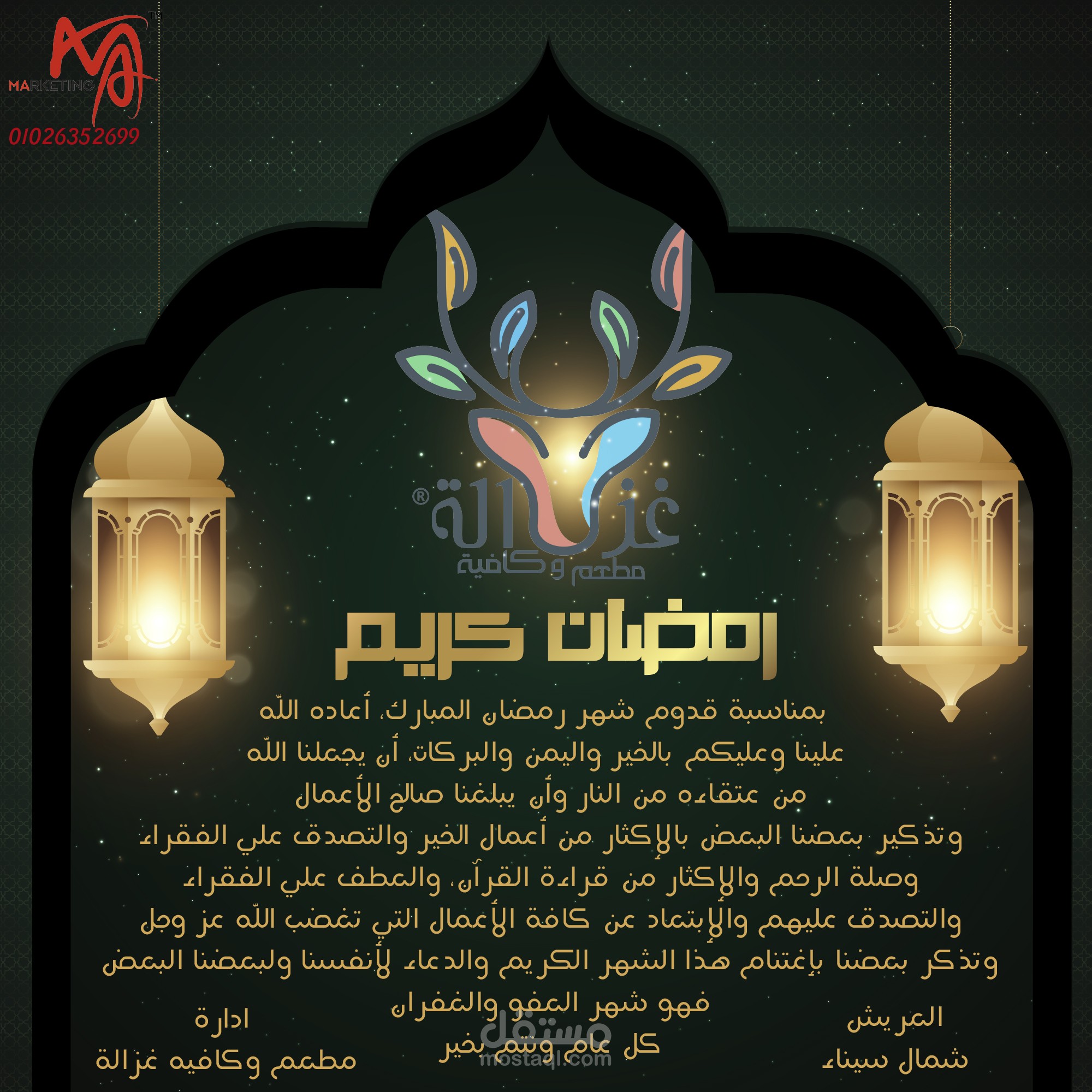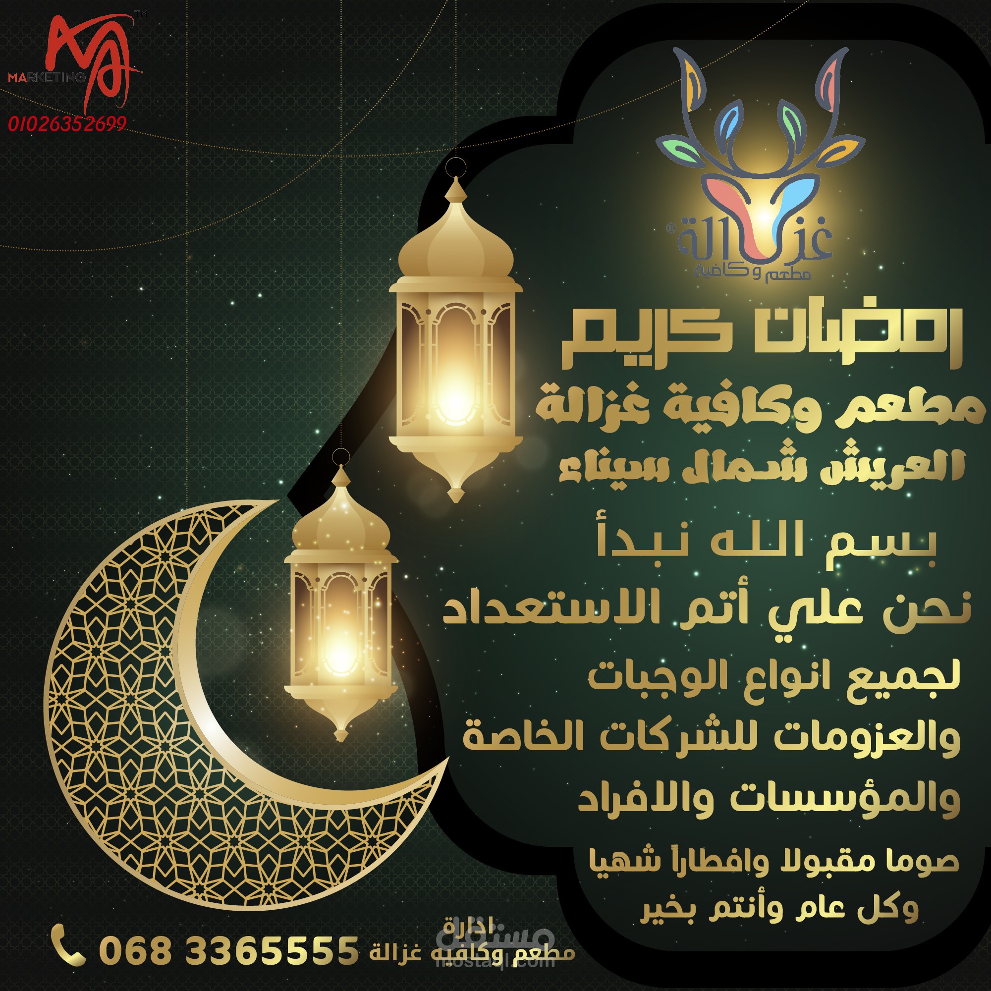 تصميم اعلان رمضان لمطعم غزالة لشهر رمضان المبارك أعاده الله علينا وعليكم بالخير واليمن والبركات