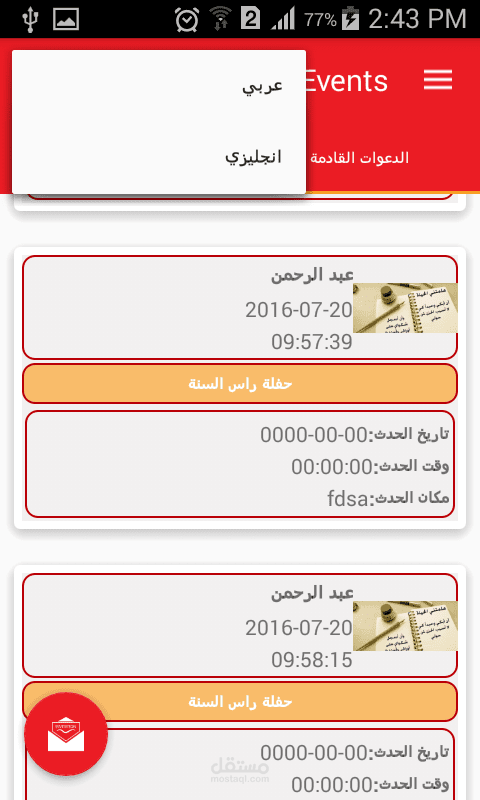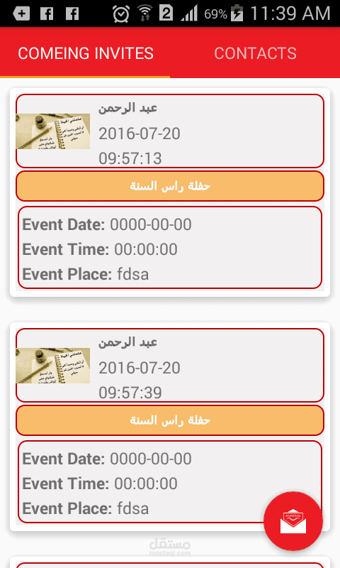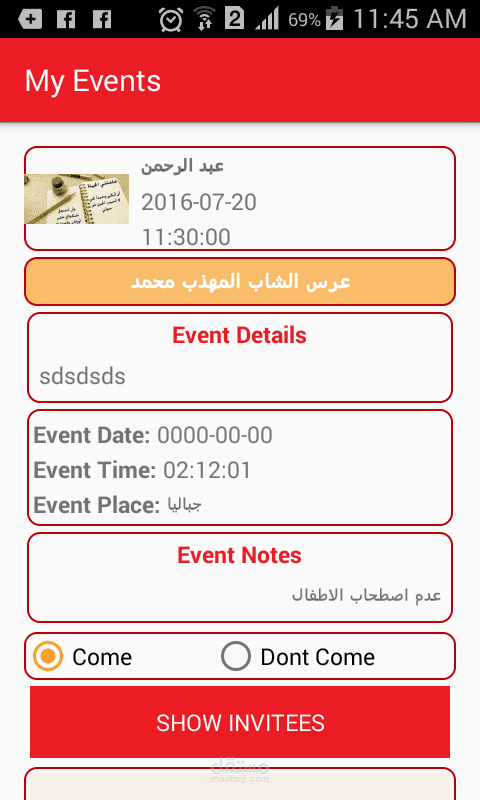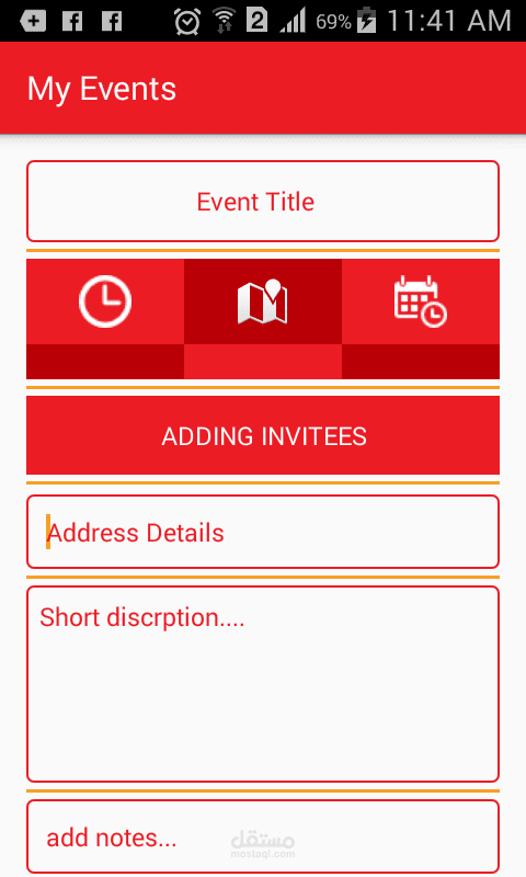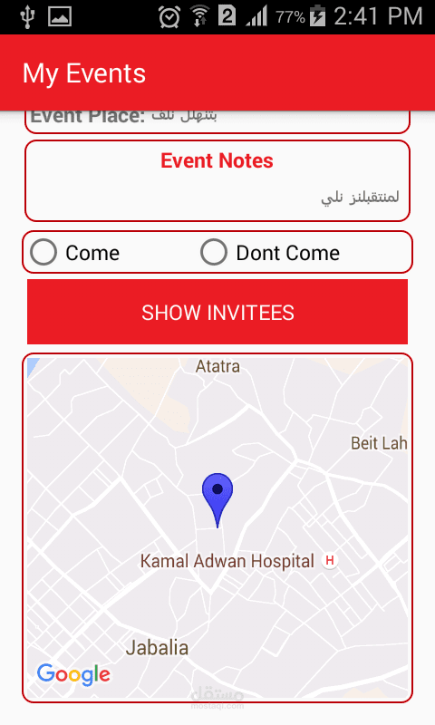 تطبيق مناسباتي يقوم بعمل دعوة للاصدقاء بالمناسباتك الخاصة حيث يقوم التطبيق بتحديد المكان باستخدام قوقل ماب ويقوم بعمل اشعارات للمستخدمين في حال وصول اي مناسبة للشخص المدعو.