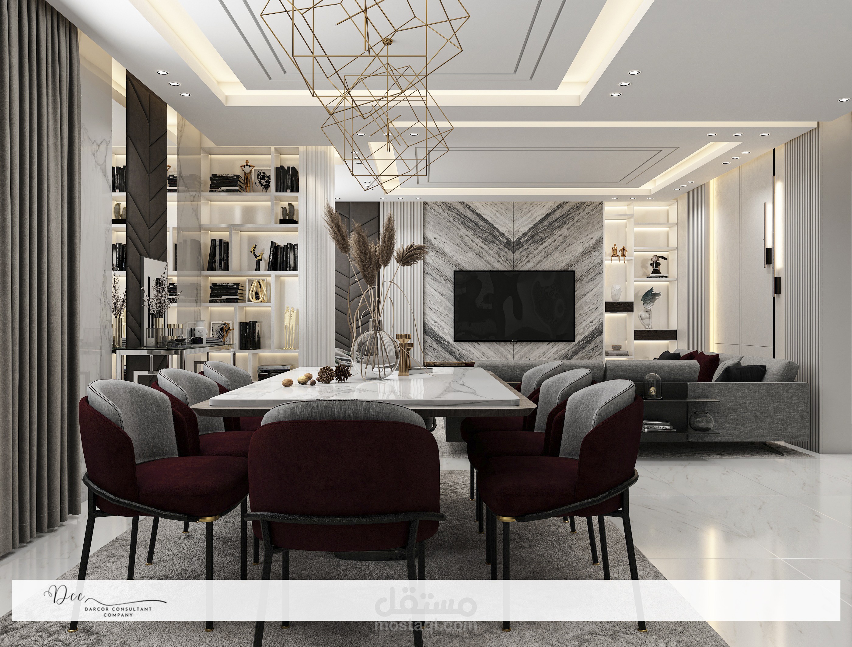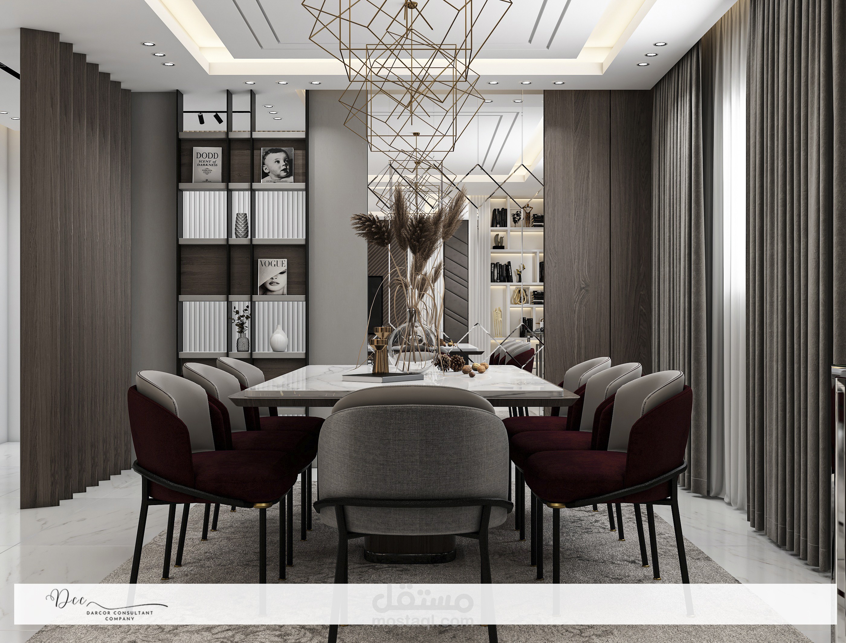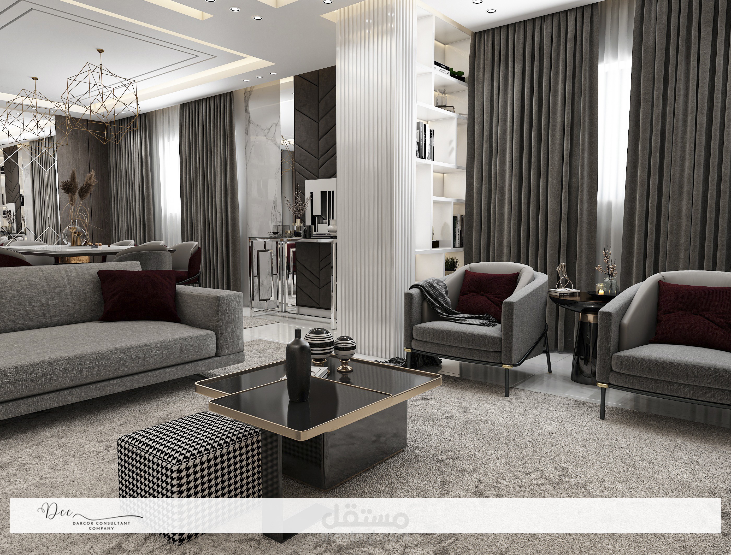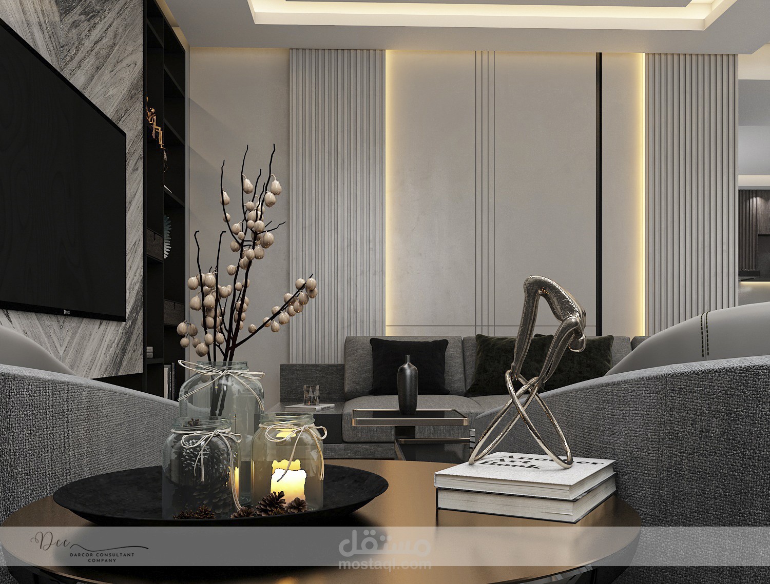 تم اعتماد الألوان بناءا على رغبة العميل حيث أنه يميل الي الألوان الحيادية وقمت بكسر الملل المتعارف عليه في الالوان الحيادية بادخال اللون الخمري واضفاء انارات مخفية دافئة