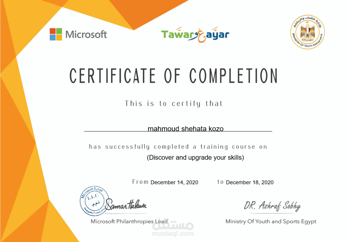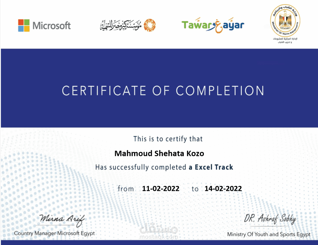 اتمام دورة تدربية من وزارة الشباب و الرياضة في الاكسيل المحاسبي و التدريب