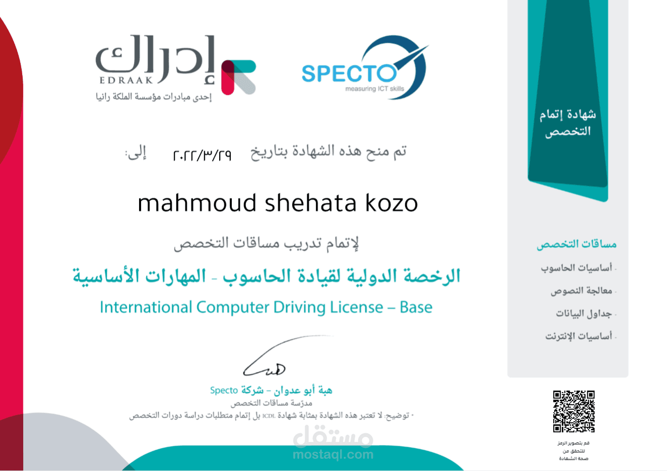الحصول علي شهادة الرخصة الدولية ICDL من ادراك