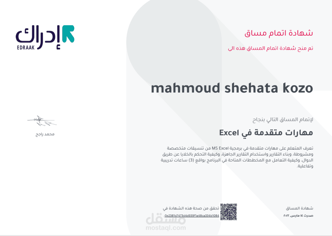 الحصول علي شهادة مهارات متقدمة في الاكسيل من ادراك